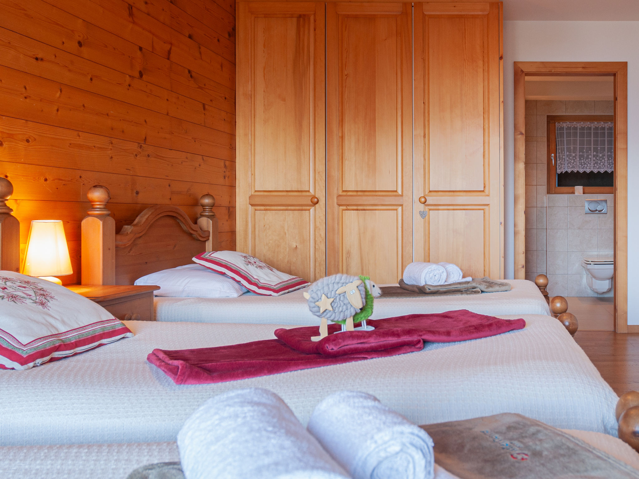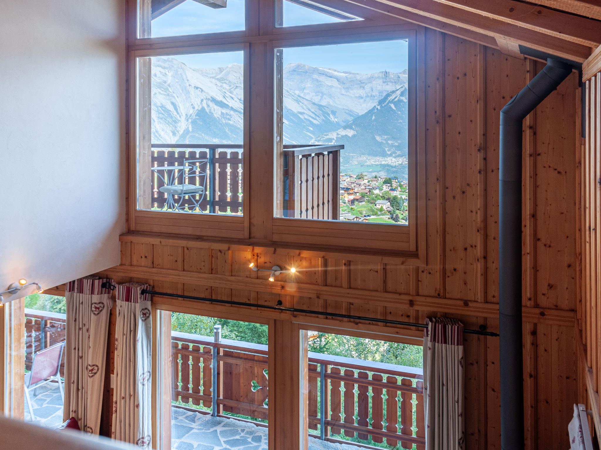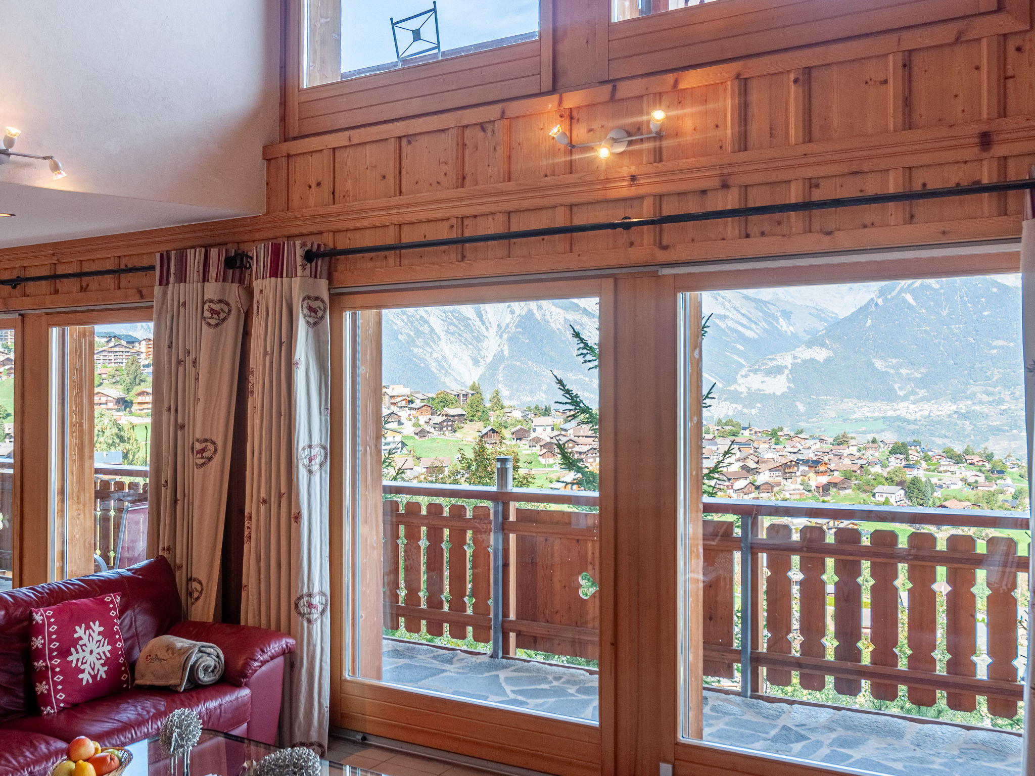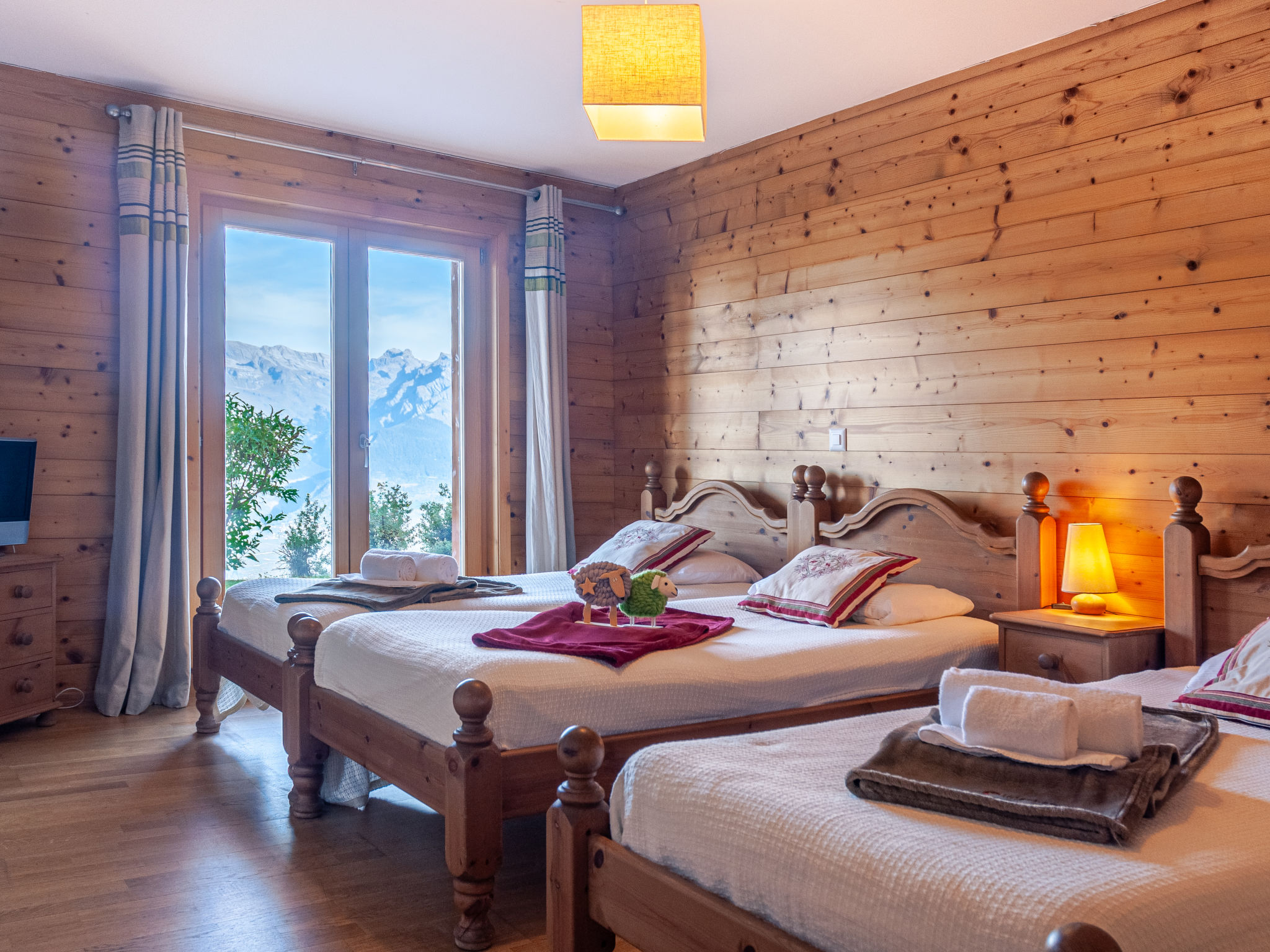 "Agneau", 5-Zimmer-Chalet 200 m2 auf 3 Stockwerken. Wohn-/Esszimmer mit Schwedenofen. Ausgang zur Terrasse. Offene Küche (Backofen, Geschirrspüler, Mikrowelle, Tiefkühler, elektrische Kaffeemaschine, Kapseln für die Kaffeemaschine (nespresso) extra, Racletteofen, Fondue Set (Käse)) mit Bar. Dusche/WC. Unteres Geschoss: 1 Zimmer mit 1 franz. Bett (140 cm, Länge 190 cm). 1 Zimmer mit 2 Betten (90 cm, Länge 200 cm). 1 Zimmer mit 3 Betten (90 cm, Länge 200 cm), Dusche/WC und TV. Bad/Dusche/WC. Obergeschoss: Galerie mit Kabel-TV und DVD. 1 grosses Zimmer mit 1 franz. Bett (160 cm, Länge 190 cm), Bad/WC. 2 Balkone, Nordlage Terrasse 50 m2, Westlage. Terrassenmöbel, Gartengrill (mobil). Panoramasicht auf die Berge. Zur Verfügung: Waschmaschine, Wäschetrockner, Kinderhochstuhl, Babybett, Haartrockner. Internet (Wireless LAN, gratis). Garage (2 Autos) in 50 m, Höhe 230 cm, Breite 240 cm. Bitte beachten: Nichtraucher-Unterkunft. 1 Haustier/Hund erlaubt.