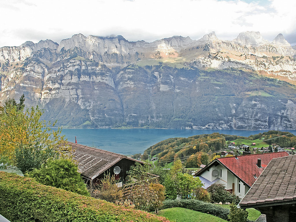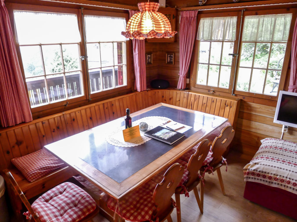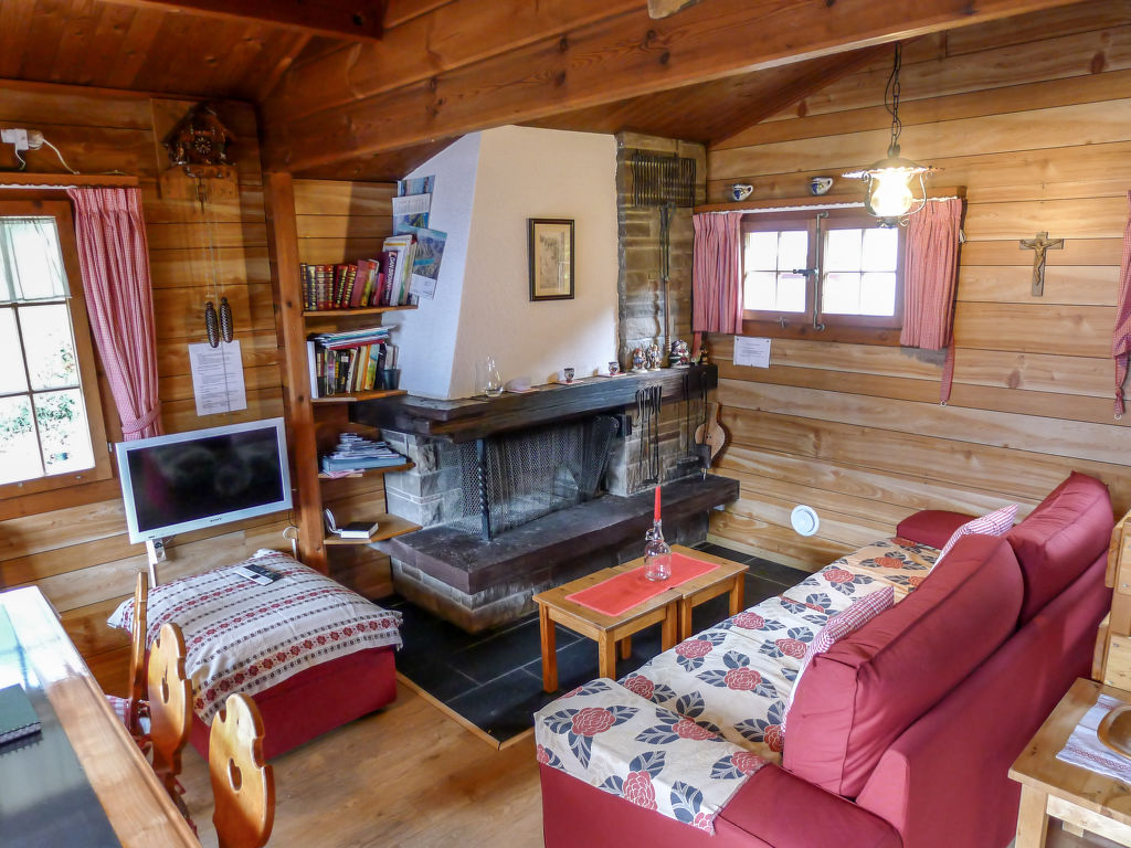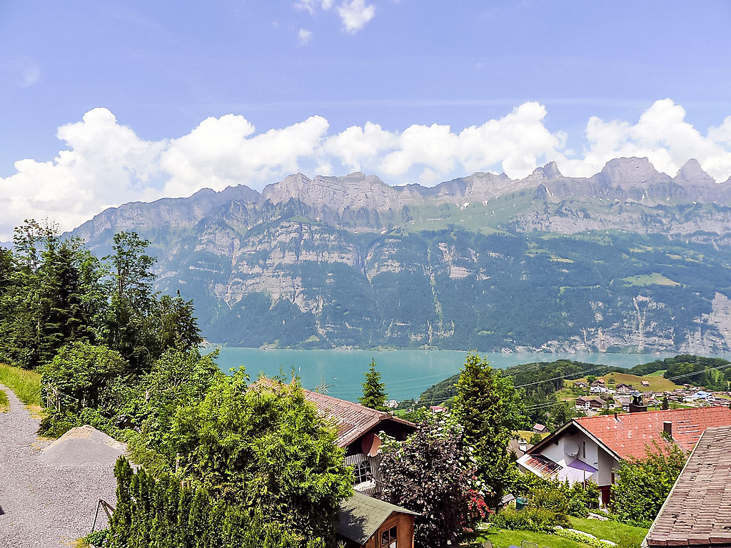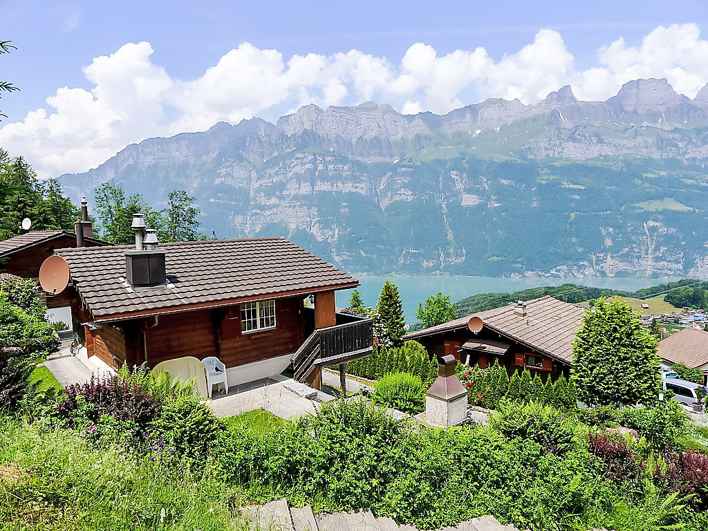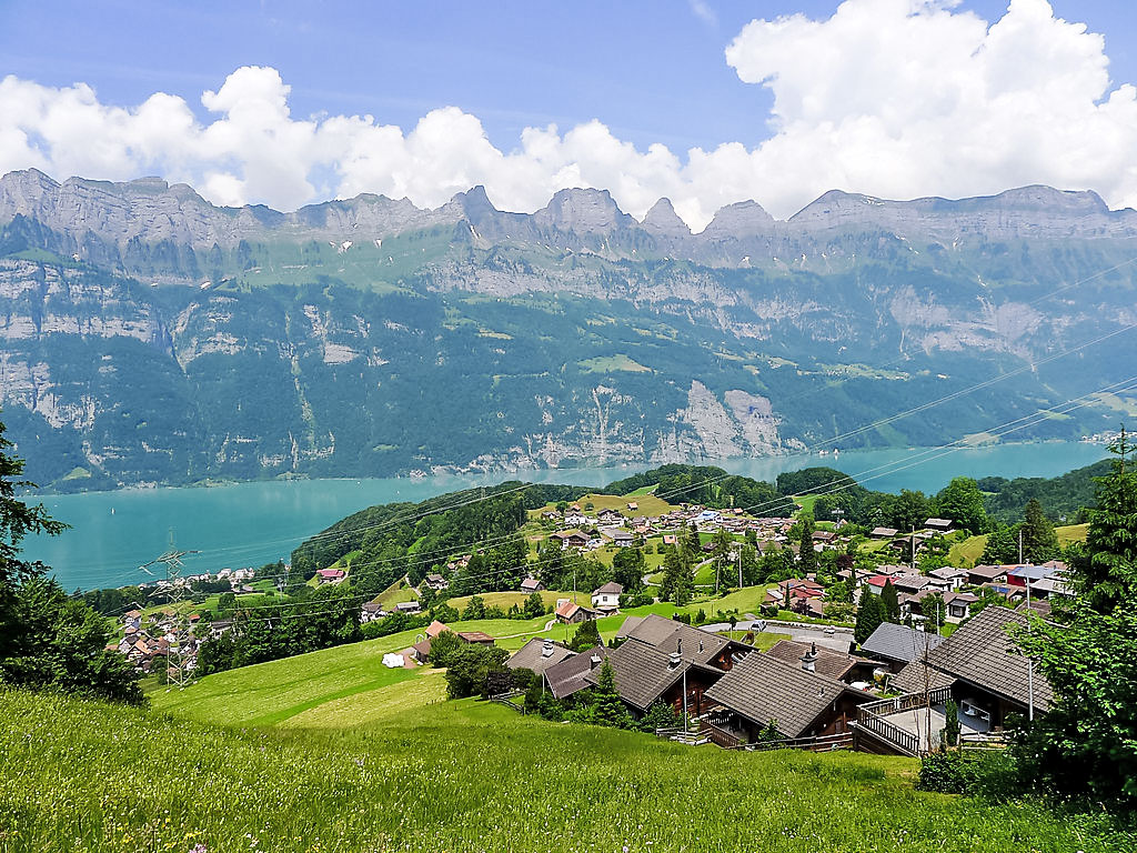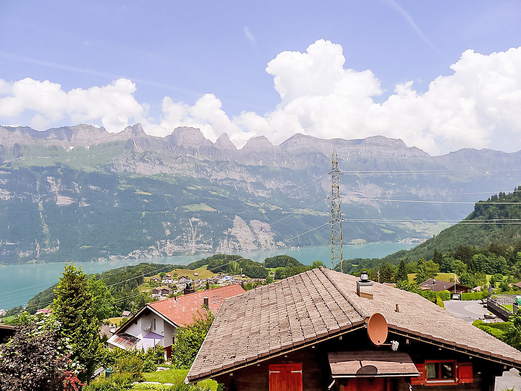 3-Zimmer-Chalet 65 m2 auf 2 Stockwerken. Zweckmässig und gemütlich eingerichtet: Wohn-/Esszimmer mit offenem Kamin und Sat-TV (Flachbildschirm), Radio. Ausgang zum Balkon. 1 kleines Zimmer mit 1 franz. Bett (140 cm). Kleine Küche (3 Kochplatten, Backofen). Sep. WC. Unteres Geschoss: (Leiter) 1 kleines Zimmer mit 1 x 2 Etagenbetten. Bad/WC. Balkon, Terrasse, Gartensitzplatz. Terrassenmöbel, Gartengrill, Abstellkammer. Sehr schöne Sicht auf den See und die Berge. Zur Verfügung: Waschmaschine, Holz (gratis). Internet (Wireless LAN, gratis). Parkplatz (2 Autos), Garage Nr. 6. Bitte beachten: Nichtraucher-Unterkunft. Zugang zum Obergeschoss über steile Leiter oder über die Aussentreppe.