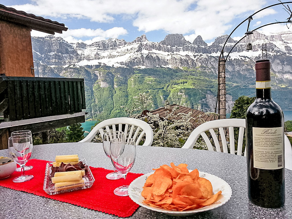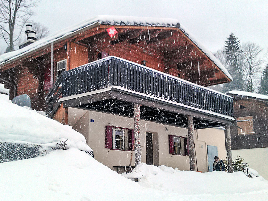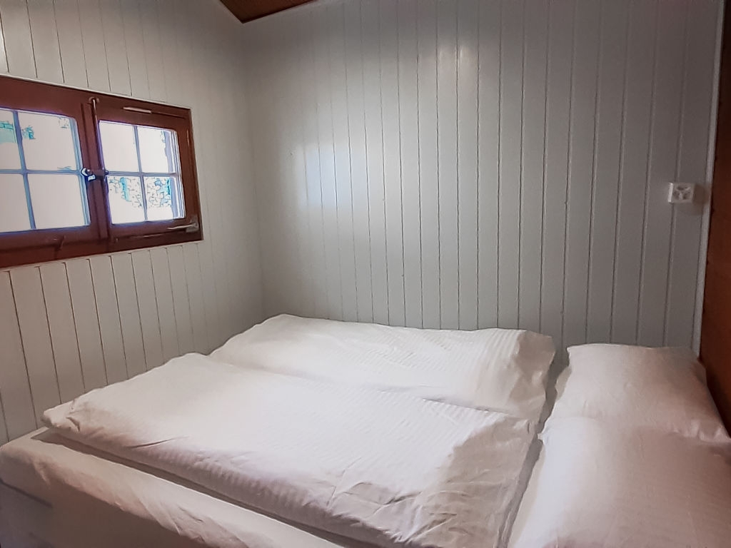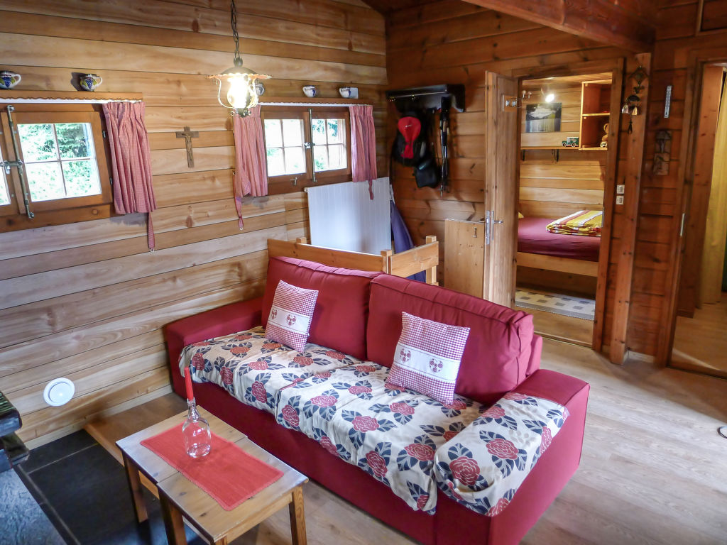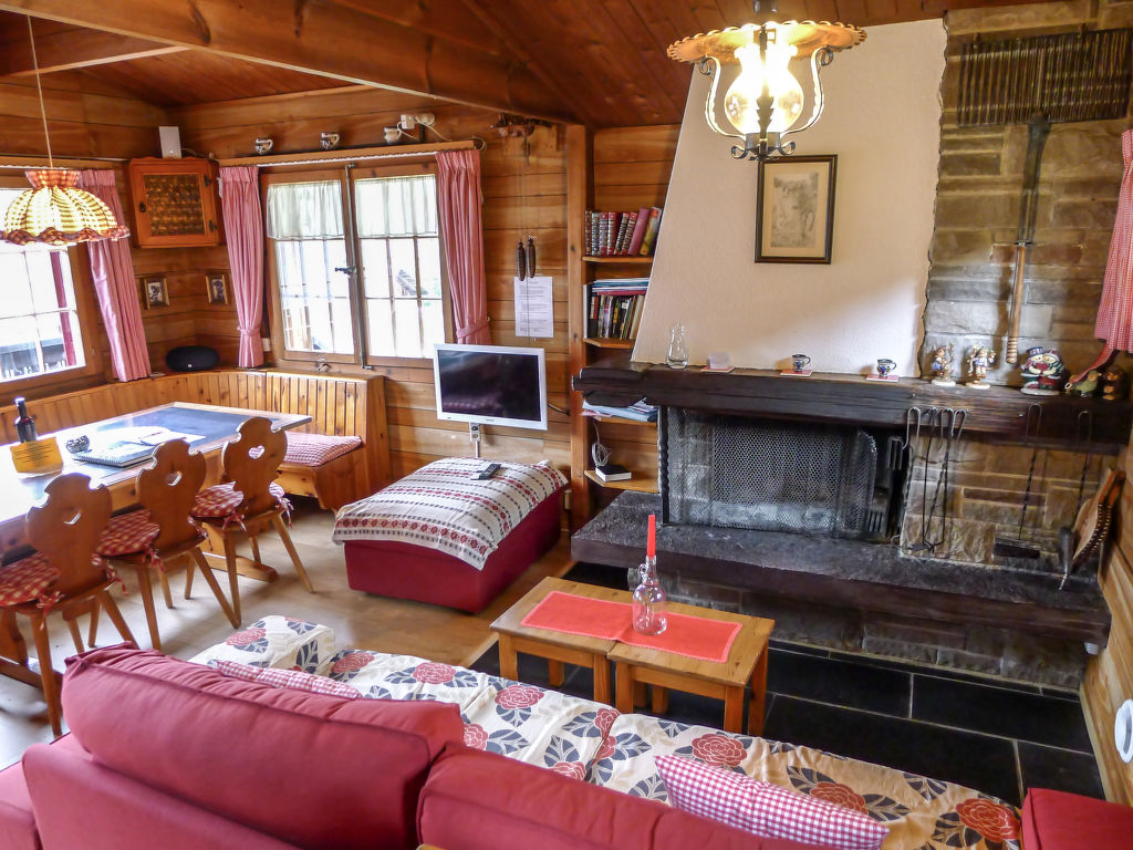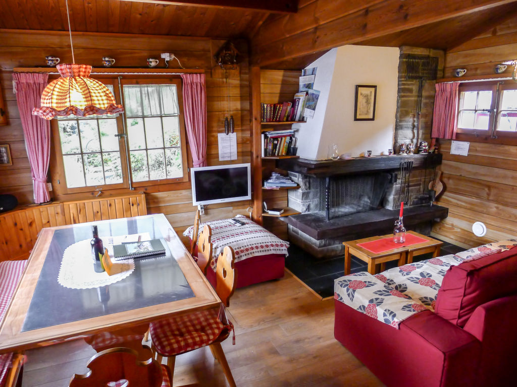 3-Zimmer-Chalet 65 m2 auf 2 Stockwerken. Zweckmässig und gemütlich eingerichtet: Wohn-/Esszimmer mit offenem Kamin und Sat-TV (Flachbildschirm), Radio. Ausgang zum Balkon. 1 kleines Zimmer mit 1 franz. Bett (140 cm). Kleine Küche (3 Kochplatten, Backofen). Sep. WC. Unteres Geschoss: (Leiter) 1 kleines Zimmer mit 1 x 2 Etagenbetten. Bad/WC. Balkon, Terrasse, Gartensitzplatz. Terrassenmöbel, Gartengrill, Abstellkammer. Sehr schöne Sicht auf den See und die Berge. Zur Verfügung: Waschmaschine, Holz (gratis). Internet (Wireless LAN, gratis). Parkplatz (2 Autos), Garage Nr. 6. Bitte beachten: Nichtraucher-Unterkunft. Zugang zum Obergeschoss über steile Leiter oder über die Aussentreppe.