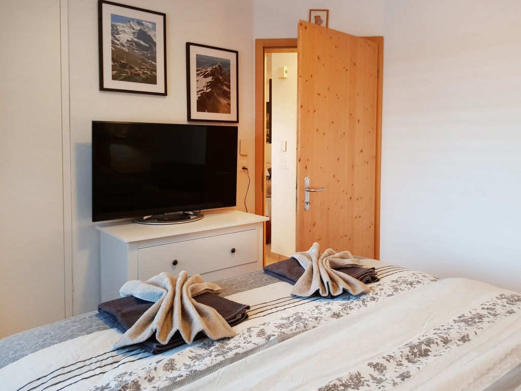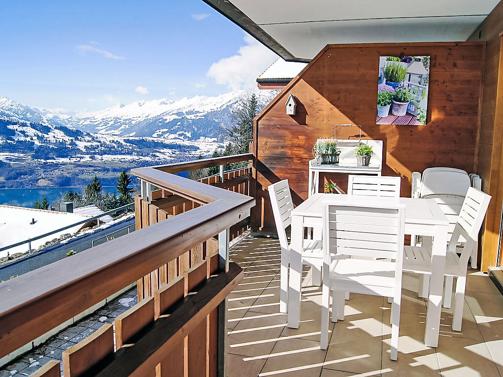 "Mountain Lake Panorama", 2-Zimmer-Wohnung 53 m2 im 1. Stock, Südostlage. Hell, komfortabel und geschmackvoll eingerichtet: Wohn-/Esszimmer 32 m2 mit Panoramafenster mit 1 Bett (80 cm, Länge 200 cm), Esstisch, Kabel-TV, Digital-TV, Flachbildschirm, Radio und CD. Ausgang zum Balkon. 1 Doppelzimmer 12 m2 mit 1 franz. Bett (1 x 160 cm, Länge 200 cm), TV. Offene Küche (Backofen, Geschirrspüler, 4 Glaskeramikherd Platten, Mikrowelle, elektrische Kaffeemaschine, Kapseln für die Kaffeemaschine (Senseo) extra, Fondue Set (Käse)). Dusche/WC. Grosser Balkon 16 m2. Balkonmöbel. Herrliche Panoramasicht auf den See, die Berge und das Tal. Zur Verfügung: Haartrockner. Internet (Wireless LAN, gratis). Parkplatz. Bitte beachten: Nichtraucher-Unterkunft. Rauchmelder, Feuerlöscher.