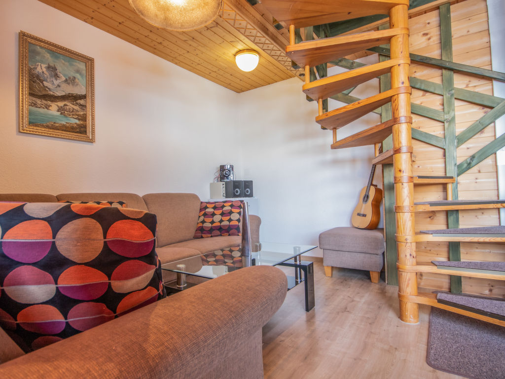 " Edwin", 3-Zimmer-Maisonette-Wohnung 55 m2 im 2. Stock. Objekt geeignet für 5 Erwachsene. Teilweise abgeschrägt, mit viel Holz eingerichtet: Eingang. Wohn-/Esszimmer mit Esstisch und Sat-TV (Flachbildschirm). Ausgang zum Balkon. Kleine Küche (Backofen, 4 Glaskeramikherd Platten, elektrische Kaffeemaschine). Dusche/WC. Obergeschoss: (Wendeltreppe) offenes Wohn-/Schlafzimmer mit 3 Betten. 1 Doppelzimmer. Kleiner Balkon 4 m2. Balkonmöbel. Sicht auf die Berge und das Tal. Zur Verfügung: Safe, Babybett bis 2 Jahre. Internet (Wireless LAN, gratis). Parkplatz (2 Autos). Bitte beachten: geeignet für Familien. Nichtraucher-Unterkunft. 2 Haustiere/Hunde erlaubt. Feuerlöscher, kein Fahrstuhl.