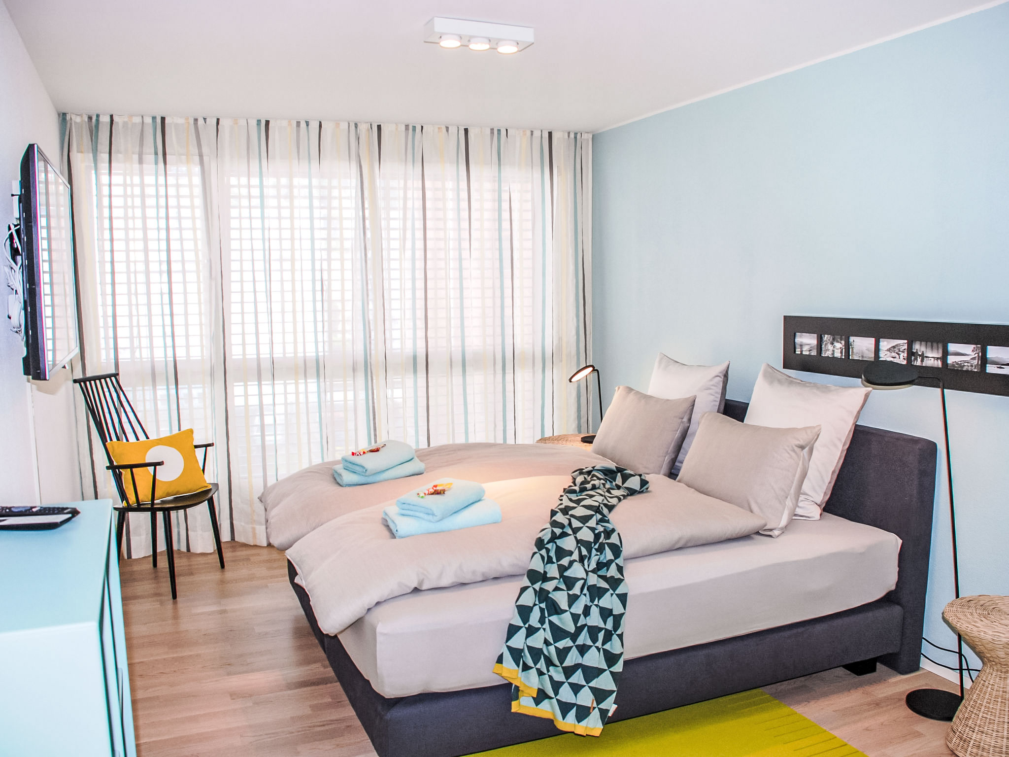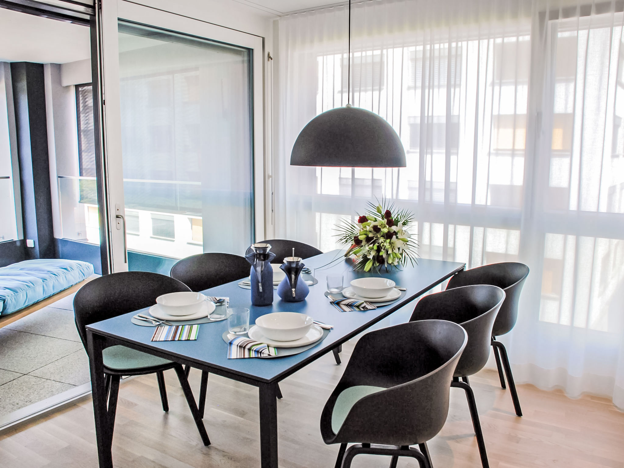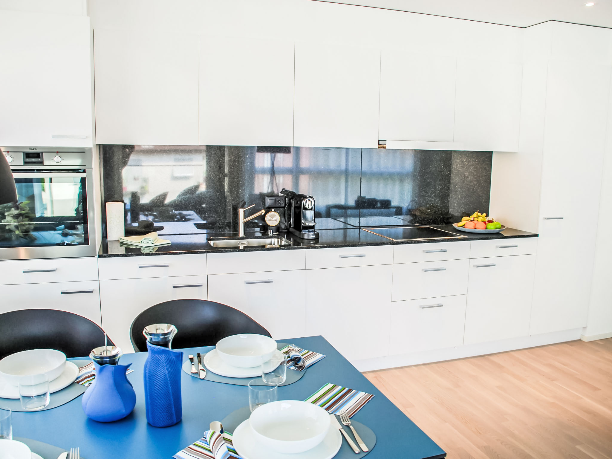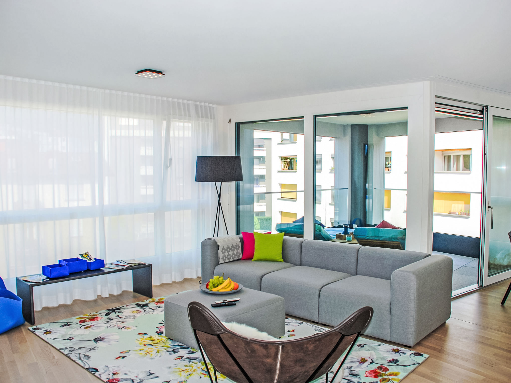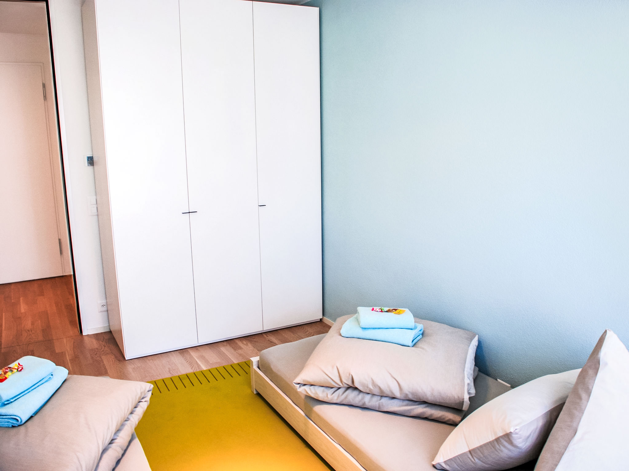 "LaVille B-1-2", 4-Zimmer-Wohnung 99 m2 im 1. Stock. Objekt geeignet für 4 Erwachsene + 2 Kinder. Geräumig und hell, luxuriös und stilvoll eingerichtet: offenes grosses Wohn-/Esszimmer mit Sat-TV und Flachbildschirm. 1 Doppelzimmer mit 1 Doppelbett (1 x 160 cm, Länge 200 cm). 2 Zimmer, jedes Zimmer mit 2 Betten (90 cm, Länge 200 cm). Offene Küche (Backofen, Geschirrspüler, 4 Induktionskochplatten, Tiefkühler, elektrische Kaffeemaschine, Kapseln für die Kaffeemaschine (Nespresso) extra) mit Esstisch. Ausgang zum Balkon. Bad/WC, Dusche/WC. Bodenheizung. Balkon 11 m2. Balkonmöbel, Liegestühle (1). Sicht auf die Landschaft. Zur Verfügung: Waschmaschine, Wäschetrockner, Bügeleisen, Kinderhochstuhl, Babybett bis 2 Jahre (extra), Haartrockner. Internet (Wireless LAN, gratis). Parkplatz Nr. 55, Höhe 210 cm, Breite 230 cm. Bitte beachten: geeignet für Familien. Nichtraucher-Unterkunft.
