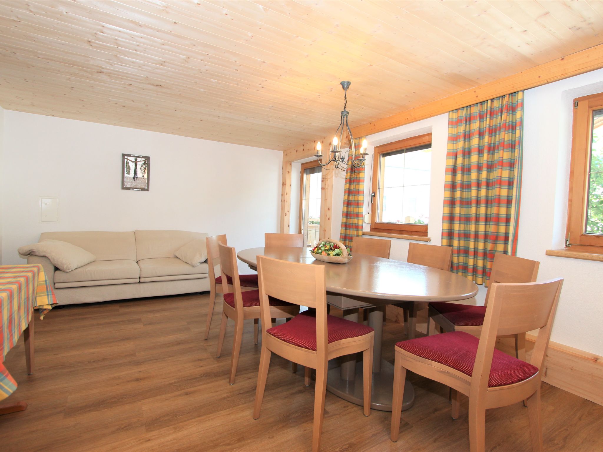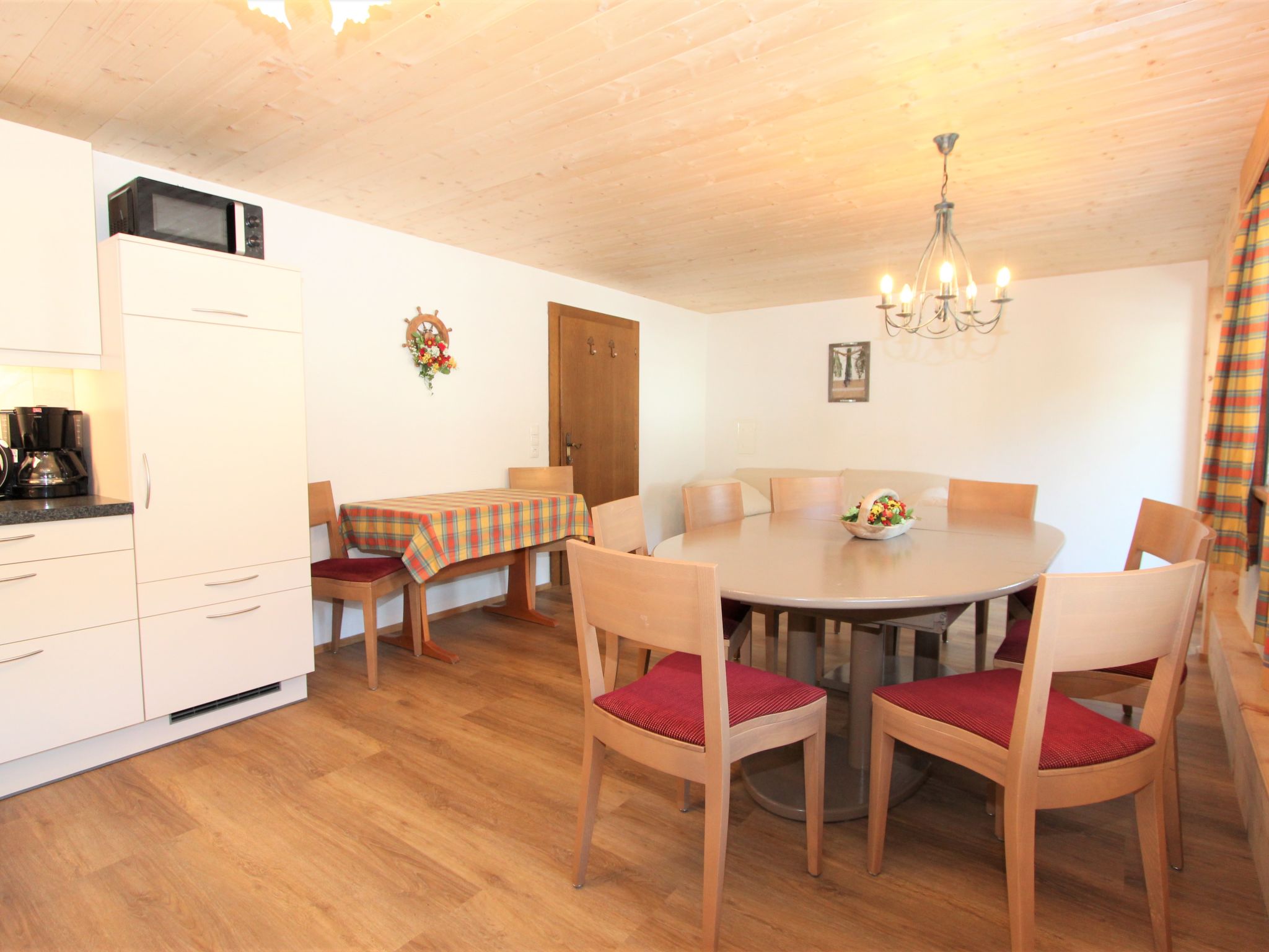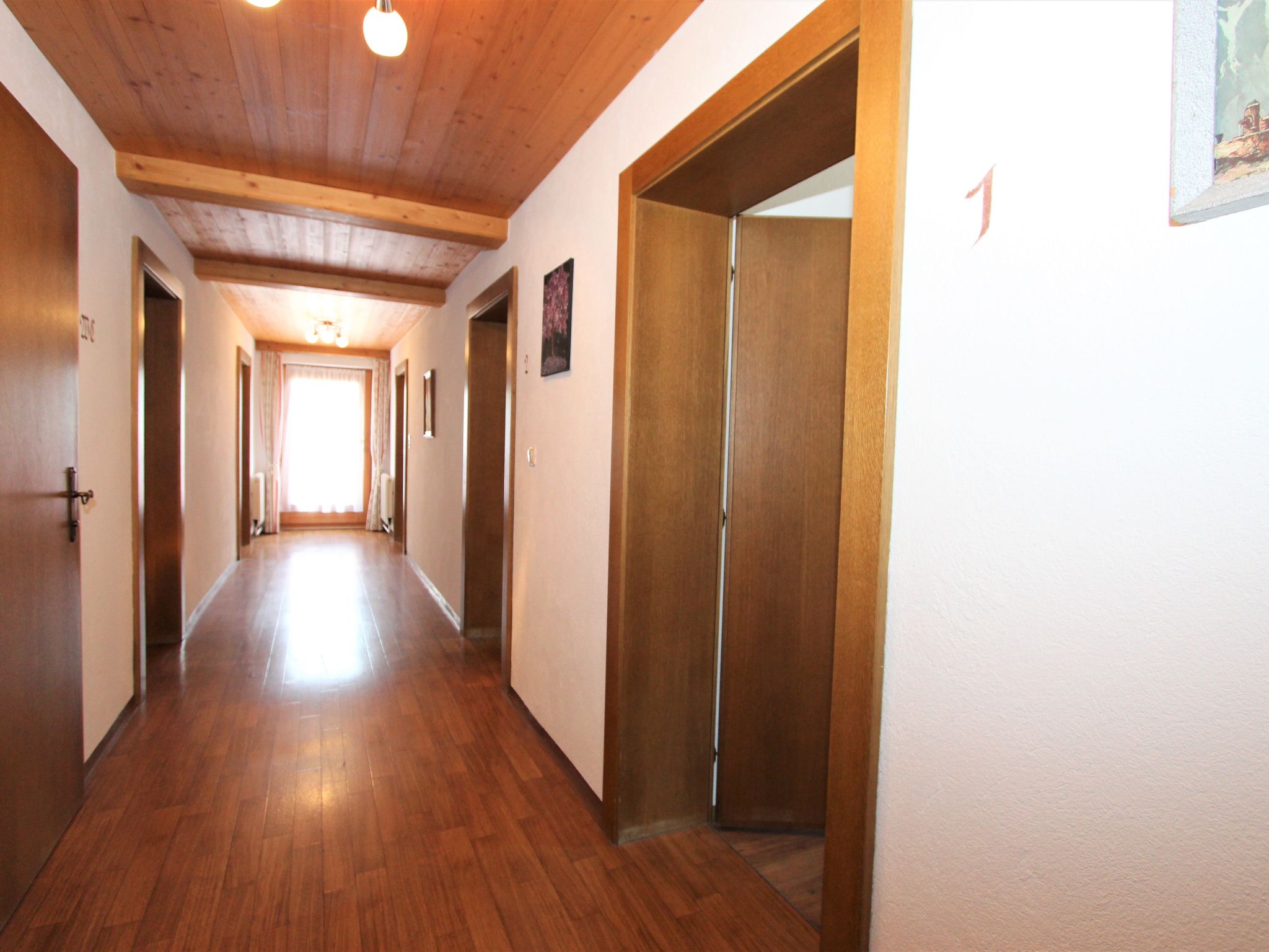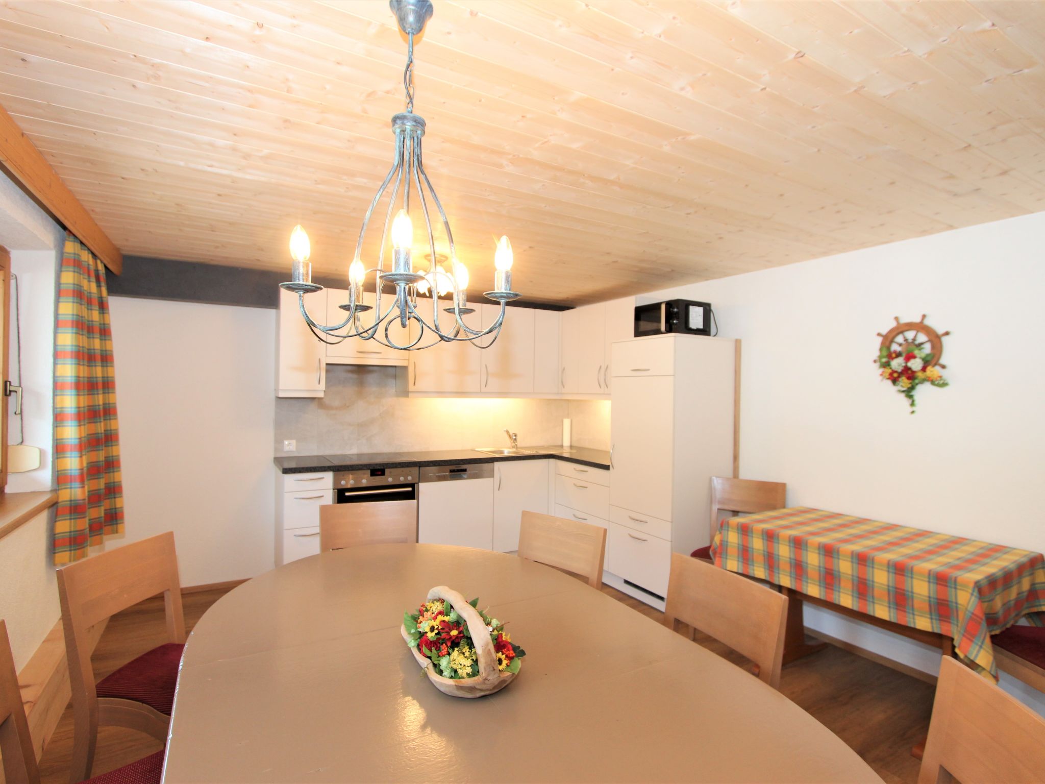5-Zimmer-Wohnung 120 m2 im 1. Stock. Objekt geeignet für 8 Erwachsene. Geräumig, schön und gemütlich eingerichtet: grosser Eingang. Grosses Wohnzimmer mit Esstisch und Sat-TV (Flachbildschirm). 4 Doppelzimmer, jedes Zimmer mit Waschbecken und Dusche. Grosse Wohnküche (Backofen, Geschirrspüler, 4 Glaskeramikherd Platten, Mikrowelle) mit 1 Doppeldiwanbett und Esstisch. Ausgang zum Balkon. Sep. WC. Das Wohnzimmer ist eine Bauernstube. 2 grosse Balkone, Westlage und Ostlage. Balkonmöbel. Schöne Sicht auf die Berge und die Landschaft. Zur Verfügung: Internet (Wireless LAN, gratis). Geeignet für Familien. 2 Haustiere/Hunde erlaubt. Achtug: Die Zusatzbetten sind für Kinder bis 12 Jahre geeignet.