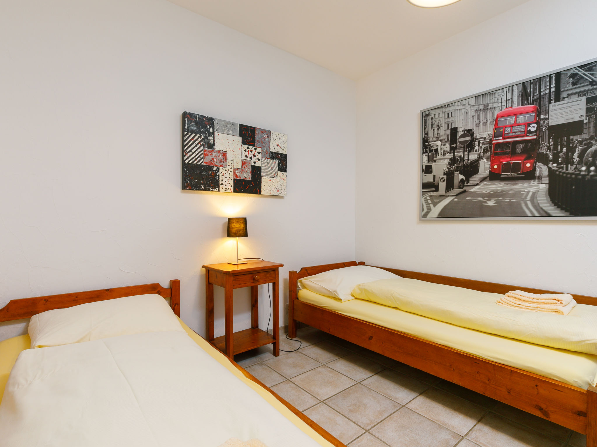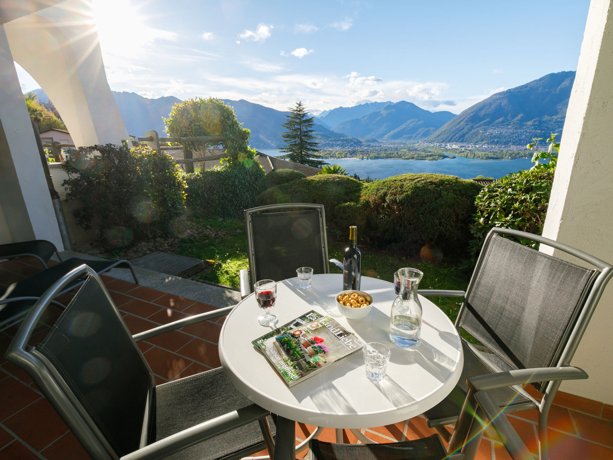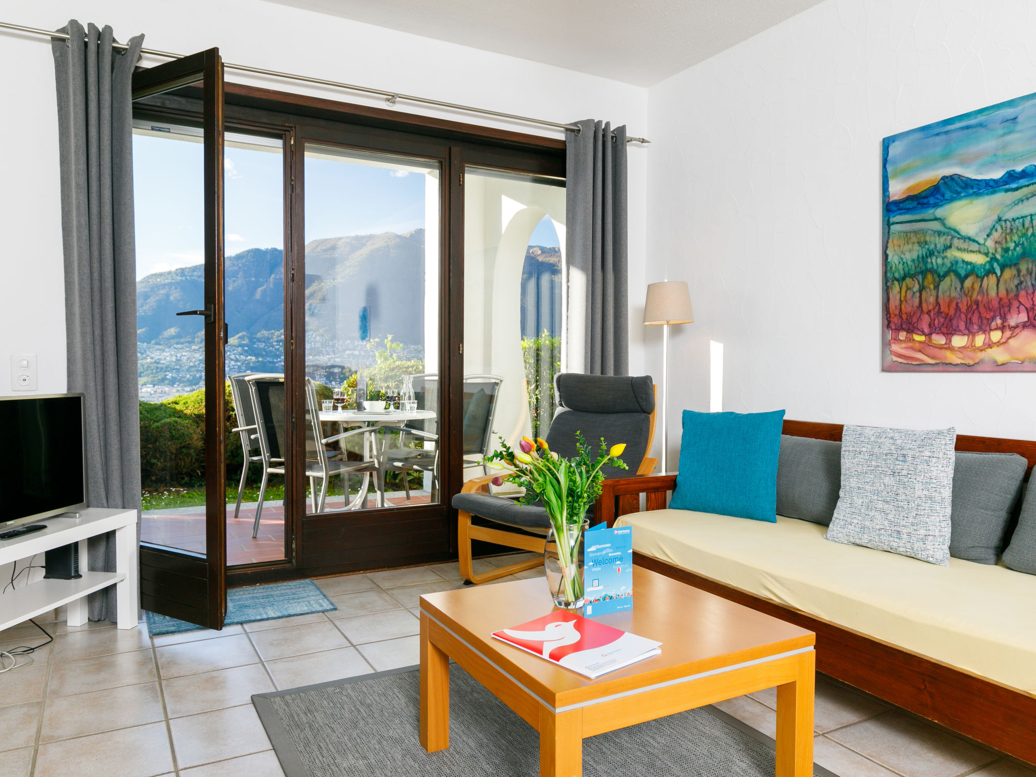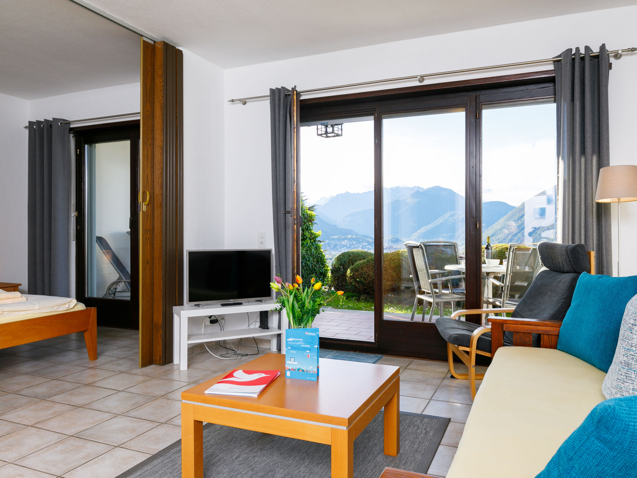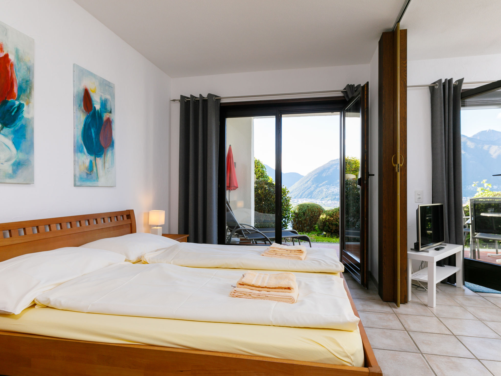 3-Zimmer-Wohnung 72 m2, im Erdgeschoss. Komfortabel und gemütlich eingerichtet: Wohn-/Esszimmer mit Sat-TV (Flachbildschirm). Ausgang zur Terrasse. 1 Zimmer mit 1 Doppelbett (2 x 90 cm, Länge 200 cm). Ausgang zur Terrasse. 1 kleines Zimmer mit 2 Betten (90 cm, Länge 200 cm). Kleine, offene Küche im Eingang (4 Kochplatten, Backofen). Dusche/WC. Heizung. Gartensitzplatz. Terrassenmöbel. Sehr schöne Panoramasicht auf den See, die Berge und die Landschaft. Zur Verfügung: Internet (Wireless LAN, gratis). Bitte beachten: Nichtraucher-Unterkunft.