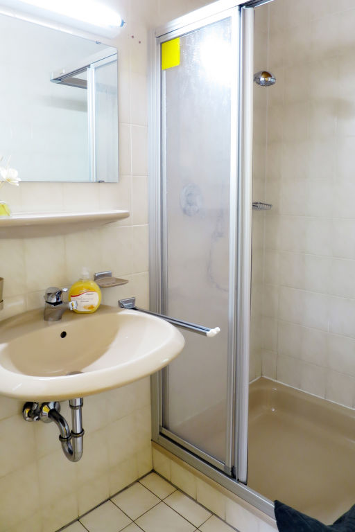 1-Zimmer-Wohnung, Erdgeschoss, ca. 30 m². Vorraum mit Garderobe und Küchenzeile (2 Platten, Minibackofen, Kühlschrank, Kaffeemaschine, Wasserkocher, Toaster). Wohn-/Schlafraum mit Doppelbett, Einzelbett und Essplatz (Eckbank). Dusche/WC.