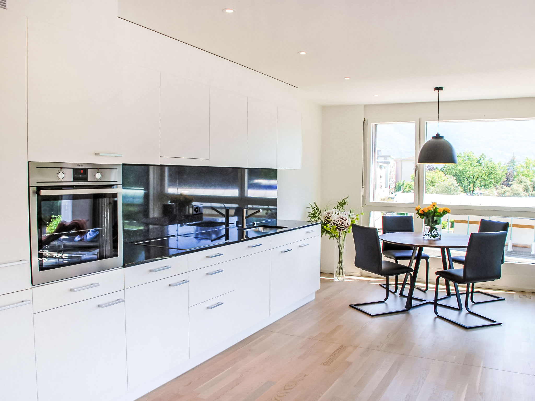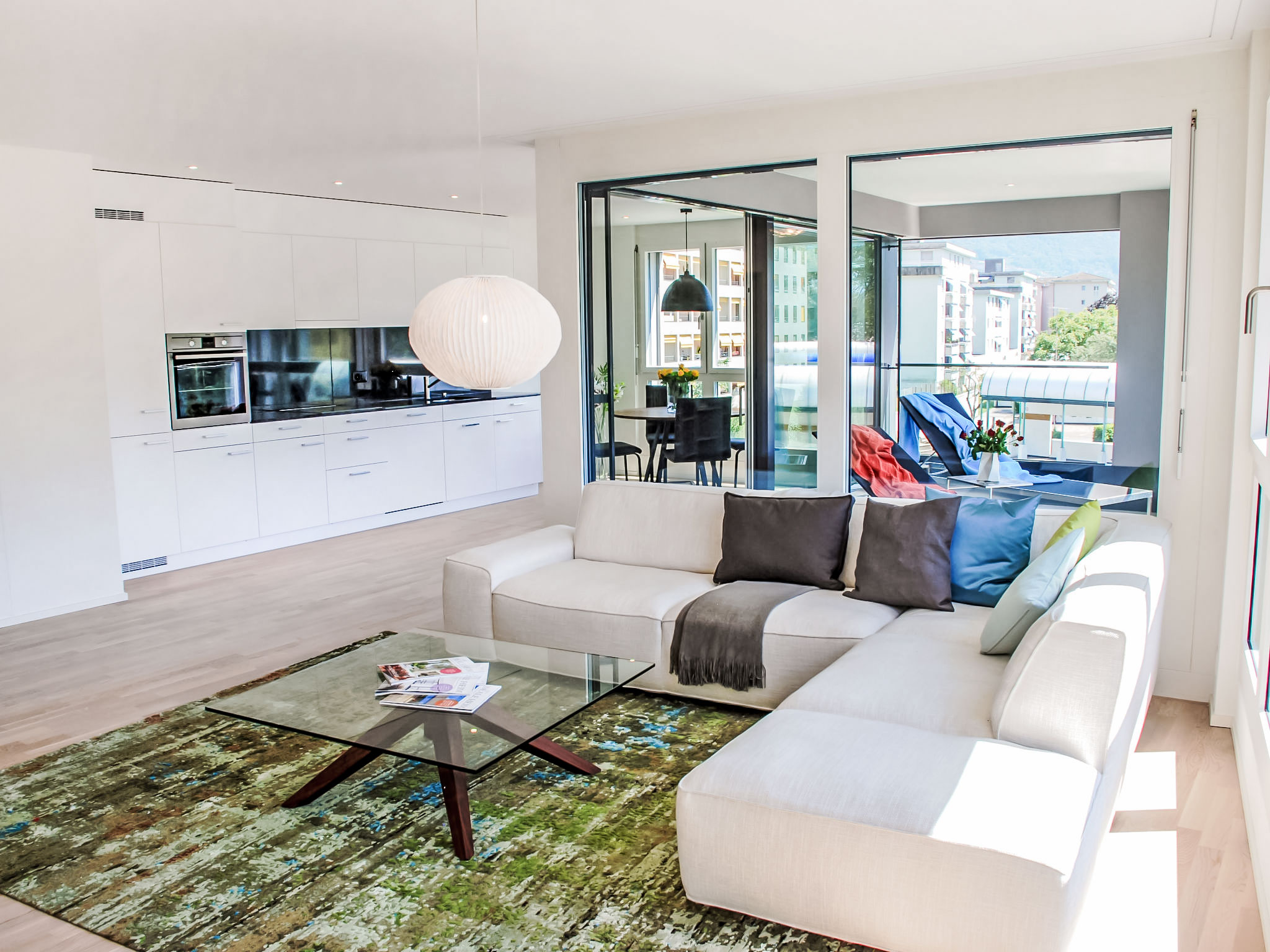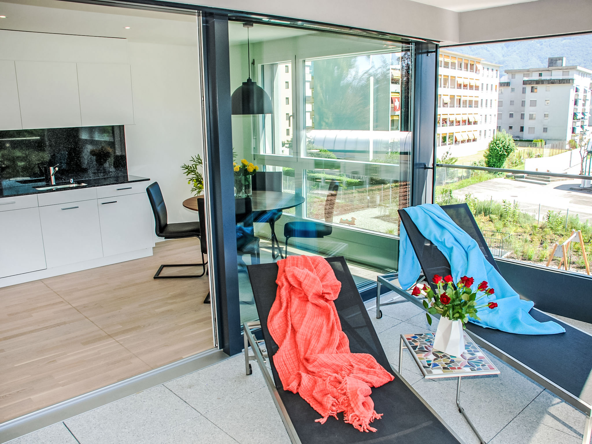 "LaVille B-2-3", 3-Zimmer-Wohnung 95 m2 im 2. Stock, Südwestlage. Geräumig und hell, modern und geschmackvoll eingerichtet: offenes grosses Wohn-/Esszimmer mit Sat-TV und Flachbildschirm. 1 Doppelzimmer mit 1 Doppelbett (2 x 90 cm, Länge 200 cm). 1 Zimmer mit 2 Betten (90 cm, Länge 200 cm). Grosse, offene Küche (Backofen, Geschirrspüler, 4 Induktionskochplatten, Tiefkühler, elektrische Kaffeemaschine, Kapseln für die Kaffeemaschine (Nespresso) extra) mit Esstisch. Ausgang zum Balkon. Bad/WC, Dusche/WC. Bodenheizung. Balkon 12 m2, Südlage und Westlage. Balkonmöbel, Liegestühle (1). Sicht auf die Berge und die Landschaft. Zur Verfügung: Waschmaschine, Wäschetrockner, Bügeleisen, Kinderhochstuhl, Babybett bis 2 Jahre (extra), Haartrockner. Internet (Wireless LAN, gratis). Parkplatz Nr. 46, Höhe 210 cm, Breite 230 cm. Bitte beachten: Nichtraucher-Unterkunft.