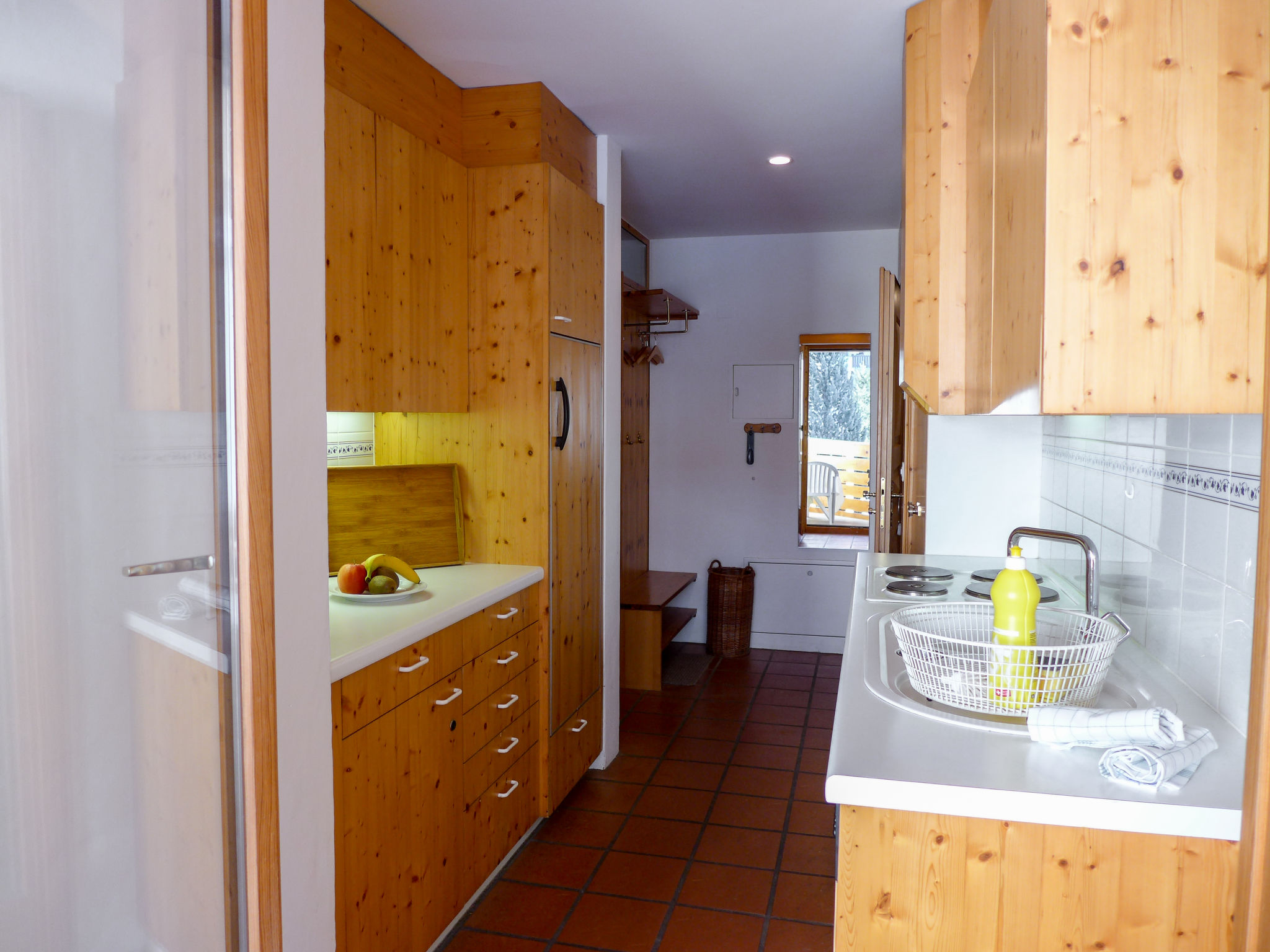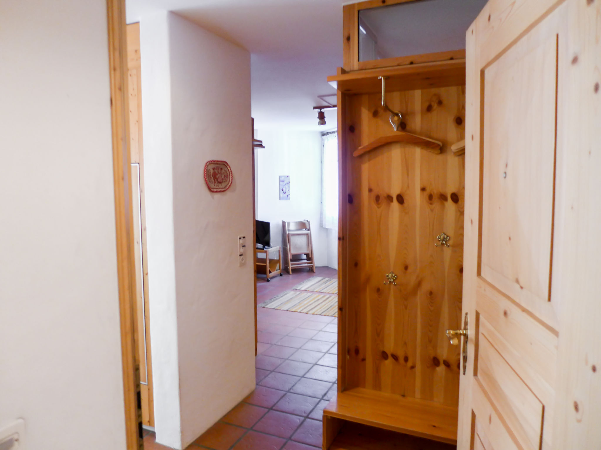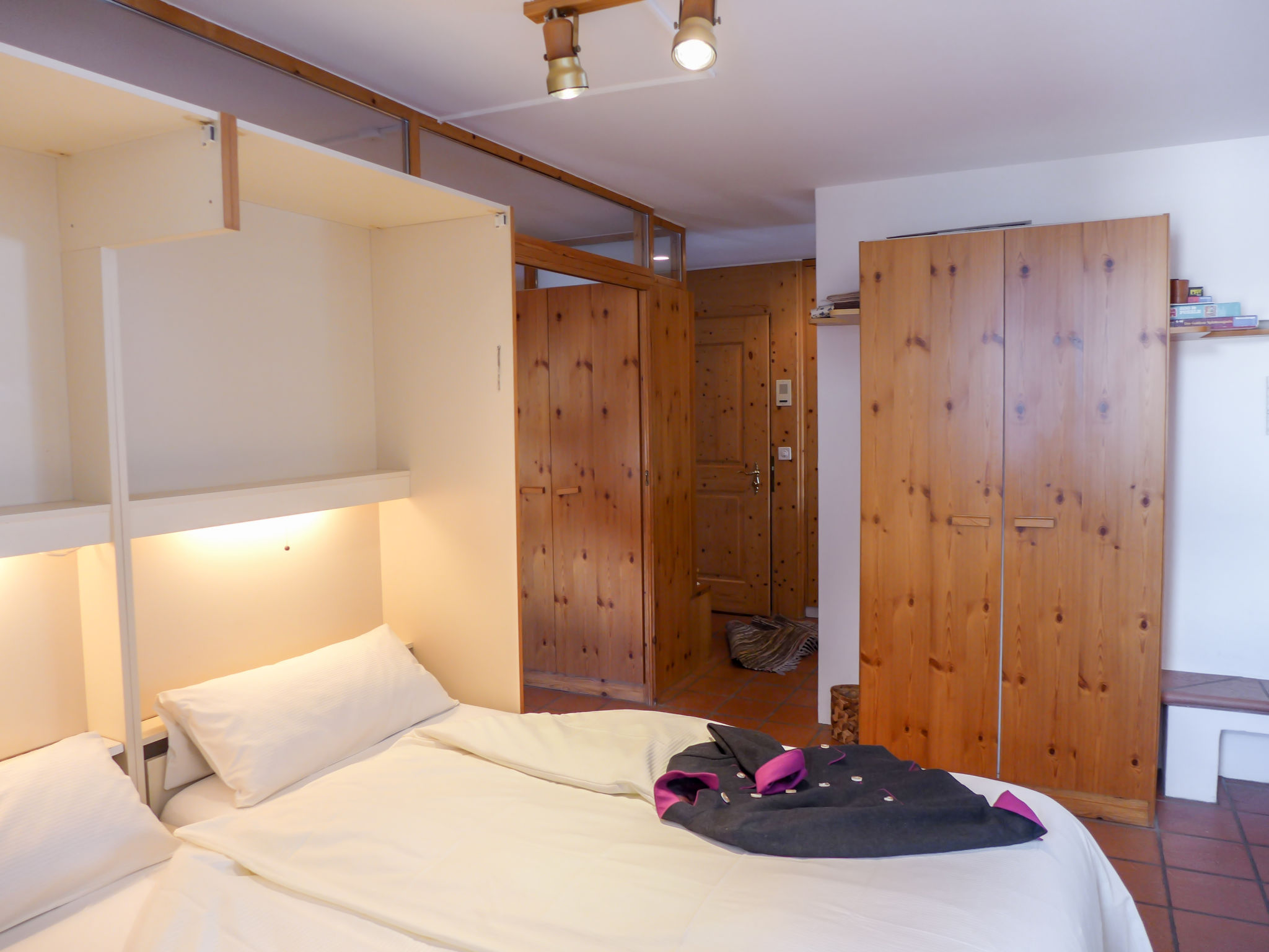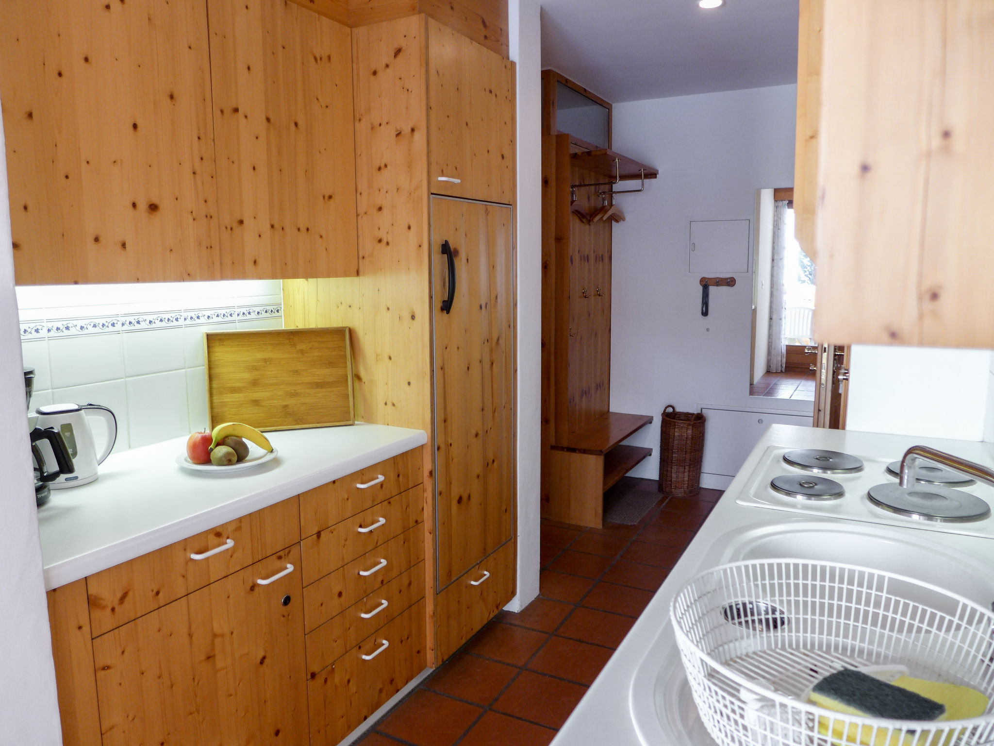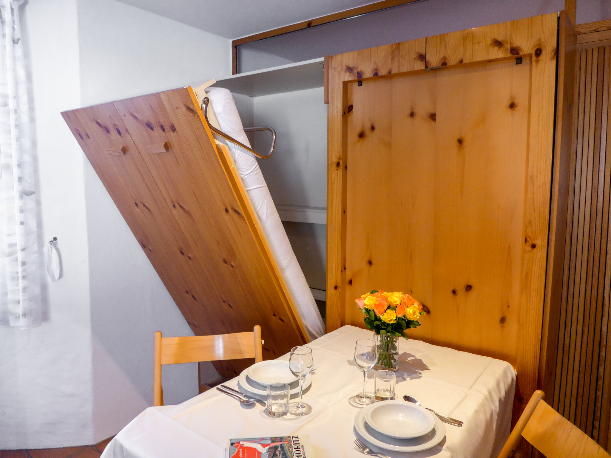 "Chesa Maurus A12", 1-Zimmer-Wohnung 50 m2 im 3. Stock. Zweckmässig und gemütlich eingerichtet: Wohn-/Schlafzimmer mit 2 Klappbetten (90 cm, Länge 200 cm), offenem Kamin, Esstisch und TV (Flachbildschirm). Ausgang zum Balkon. Verbundenes Zimmer mit 1 Klappbett (90 cm, Länge 200 cm). Offene Küche (4 Kochplatten, Backofen, Geschirrspüler, Toaster, Wasserkocher, elektrische Kaffeemaschine). Ausgang zum Balkon. Bad/WC. Balkon 6 m2. Balkonmöbel. Schöne Sicht auf die Berge, die Landschaft und die Ortschaft. Zur Verfügung: Haartrockner. Internet (Wireless LAN, gratis). Garage Nr. 17 - A12 auf dem Grundstück (1 Auto), Höhe 210 cm, Breite 220 cm. Bitte beachten: Nichtraucher-Unterkunft, Nichtraucher-Haus. :der Schlafbereich für die 3. Person kann durch eine Schiebetür abgetrennt werden.