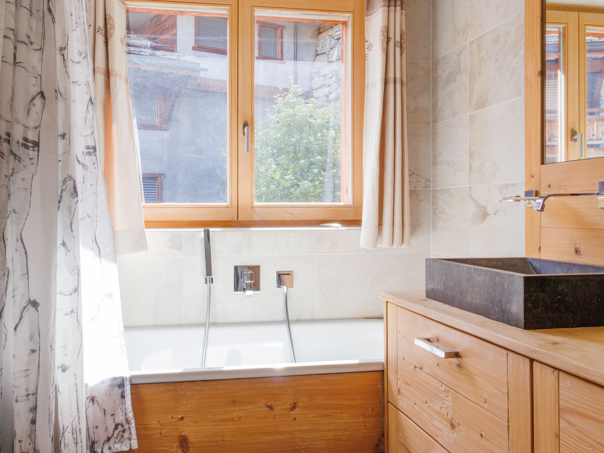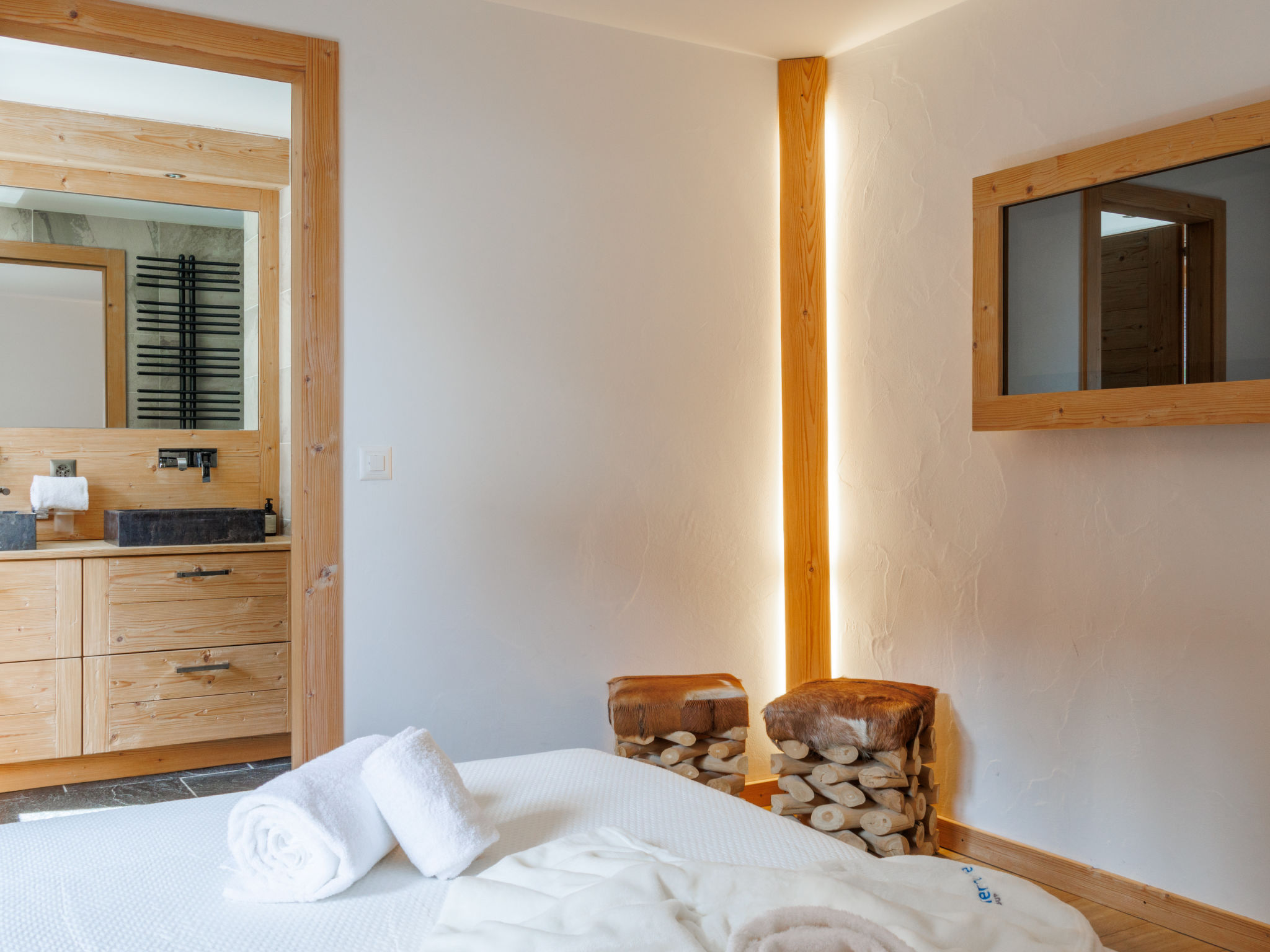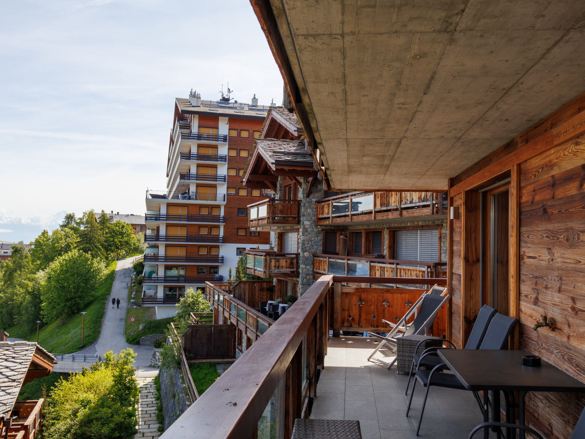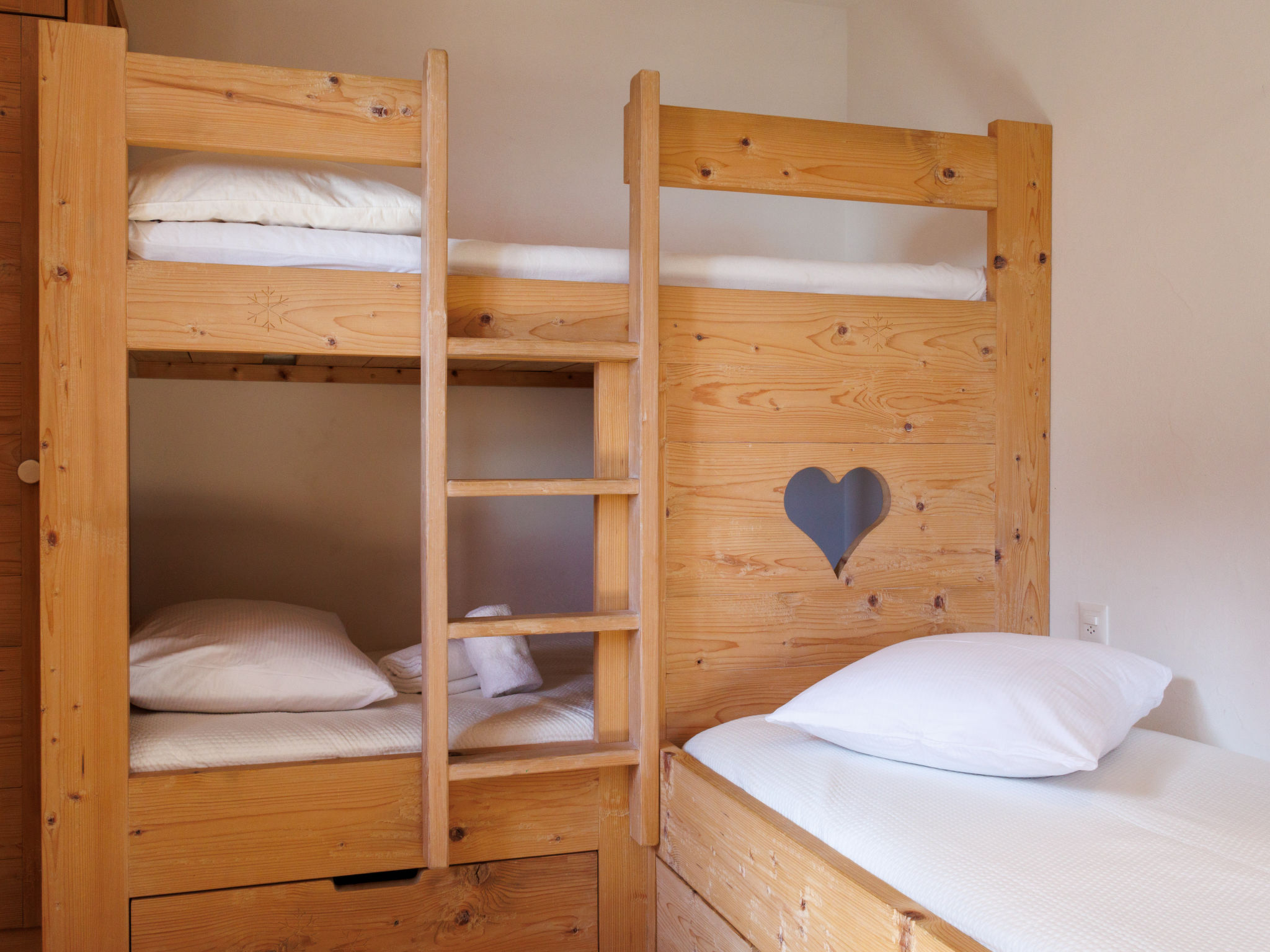 "Le Montagnard 6", 4-Zimmer-Wohnung 123 m2 im 2. Stock. Objekt geeignet für 4 Erwachsene + 4 Kinder. Geräumig, sehr schön und luxuriös eingerichtet: grosses Wohn-/Esszimmer mit Panoramafenster mit offenem Kamin, Kabel-TV und DVD. Ausgang zum Balkon, Richtung Norden und Richtung Osten. 1 grosses Zimmer mit 1 Doppelbett (180 cm, Länge 200 cm), Bad/Dusche/WC und Kabel-TV. 1 Zimmer mit 1 Doppelbett (180 cm, Länge 200 cm), Dusche/WC und Kabel-TV. Ausgang zum Balkon. 1 Kinderzimmer mit 1 x 2 Etagenbetten (90 cm, Länge 190 cm), 1 Ausziehbett (2 Pers. 2 x 90 cm, Länge 190 cm), Kabel-TV. Offene Küche (Backofen, Geschirrspüler, 4 Induktionskochplatten, Mikrowelle, elektrische Kaffeemaschine, Kapseln für die Kaffeemaschine (nespresso) extra, Racletteofen, Fondue Set (Chinoise, Käse)). Dusche/WC. Fussbodenheizung. Balkon 26 m2, Nordlage und Ostlage Balkon 10 m2. Balkonmöbel, Liegestühle (4). Sehr schöne Sicht auf die Berge. Zur Verfügung: Waschmaschine, Wäschetrockner, Kinderhochstuhl, Babybett, Haartrockner. Internet (Wireless LAN, gratis). Garage Nr. 6 (2 Autos), Höhe 220 cm. Bitte beachten: geeignet für Familien. Nichtraucher-Unterkunft. 4 Abonnements für Thermalbad „Bisses“ sind während des Aufenthalts im Mietpreis inbegriffen. Dieses Thermalbad ist ein Teil des „4 Vallées Mer de Glace“ Komplex.