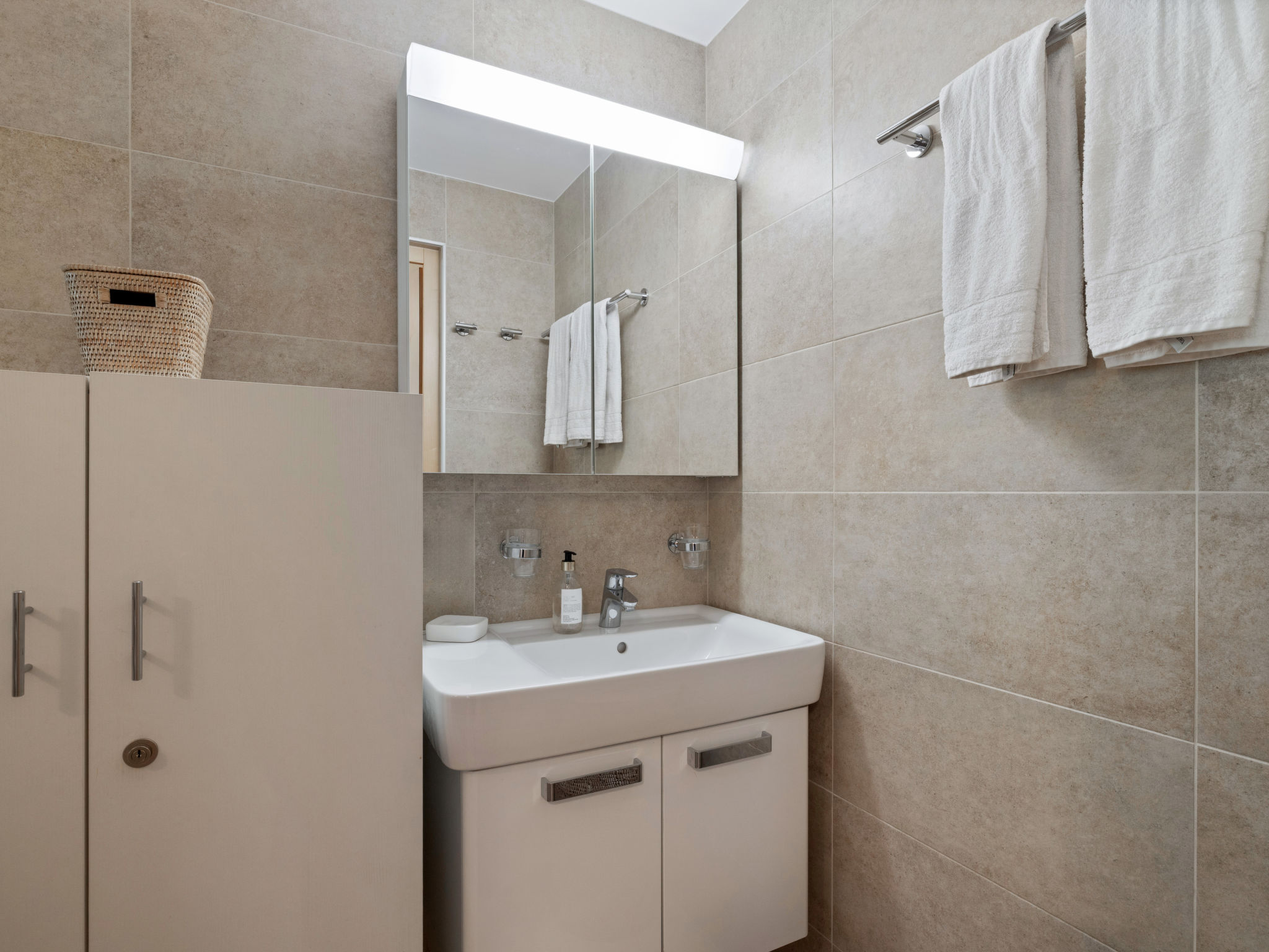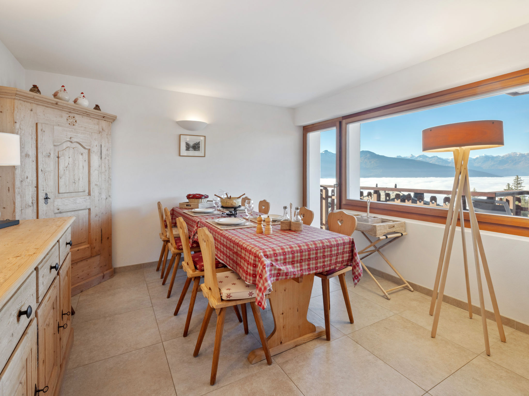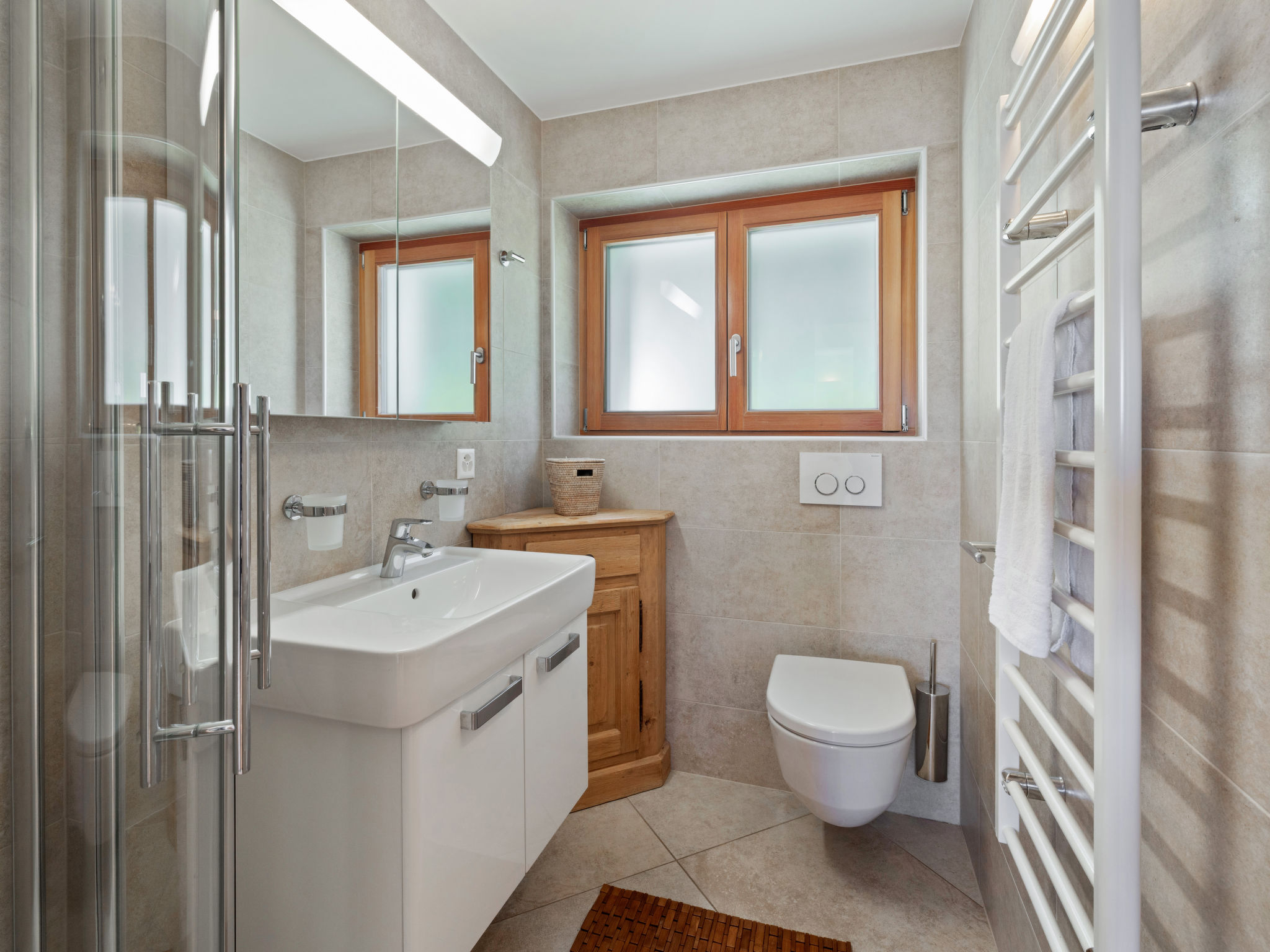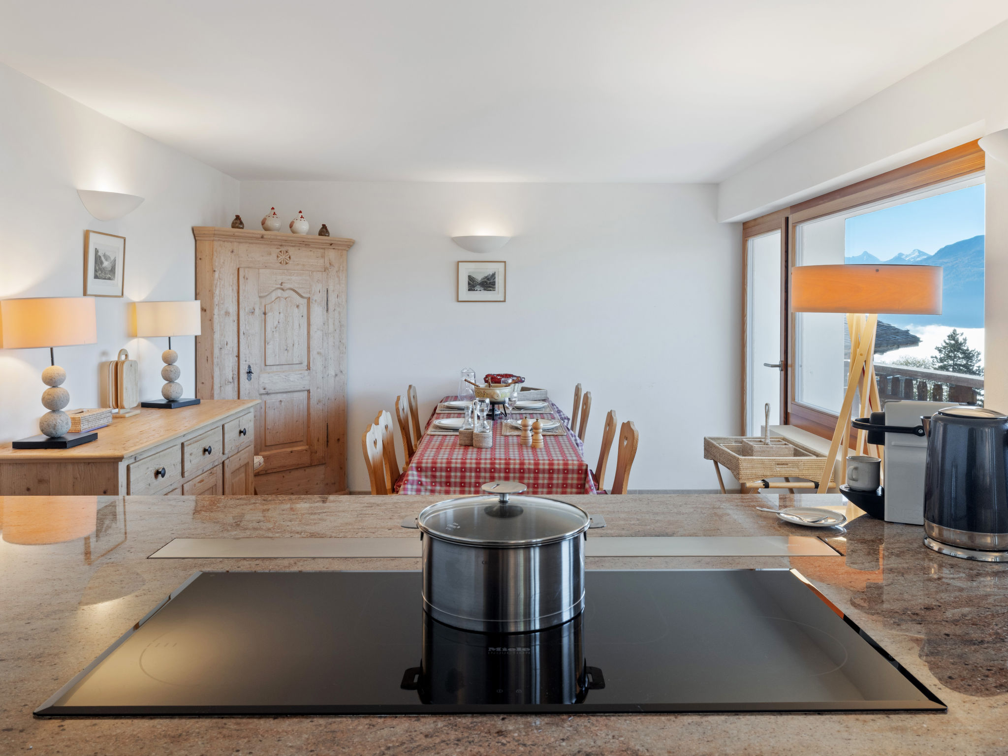 3-Zimmer-Wohnung 70 m2, im erhöhten Erdgeschoss. Komfortabel und modern eingerichtet: Wohn-/Esszimmer mit Kabel-TV. Ausgang zum Balkon. 1 Zimmer mit 1 Doppelbett (2 x 90 cm, Länge 200 cm), Bad/WC. 1 Zimmer mit 1 Doppelbett (2 x 90 cm, Länge 200 cm). Wohnküche (Backofen, Geschirrspüler, 4 Induktionskochplatten, Toaster, Wasserkocher, Mikrowelle, elektrische Kaffeemaschine, Kapseln für die Kaffeemaschine (Nespresso) extra, Racletteofen, Fondue Set (Chinoise, Käse)). Dusche/WC. Grosser Balkon 20 m2, Südwestlage. Balkonmöbel, Liegestühle (2). Sehr schöne Sicht auf die Berge und die Landschaft. Zur Verfügung: Bügeleisen, Haartrockner. Internet (Wireless LAN, gratis). Garage Nr. 2, Höhe 190 cm, Breite 230 cm. Bitte beachten: Nichtraucher-Unterkunft. 1 Haustier/Hund erlaubt. Kein Fahrstuhl.