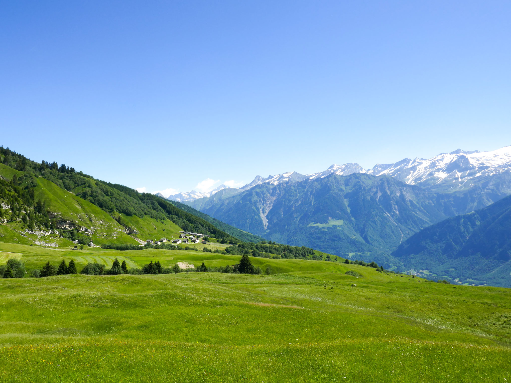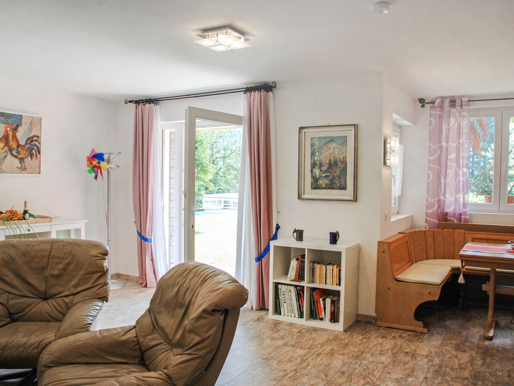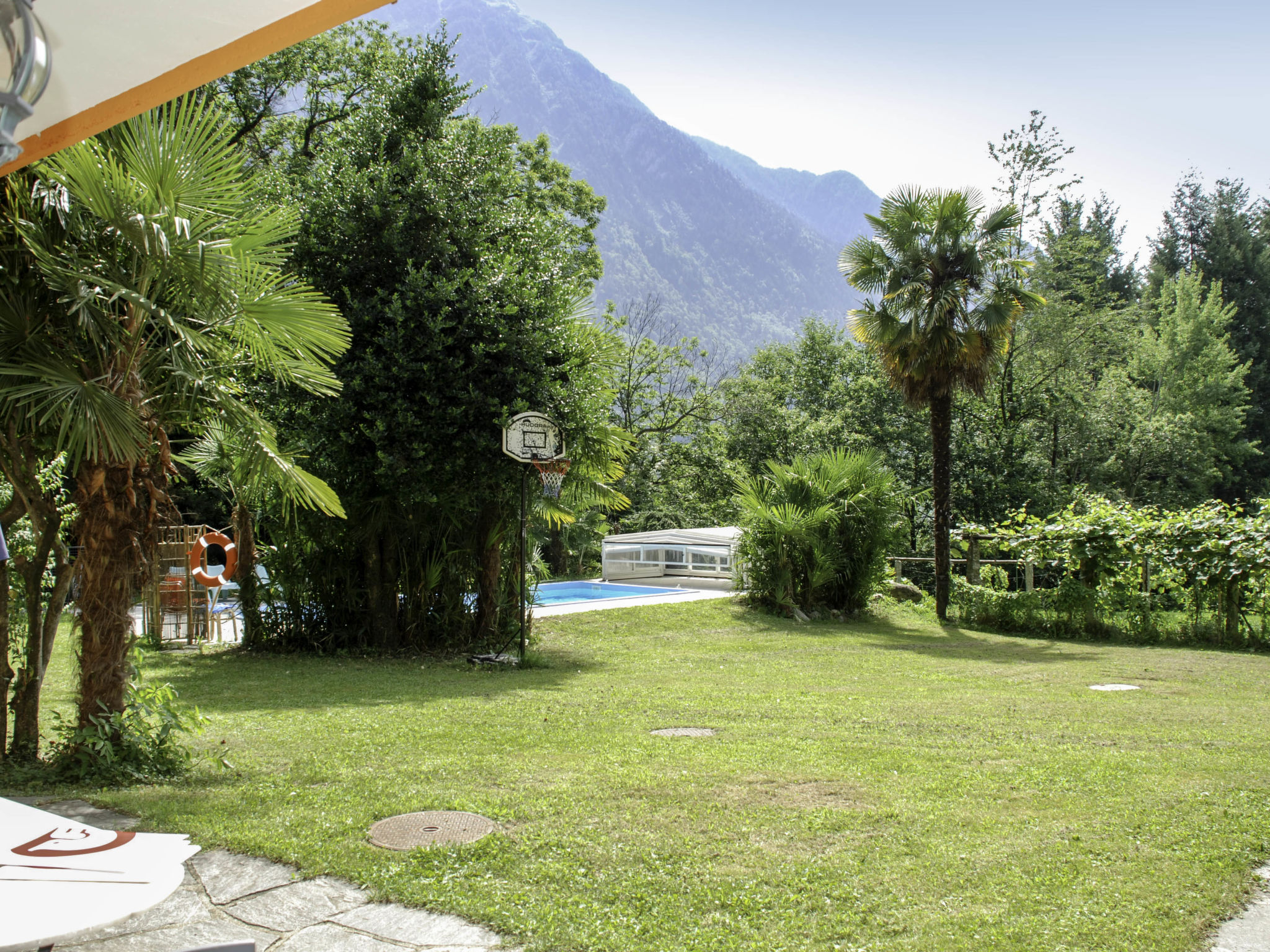 "Appartamento Poolside", 2-Zimmer-Wohnung 45 m2, im Erdgeschoss, Südlage. Geräumig und hell, renoviert im Jahre 2018, komfortabel und gemütlich eingerichtet: offenes Wohn-/Esszimmer mit Kabel-TV und Flachbildschirm. Ausgang zum Garten, zum Gartensitzplatz. 1 Doppelzimmer mit 1 Bett (90 cm, Länge 200 cm), 1 Doppelbett (1 x 180 cm, Länge 200 cm). Offene Küche (Backofen, Geschirrspüler, 4 Glaskeramikherd Platten, Toaster, Wasserkocher, Tiefkühler, elektrische Kaffeemaschine, Kapseln für die Kaffeemaschine (Dolce Gusto) extra, Racletteofen, Fondue Set (Käse)) mit Esstisch. Dusche/WC. Gartensitzplatz teilweise überdacht. Terrassenmöbel. Herrliche Panoramasicht auf die Landschaft. Zur Verfügung: Bügeleisen, Kinderhochstuhl, Babybett bis 2 Jahre (extra), Haartrockner. Internet (Wireless LAN, gratis). Bitte beachten: Nichtraucher-Unterkunft. 1 Haustier/Hund erlaubt. Rauchmelder, Feuerlöscher.