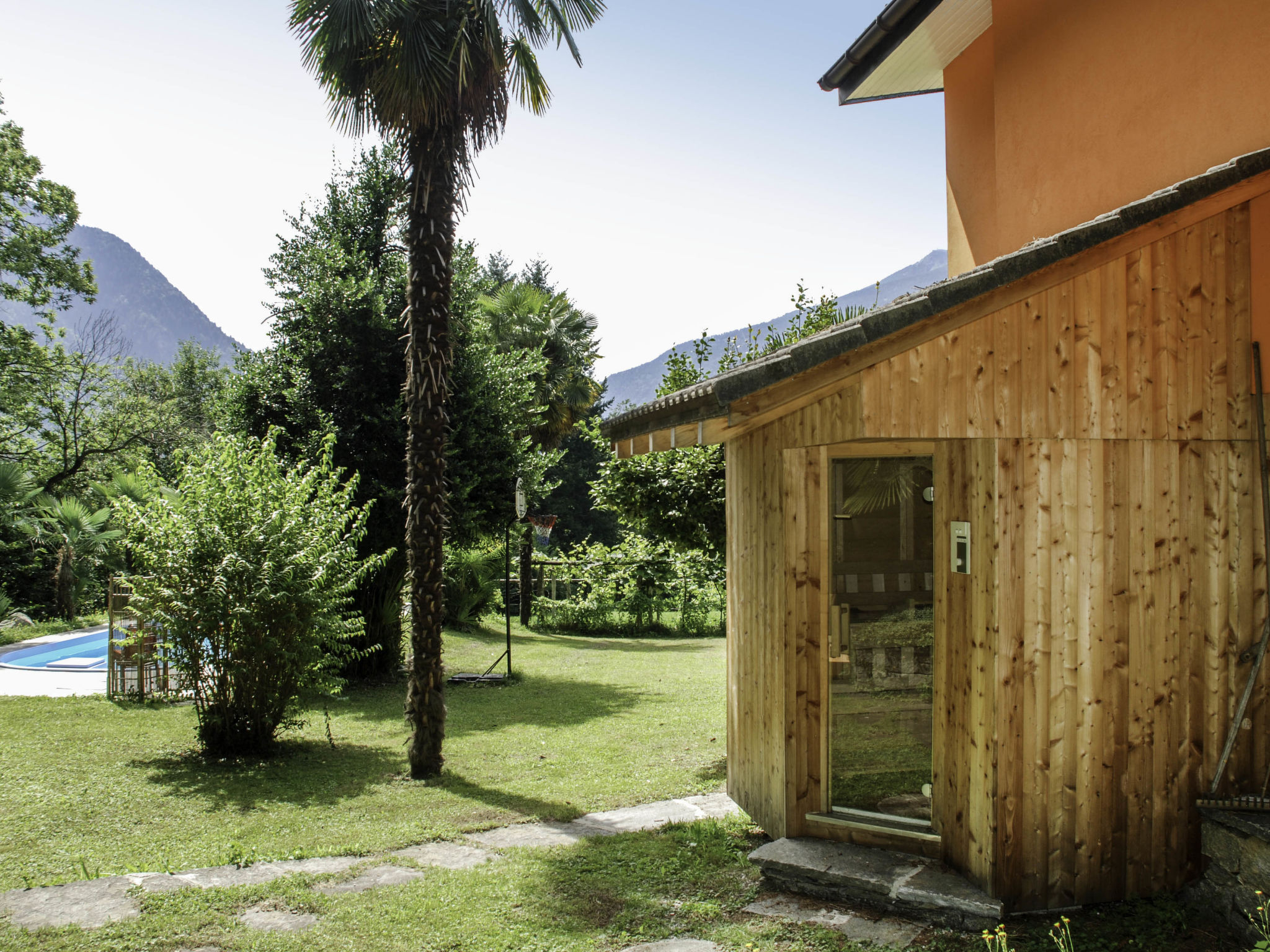 CASTRO: Gemütliches, alleinstehendes Zweifamilienhaus "Dragone", auf 2 Stockwerken, umgeben von Bäumen, Wiesen und Feldern. 2 Wohnungen im Ferienhaus. Castro, im Bezirk Valle di Blenio, alleinstehende, ruhige, sonnige Lage, 10 m vom Waldrand, in einer Sackgasse, im Grünen, Richtung Süden. Zur Mitbenutzung: Grundstück (eingezäunt), wunderschöner Garten zum Entspannen, Aufstellpool (8 x 4 m, 150 - 150 cm tief, saisonale Verfügbarkeit: 01.Apr.-31.Okt.) mit Innentreppe. Aussendusche, Sitzplatz. Im Hause: Sauna, Fitnessraum, Zentralheizung, Waschmaschine, Wäschetrockner (zur Mitbenutzung). Zufahrt bis zum Haus zum Grundstück. Parkplatz (für 6 Autos). Wanderwege ab Haus, Kinderspielplatz 10 m. Bitte beachten: Fahrzeug empfohlen. Geeignet für Familien, geeignet für Senioren Babyausstattung auf Anfrage. Jugendgruppen nur auf Anfrage. Tiere in der Umgebung. In diesem Haus sind weitere Ferienwohnungen mietbar. Ferienwohnung Ref. CH6723.150. Befindet sich auf dem gleichen Grundstück. Achtung - kleine Kinder sollten wegen Terrasse und Pool nicht unbeaufsichtigt bleiben!