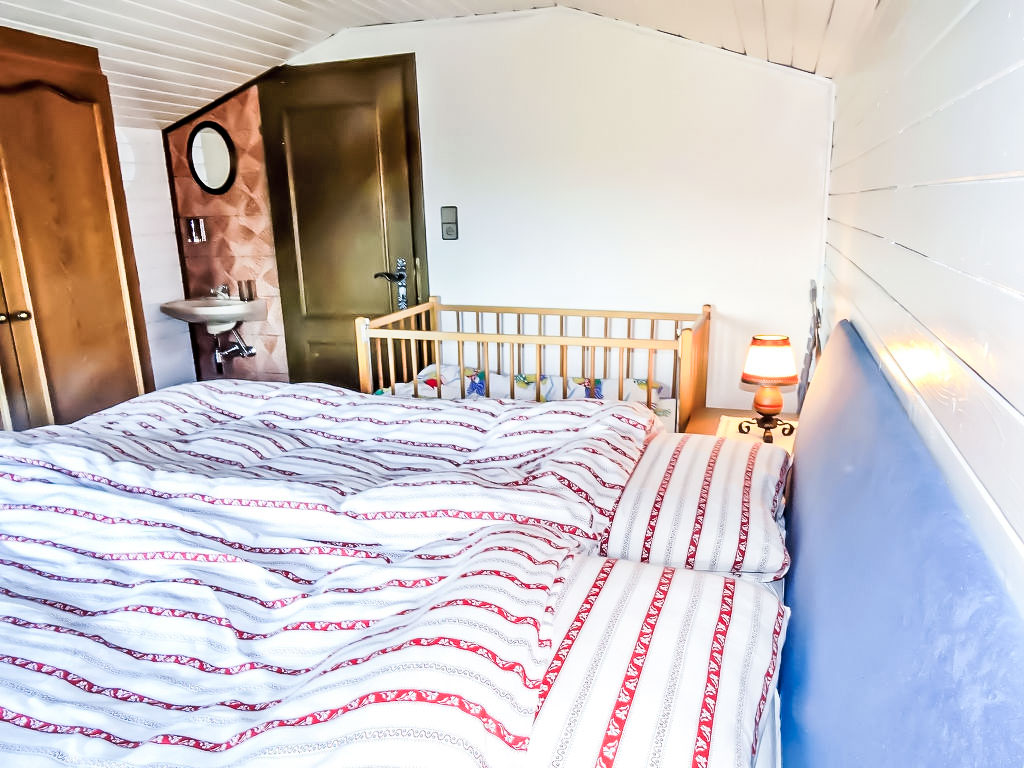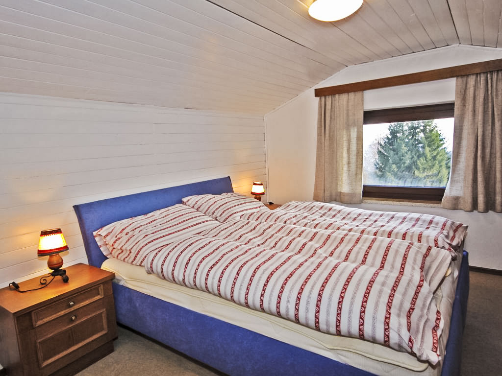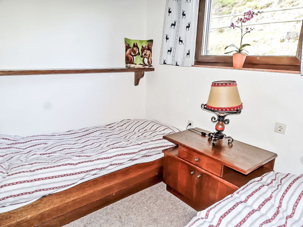 5-Zimmer-Haus 100 m2 auf 2 Stockwerken, im Erdgeschoss. Rustikal und gemütlich eingerichtet: Eingang. Wohn-/Esszimmer mit Essecke und Sat-TV (Flachbildschirm), Radio und Kachelofen. Ausgang zum Garten, zur Terrasse. 1 Zimmer mit 2 Betten. 1 Doppelzimmer. Kleine Küche (2 Kochplatten, Backofen, elektrische Kaffeemaschine). Dusche/WC. E-Heizung, Holzheizung, Boiler (200 Liter). Dachgeschoss: 1 Doppelzimmer mit Waschbecken. 1 Doppelzimmer. Terrasse 11 m2. Balkonmöbel. Schöne Sicht auf die Berge. Zur Verfügung: Kinderhochstuhl, Babybett bis 3 Jahre, Haartrockner. Internet (Wireless LAN, gratis). Bitte beachten: geeignet für Familien. Nichtraucher-Haus.