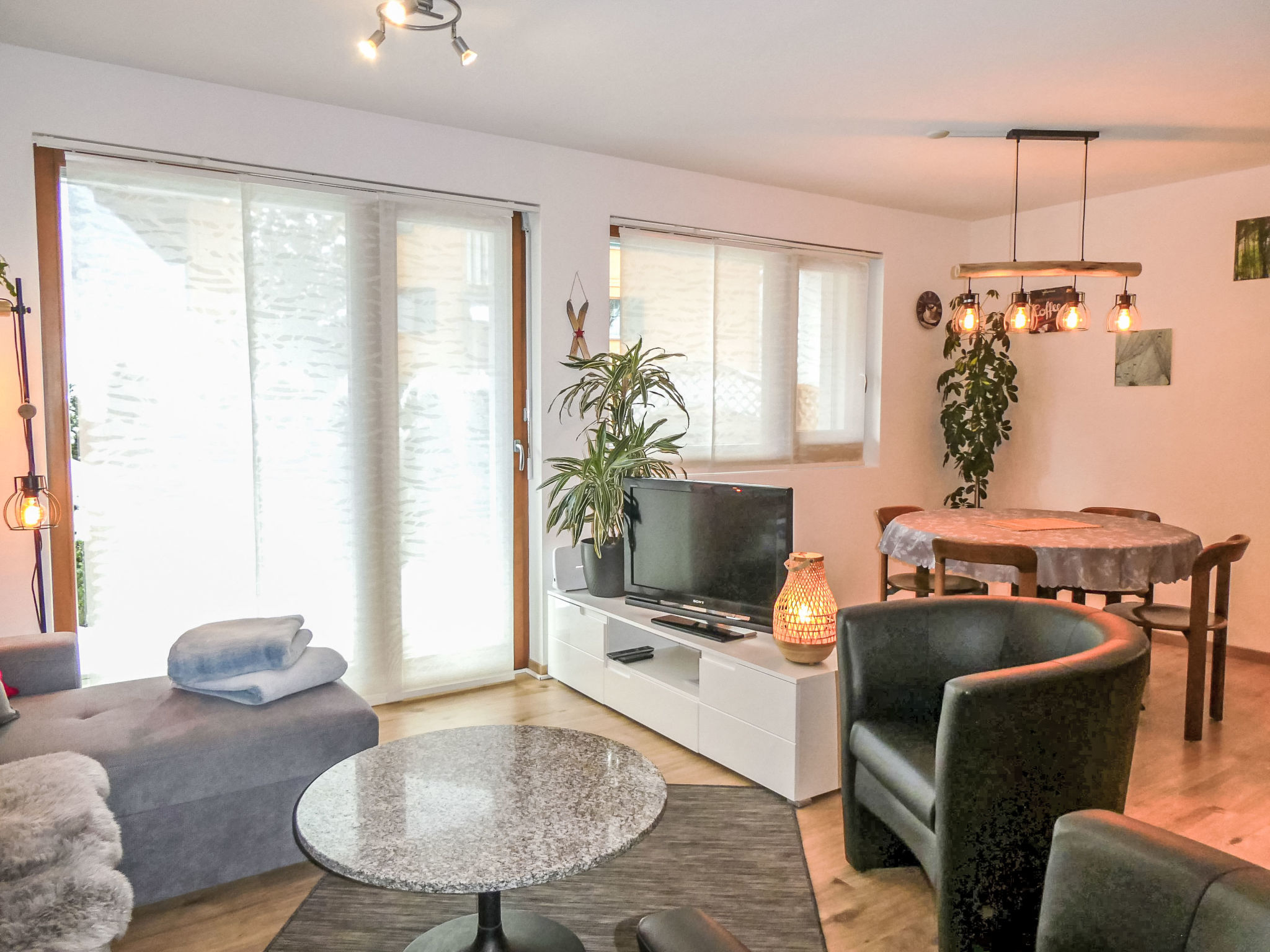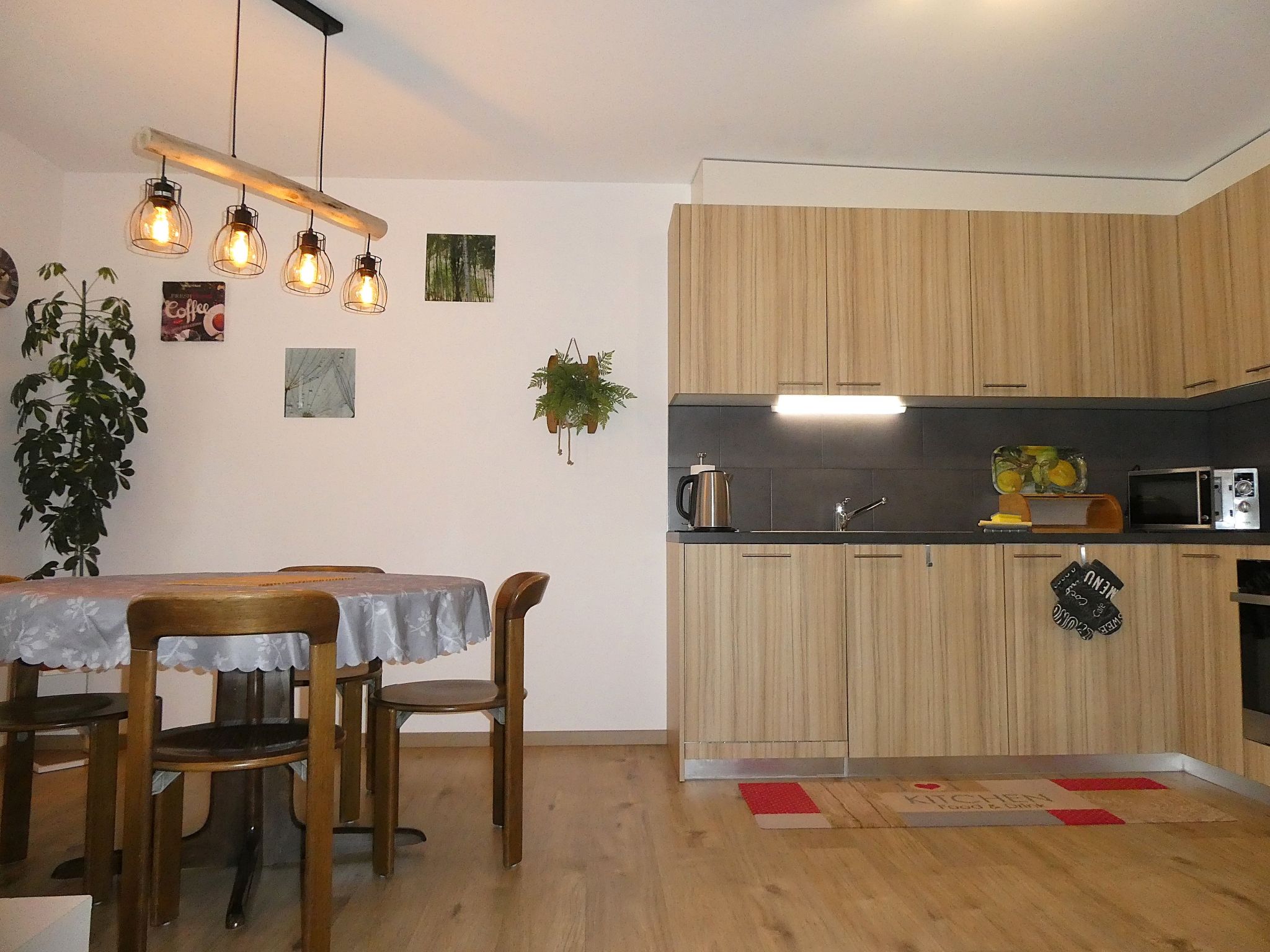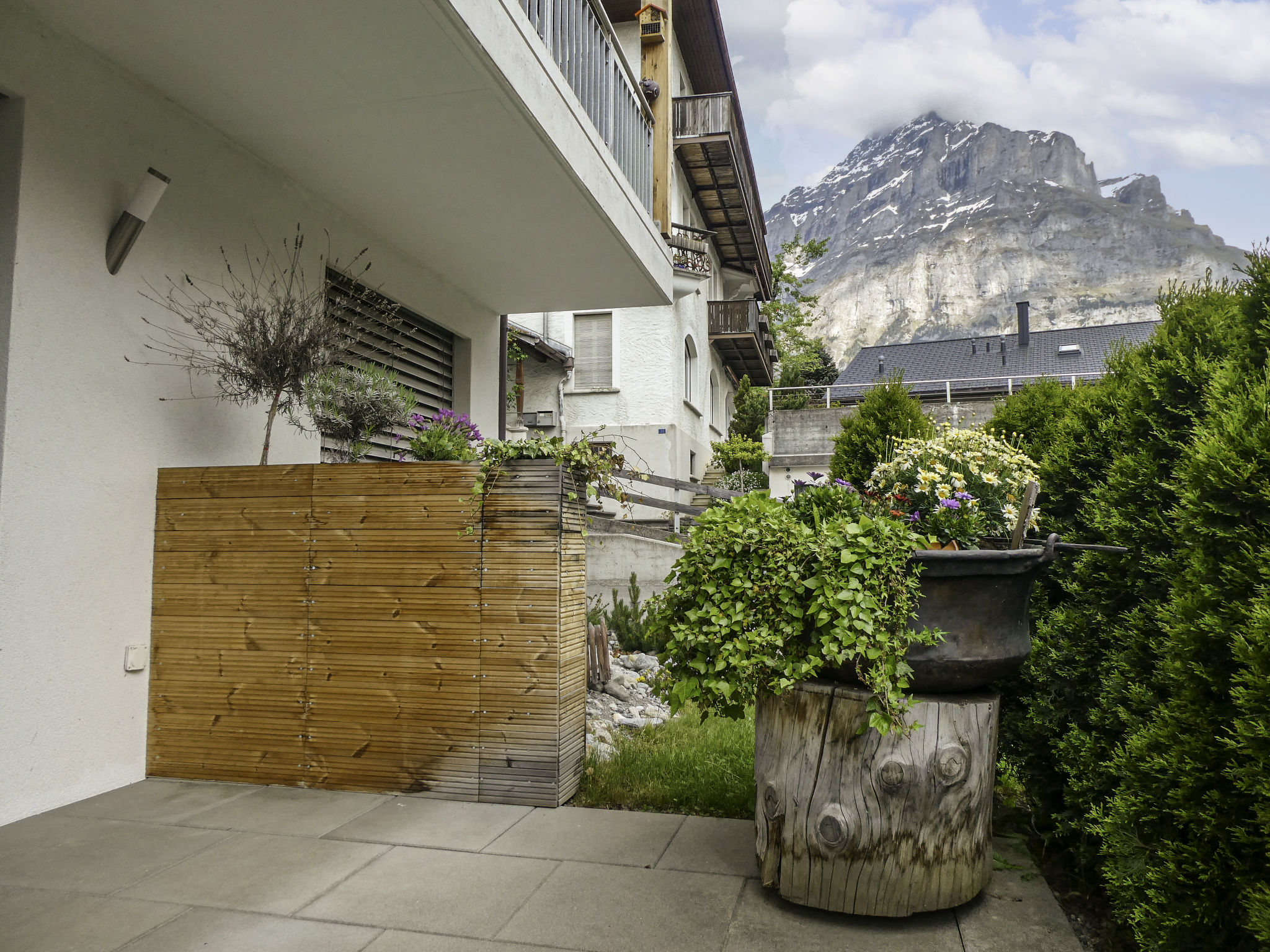 3-Zimmer-Wohnung 60 m2 auf 2 Stockwerken, im Erdgeschoss, Südlage. Hell, modern und gemütlich eingerichtet: Wohn-/Esszimmer mit Digital-TV. Ausgang zum Gartensitzplatz, Richtung Süden. 1 Zimmer mit 1 Doppelbett (2 x 90 cm, Länge 200 cm). Offene Küche (Backofen, Geschirrspüler, 4 Glaskeramikherd Platten, Toaster, Wasserkocher, Mikrowelle, elektrische Kaffeemaschine, Kapseln für die Kaffeemaschine (Nespresso) extra, Racletteofen, Fondue Set (Käse)). Dusche/WC. Fussbodenheizung. Obergeschoss: (Wendeltreppe) 1 Zimmer mit 2 Betten (90 cm, Länge 200 cm). Parkettböden, Natursteinböden. Gartensitzplatz, Südlage. Terrassenmöbel, Liegestühle. Herrliche Sicht auf die Berge und Eigernordwand. Zur Verfügung: Waschmaschine, Wäschetrockner, Kinderhochstuhl, Babybett, Haartrockner. Internet (Wireless LAN, gratis). Parkplatz (überdacht). Bitte beachten: Nichtraucher-Unterkunft. Feuerlöscher.