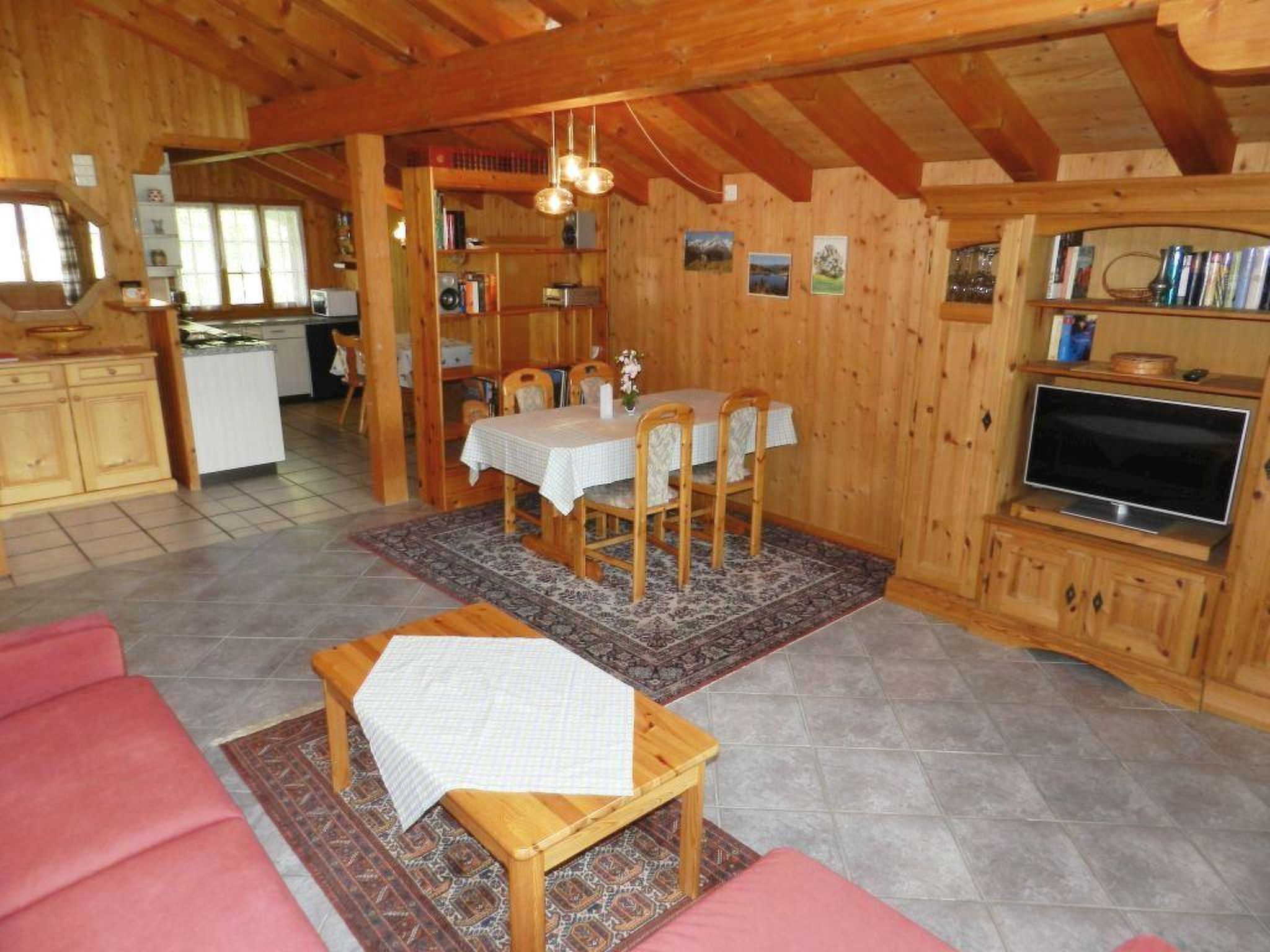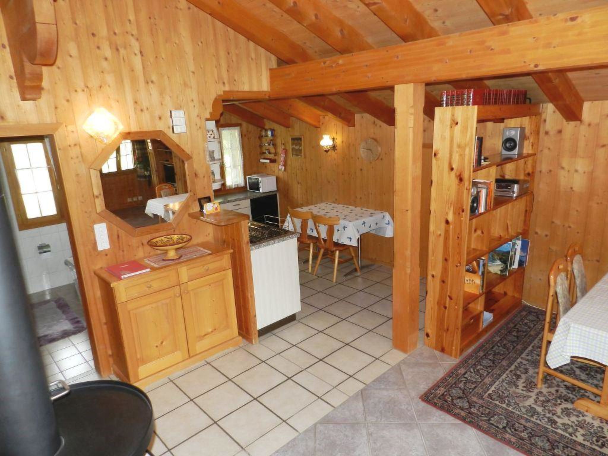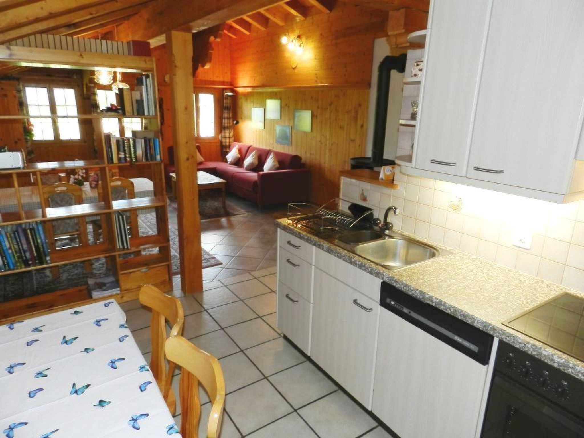 Wohn-/Esszimmer mit offener Küche (u.a. ausgestattet mit Keramikherd, Backofen, Mikrowelle, Geschirrspülmaschine, Filterkaffeemaschine sowie Fondue- und Raclette-Set), Esstisch, Ausziehsofa (140x200cm), Schwedenofen, Radio und TV. 1 Schlafzimmer mit 1 Doppelbett (2x90x200cm), 1 Einzelbett (90x200cm) und 1 Unterziehbett (90x200cm). 1 Badezimmer mit Badewanne und WC. WiFi vorhanden. Kinderbett (70x140cm) inkl. Bettwäsche und Kinderhochstuhl vorhanden.