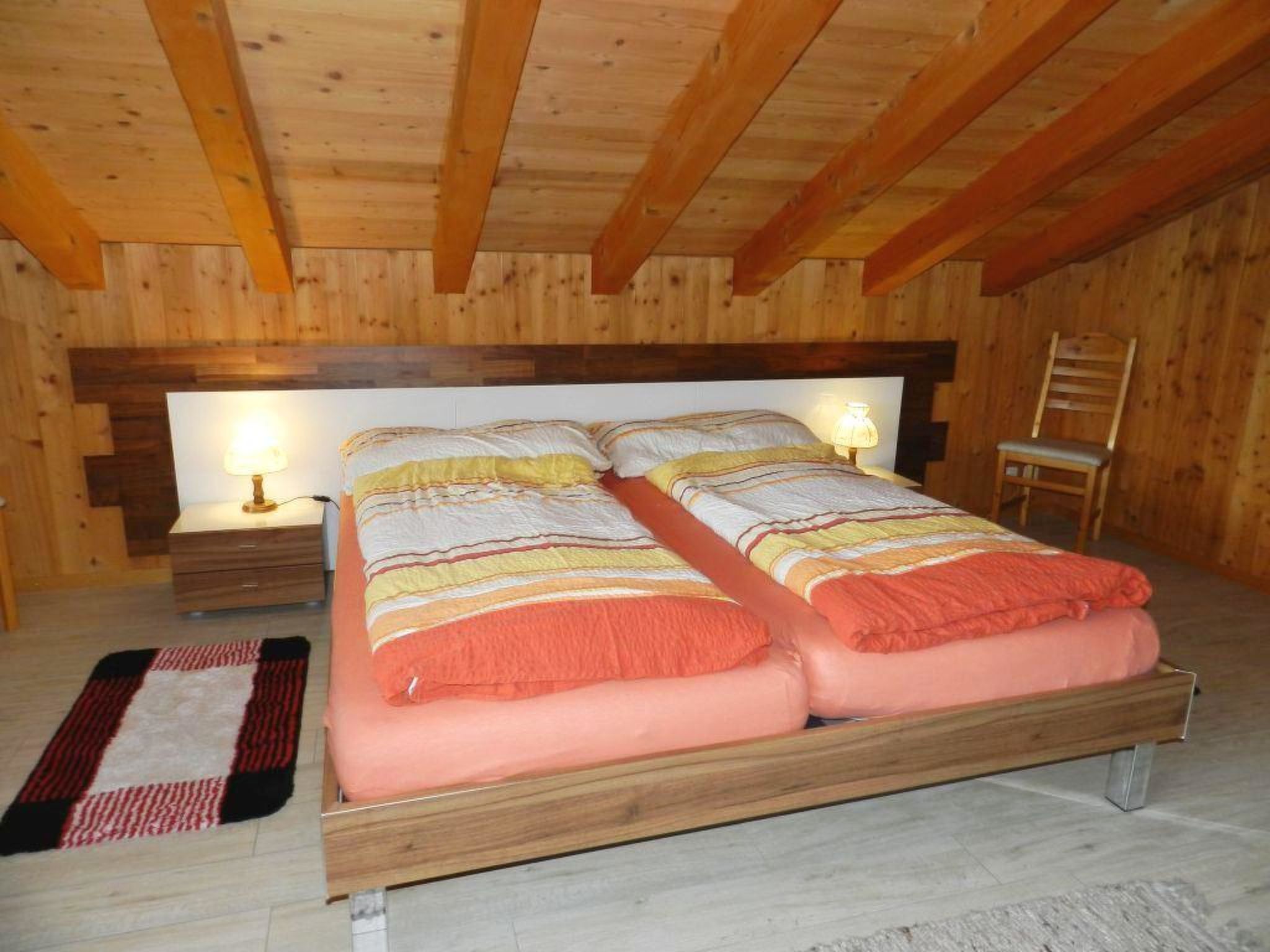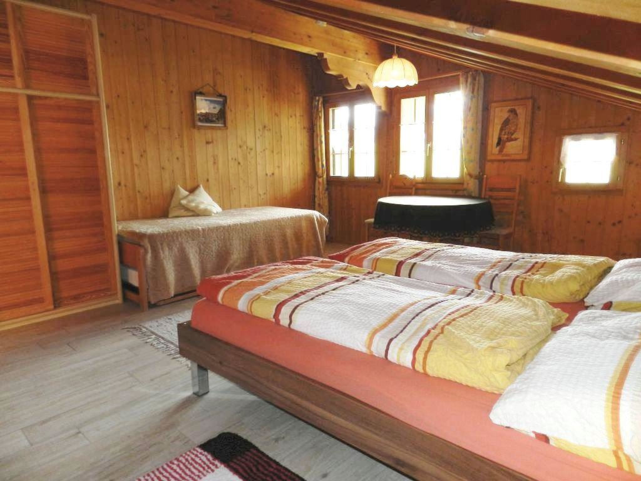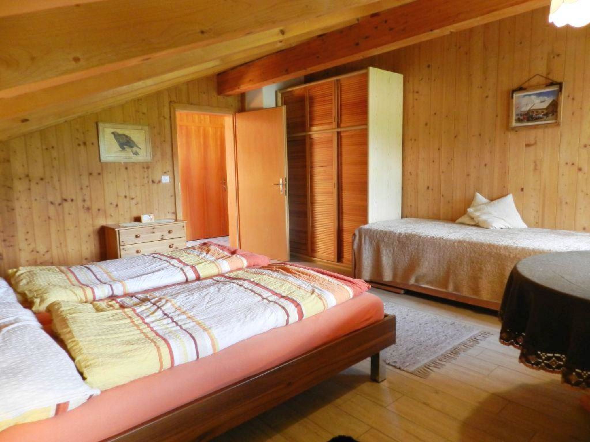 Wohn-/Esszimmer mit offener Küche (u.a. ausgestattet mit Keramikherd, Backofen, Mikrowelle, Geschirrspülmaschine, Filterkaffeemaschine sowie Fondue- und Raclette-Set), Esstisch, Ausziehsofa (140x200cm), Schwedenofen, Radio und TV. 1 Schlafzimmer mit 1 Doppelbett (2x90x200cm), 1 Einzelbett (90x200cm) und 1 Unterziehbett (90x200cm). 1 Badezimmer mit Badewanne und WC. WiFi vorhanden. Kinderbett (70x140cm) inkl. Bettwäsche und Kinderhochstuhl vorhanden.
