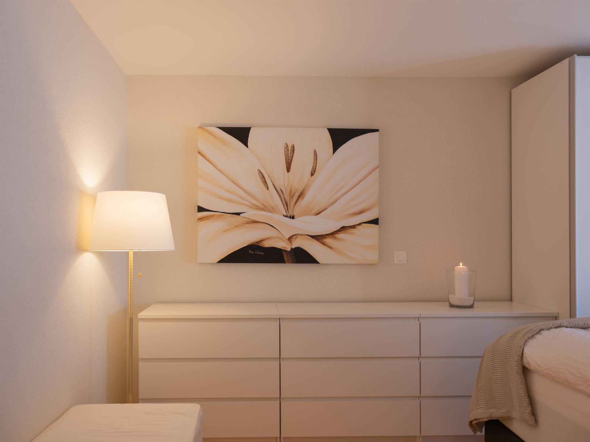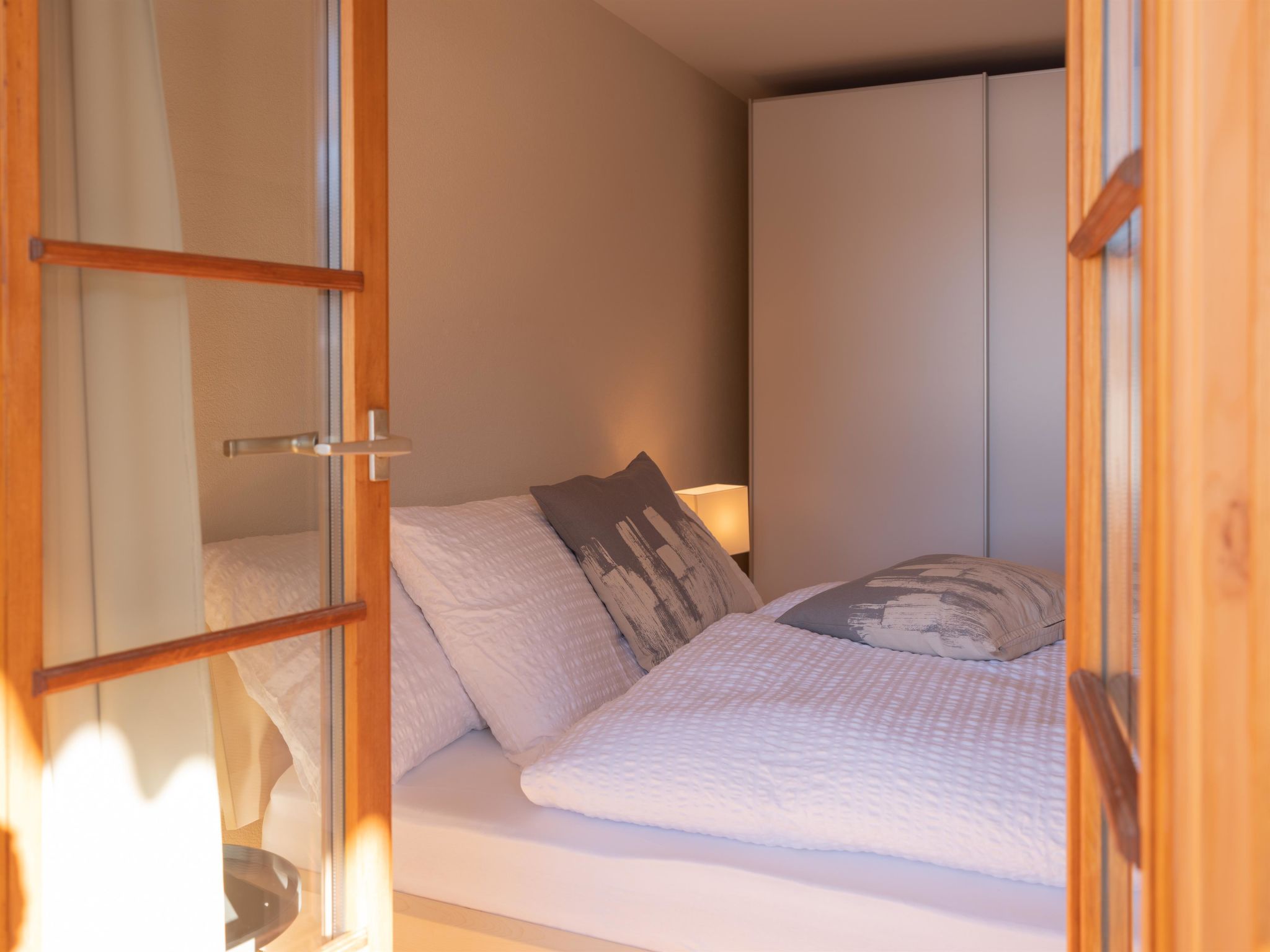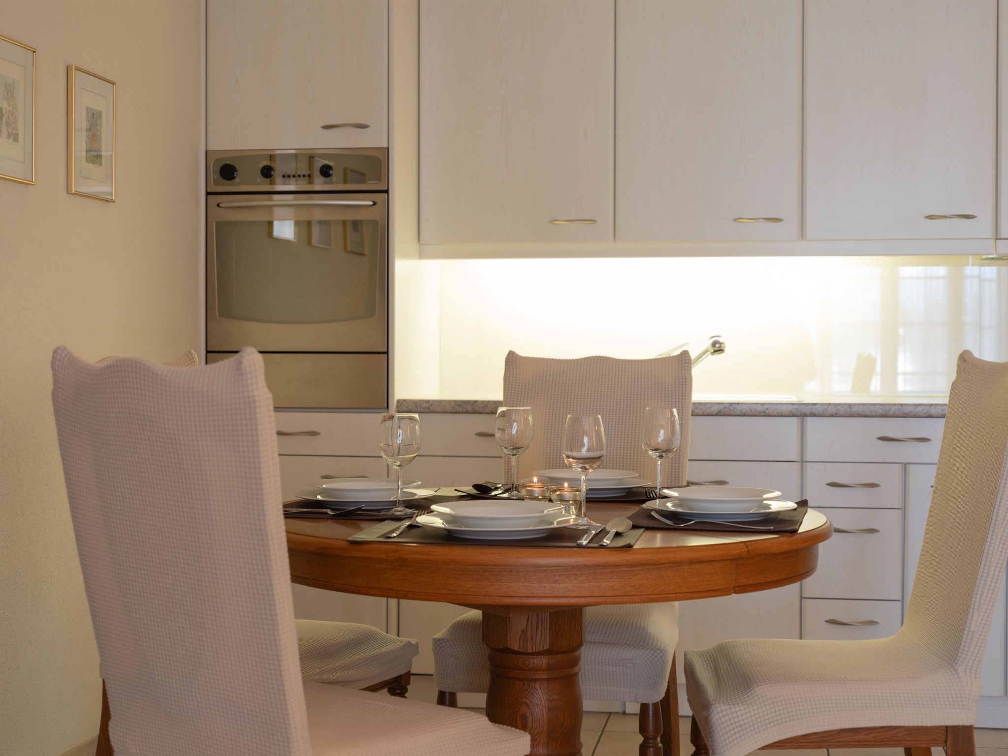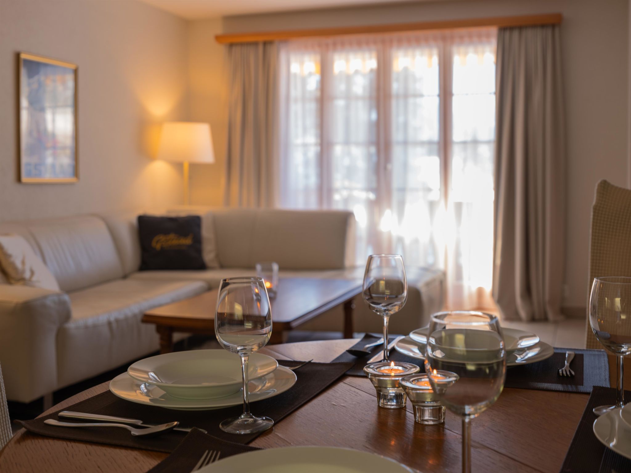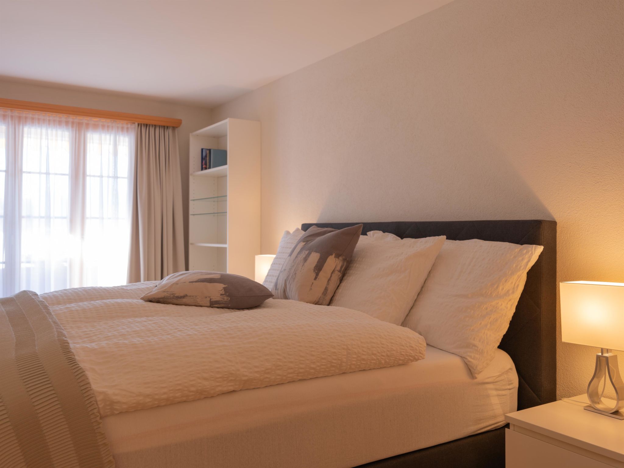 Helles Wohn-/Esszimmer mit offener Küche (u.a. ausgestattet mit Keramikherd, Backofen, Kühlschrank mit Gefrierfach, Geschirrspülmaschine, Kapsel-Kaffeemaschine (Nespresso) sowie Fondue- und Raclette-Set), Esstisch, Sitzgruppe und TV. 1 Schlafzimmer mit 1 Grand Lit (160x200cm) und Balkonzugang. 1 Schlafzimmer mit 1 Grand Lit (160x200cm), Balkonzugang und Badezimmer mit Badewanne/WC. 1 separates Badezimmer mit Dusche/WC. Die ganze Wohnung verfügt über eine in allen Zimmern individuell regulierbare Bodenheizung. WiFi. Kinderbett (60x120cm) inkl. Bettwäsche und Kinderhochstuhl vorhanden.