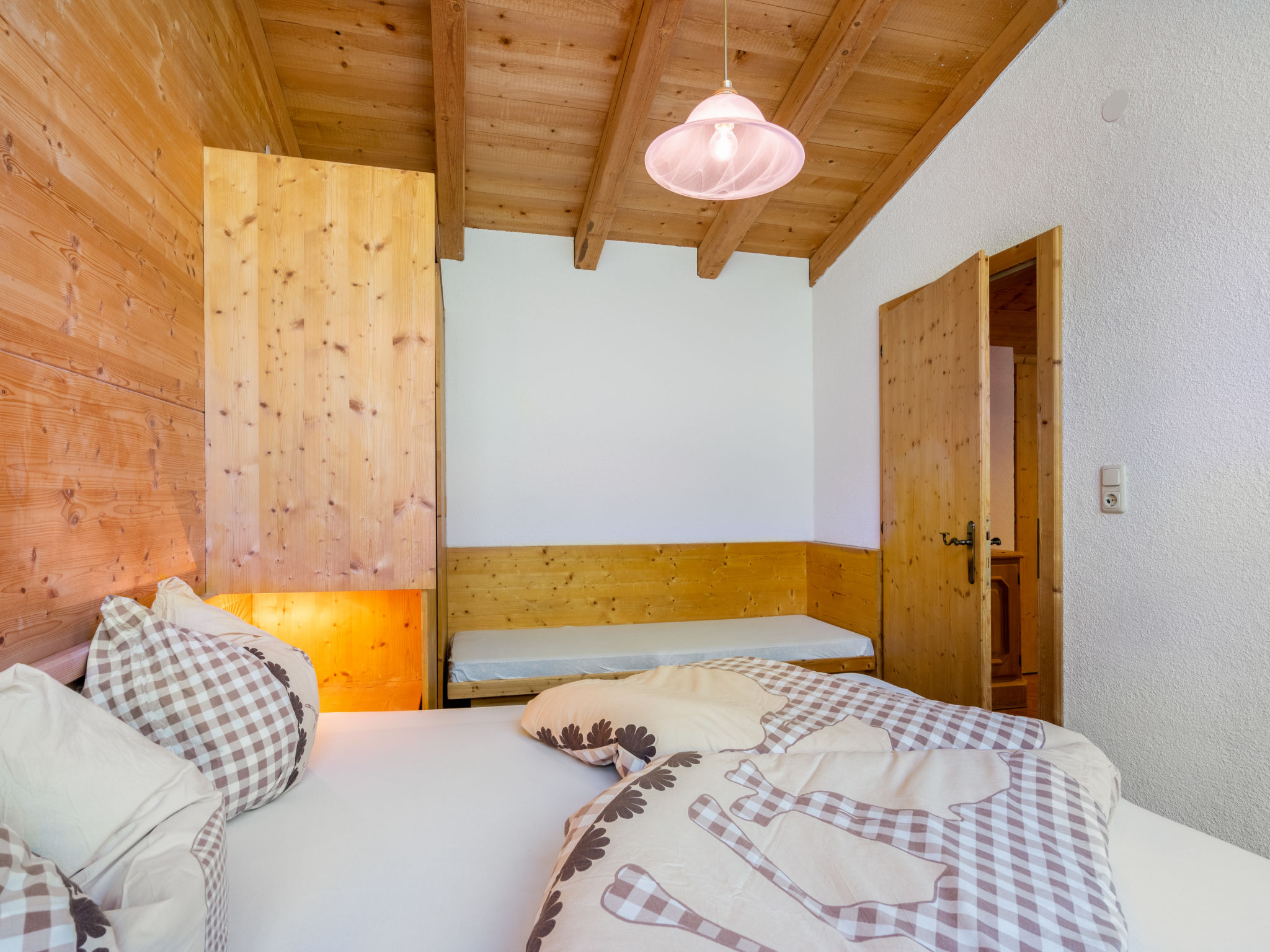 3-Zimmer-Wohnung, Dachgeschoss, ca. 54 m². Wohnküche (4 Platten, Backofen, Geschirrspüler, Kühlschrank, Kaffeemaschine) mit Essplatz. 2 Schlafzimmer, jeweils mit Doppelbett und Bettcouch (ca. 0,65 m breit). Dusche. Sep.WC. Bei Belegung mit weniger Personen als der maximalen Personenzahl stehen nicht alle Wohneinheiten zur Verfügung.