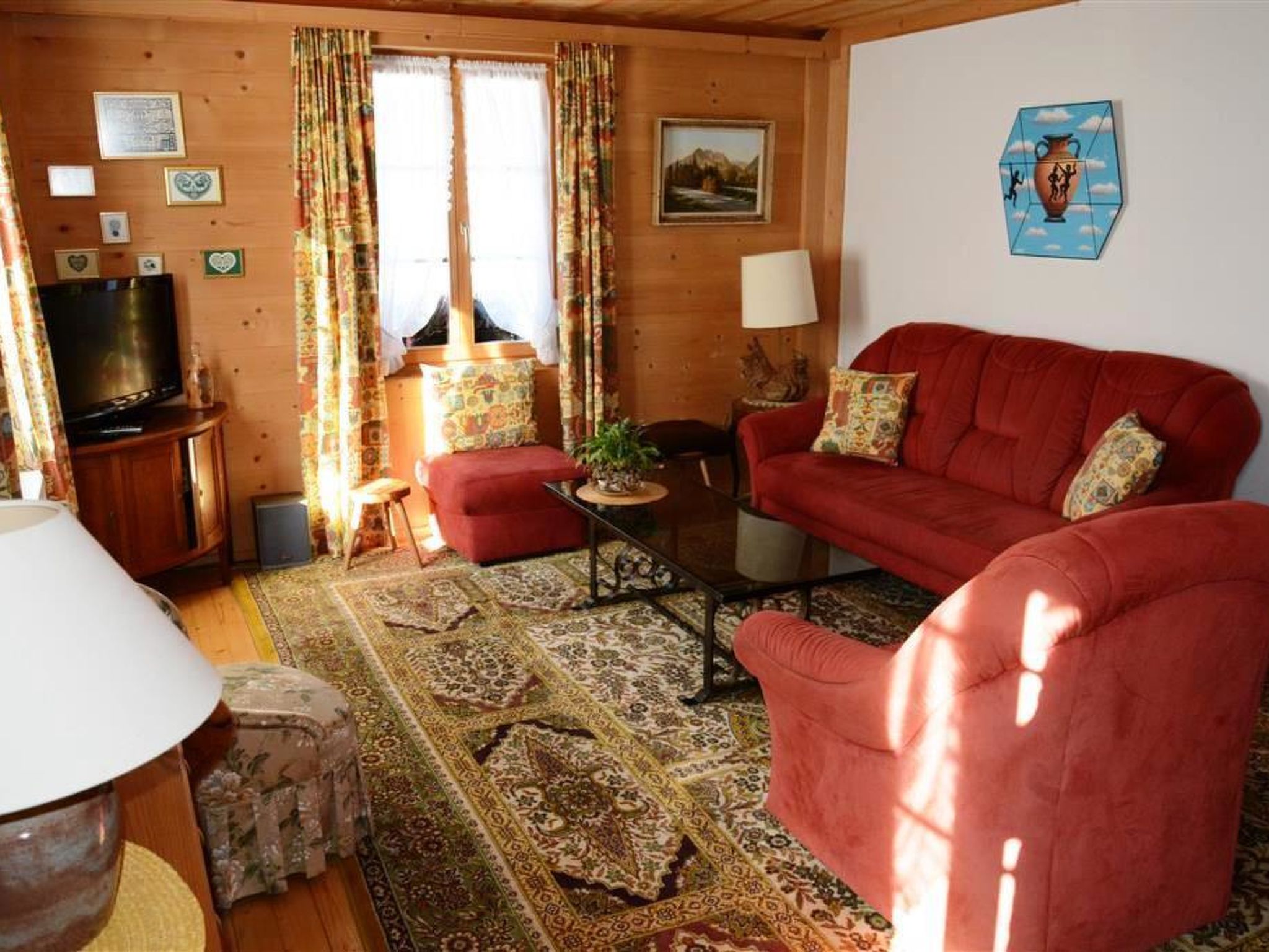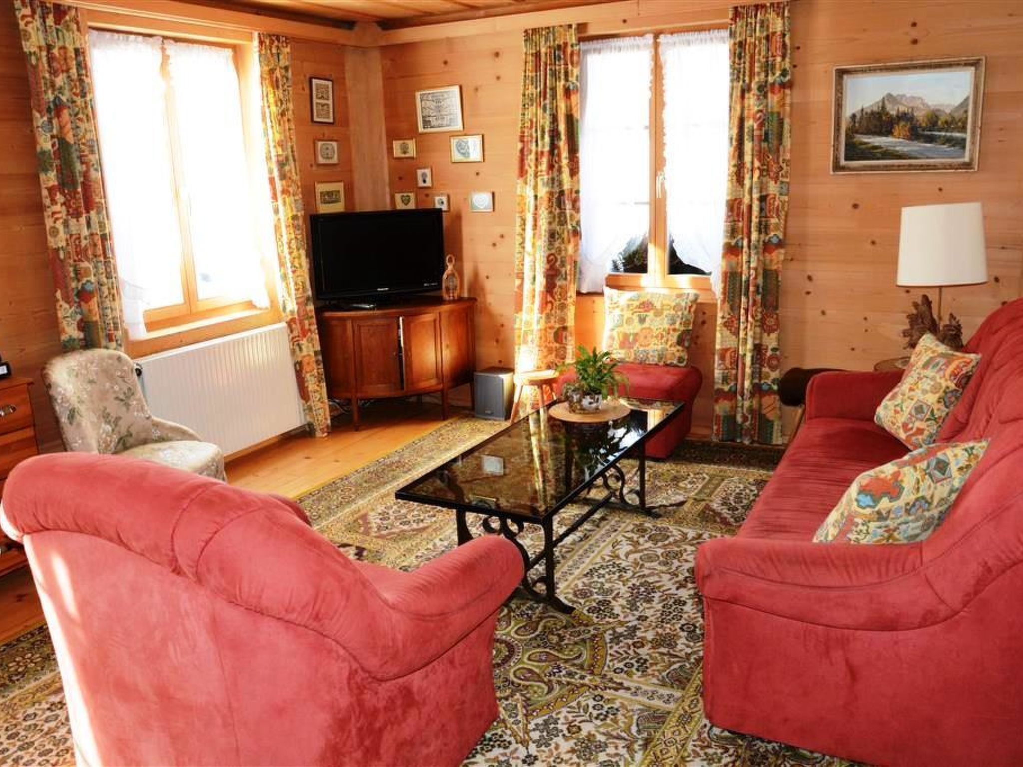 Ein einfach eingerichtetes Doppelschlafzimmer (180x200cm) mit Schrank, ein einfaches Schlafzimmer mit 2 Betten (à 90x200cm). Grosses rustikal möbliertes Wohnzimmer mit typischen Saanen-Schnitzereien, Polstergruppe, Radio/TV/Video und Tisch mit Stühlen. Separate Küche ausgestattet mit Keramik Herd, Geschirrspüler, Backofen, Kühlschrank mit Gefrierfach, Filter-Kaffeemaschine, Fondue-Set, Raclette-Set (auf Anfrage) und Esstisch. Badezimmer mit Badewanne und WC. Nichtraucher-Wohnung! Kinderbett (70x120cm) inkl. Bettwäsche vorhanden.