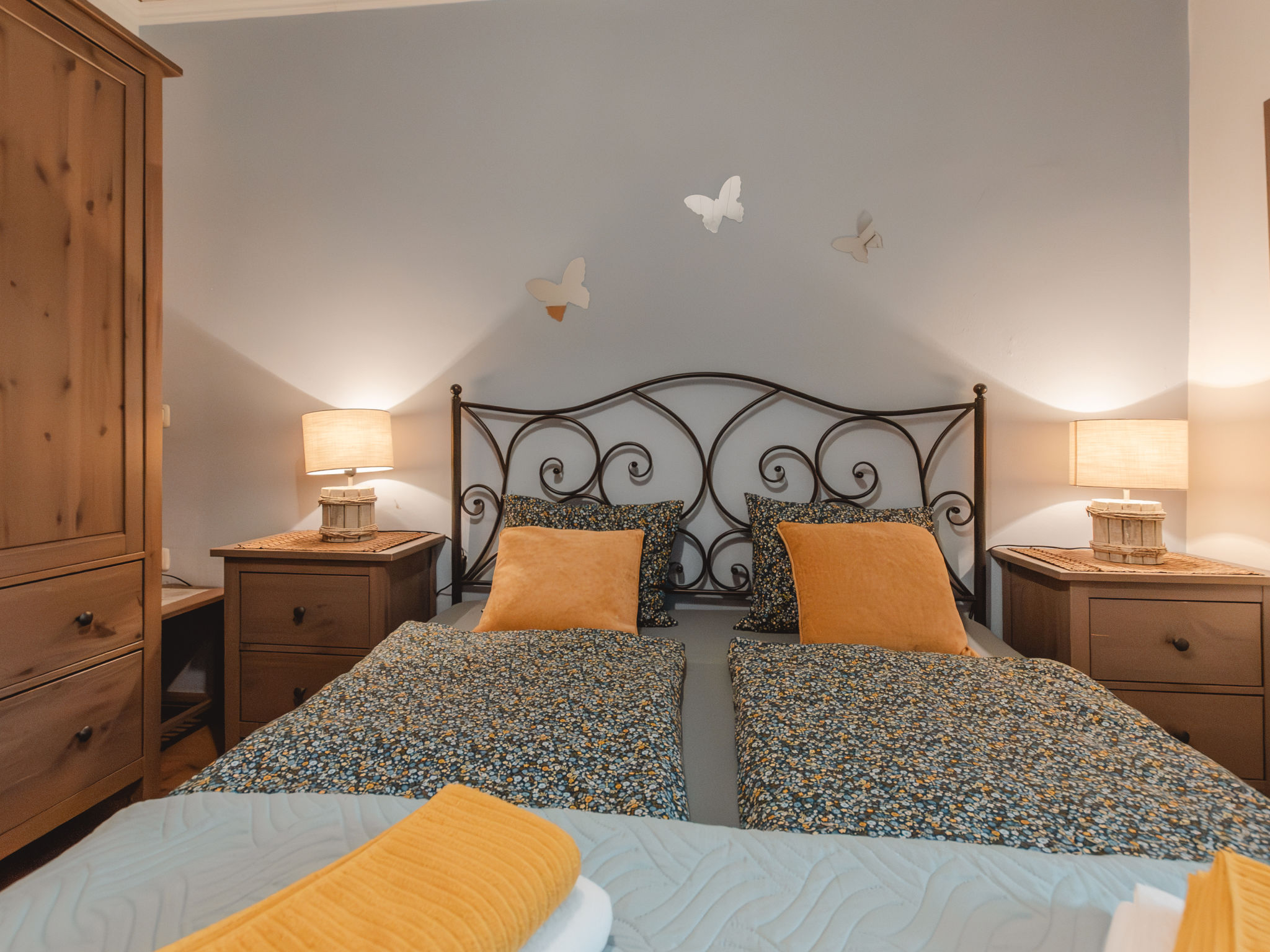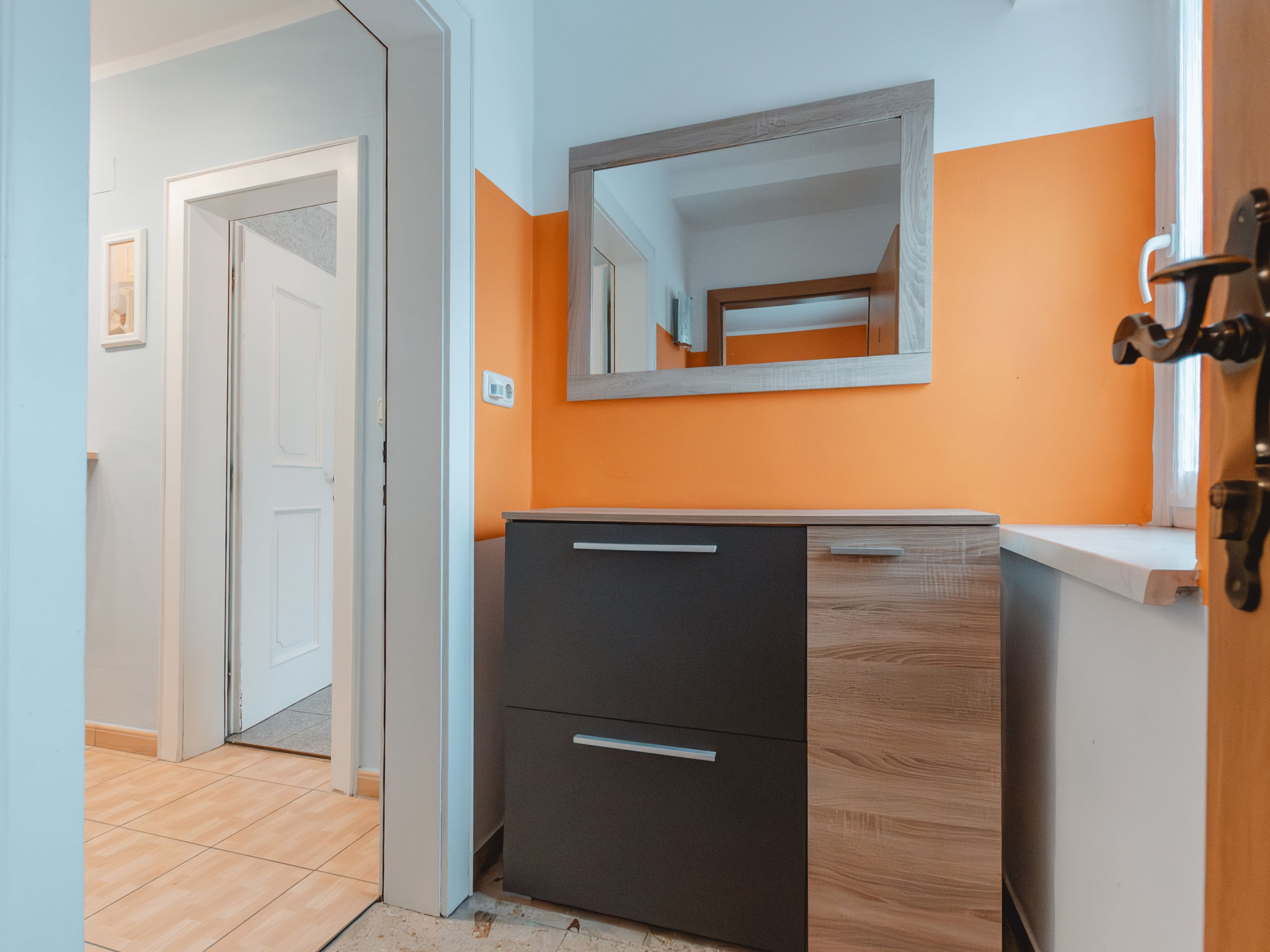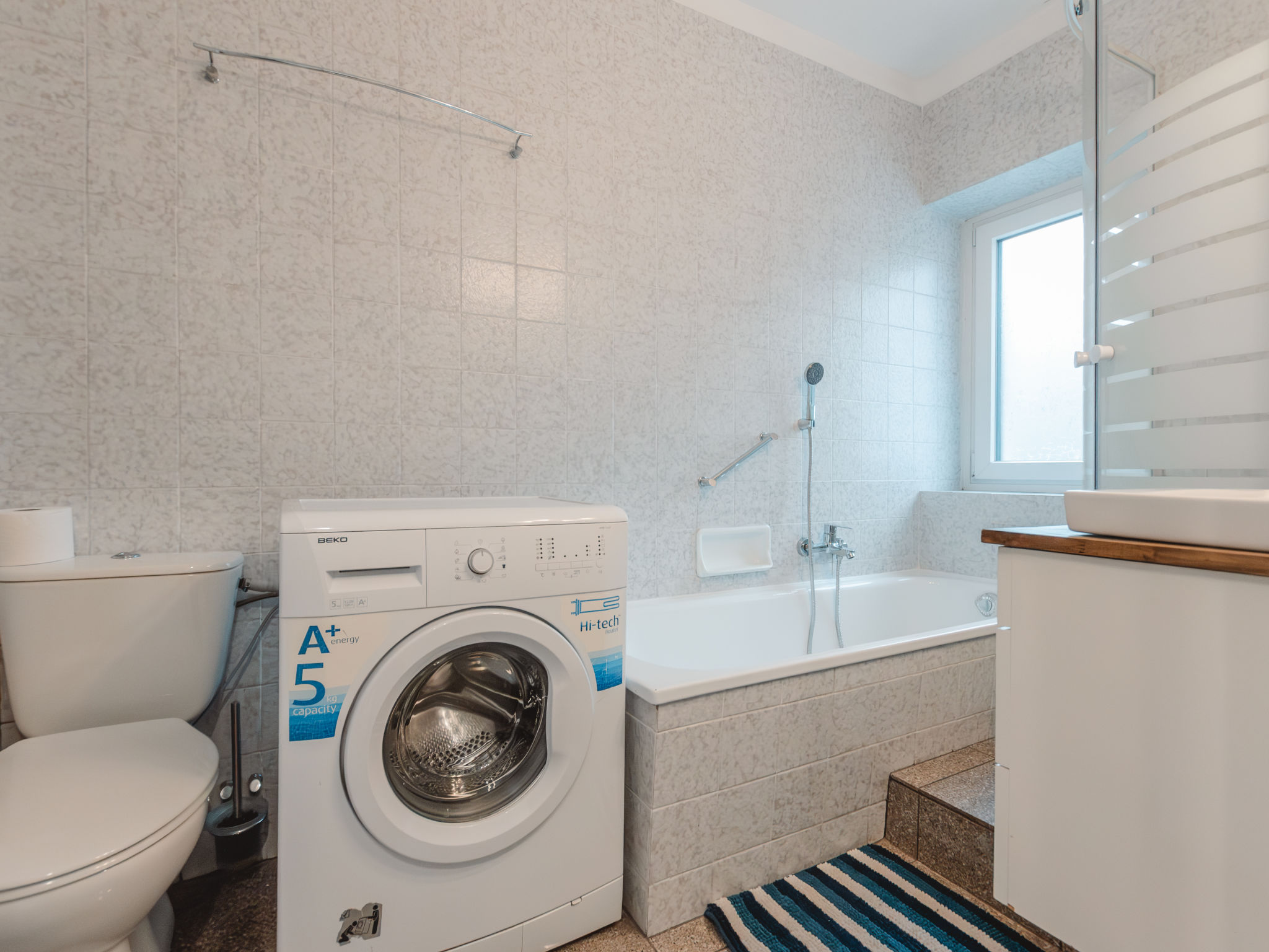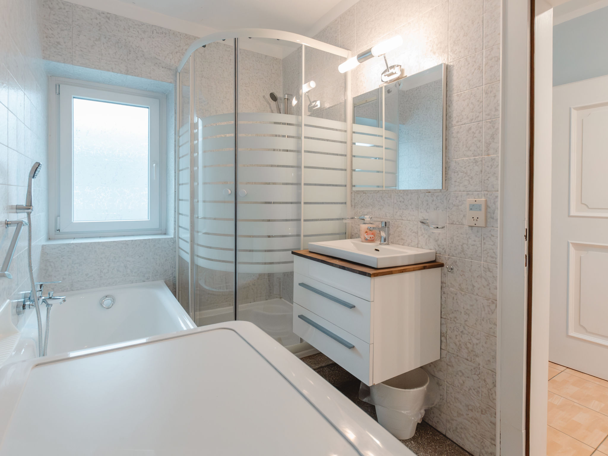 3-Zimmer-Wohnung 67 m2, im Erdgeschoss. Geräumig, vollständig renoviert im Jahre 2013, modern eingerichtet: Eingang. Wohn-/Esszimmer mit 1 Doppeldiwanbett (1 x 150 cm, Länge 200 cm), Esstisch und Sat-TV (Flachbildschirm). Ausgang zum Garten, zur Terrasse. 1 Doppelzimmer mit 1 franz. Bett (160 cm, Länge 200 cm). 1 Zimmer mit 2 Betten. Offene Küche (Backofen, Geschirrspüler, 4 Glaskeramikherd Platten, Toaster, Wasserkocher) mit kleiner Bar. Bad/Dusche/WC. Terrasse 15 m2, Rasen 20 m2. Terrassenmöbel. Herrliche Sicht auf die Berge und die Landschaft. Zur Verfügung: Waschmaschine. Internet (Wireless LAN, gratis). Bitte beachten: Nichtraucher-Unterkunft, Nichtraucher-Haus. 1 Haustier/Hund erlaubt. Achtung: Kleinkinder und Babies gelten als volle Person und können nicht kostenfrei mitgenommen werden. 50403-000215-2020
