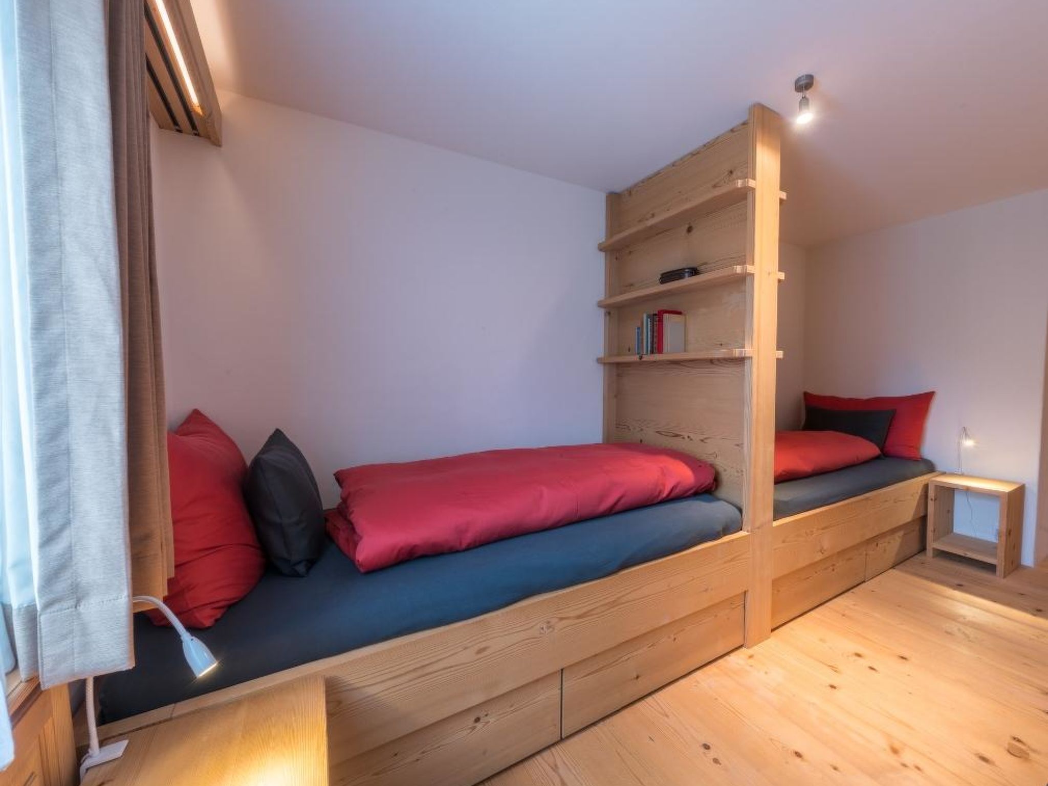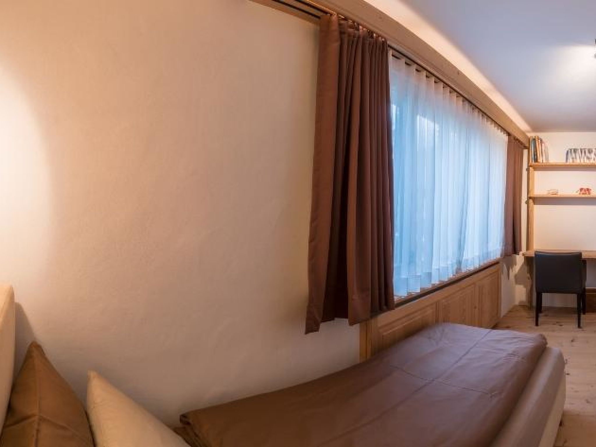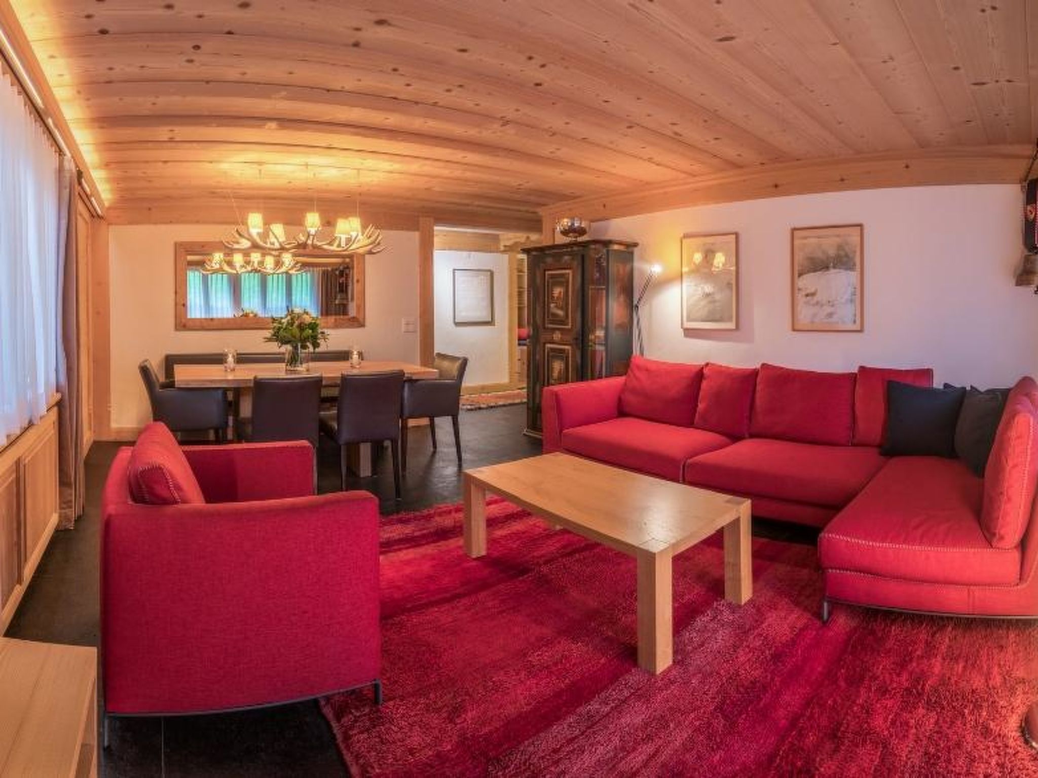 Wohnzimmer mit Sofa, Sessel, einer lederbezogenen Bank und passenden Stühlen dazu. Grossformatiger 3D LCD-Fernseher, Heimkinosystem/DVD/Stereoanlage. Digital-Kabelanschluss inkl. HDTV-Sendern. Musikauswahl auf iPod. WiFi. 1 Doppelschlafzimmer mit Grandlit (2x90x200cm), LCD-Fernseher mit DVD und Digitalkabelanschluss, Schreibtisch mit iMac, 3 Wandschränke und Garderobe. 1 Schlafzimmer mit 2 Einzelbetten (90x200cm) und 2 Wandschränken. 1 Schlafzimmer mit 2 Einzelbetten (80x200cm), kann auch als Doppelbett genutzt werden, 1 Schreibtisch und 2 Wandschränke, direkter Zugang zum Bad. 1 Badezimmer mit Badewanne/WC, 1 Badezimmer mit Regendusche/WC. Modern eingerichtete Küche (u.a. ausgestattet mit Kapsel-Kaffeemaschine (Nespresso), Filterkaffeemaschine, Fondue- und Raclette-Set. Kinderbett (60x120cm) inkl. Bettwäsche und Kinderhochstuhl vorhanden.