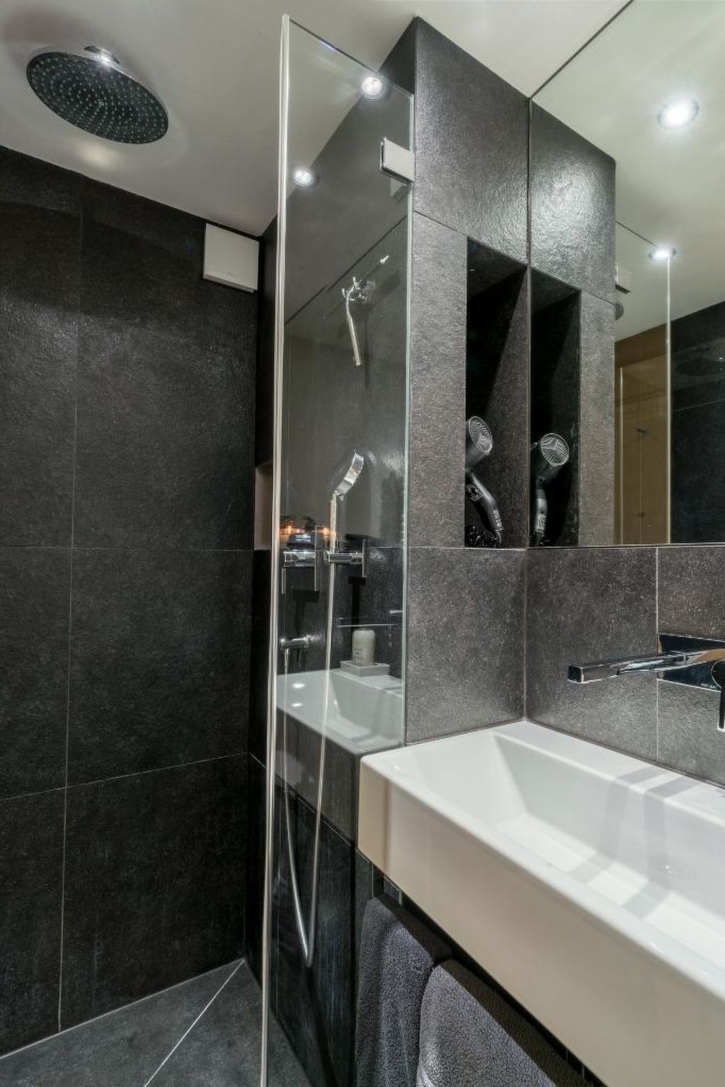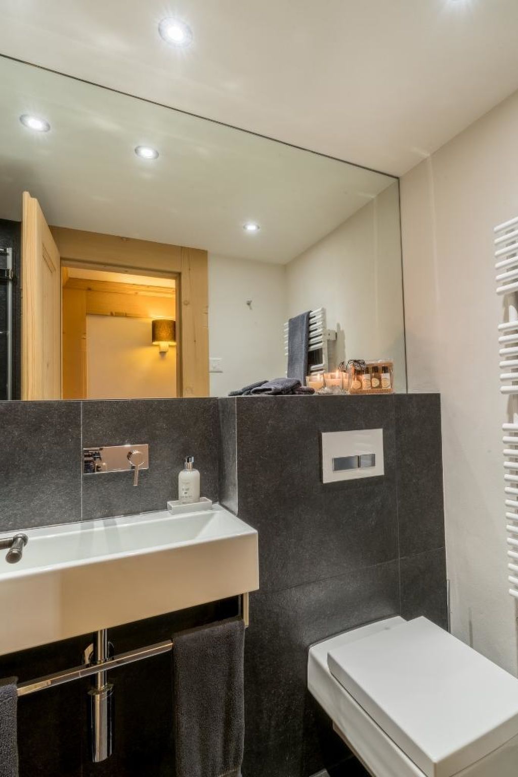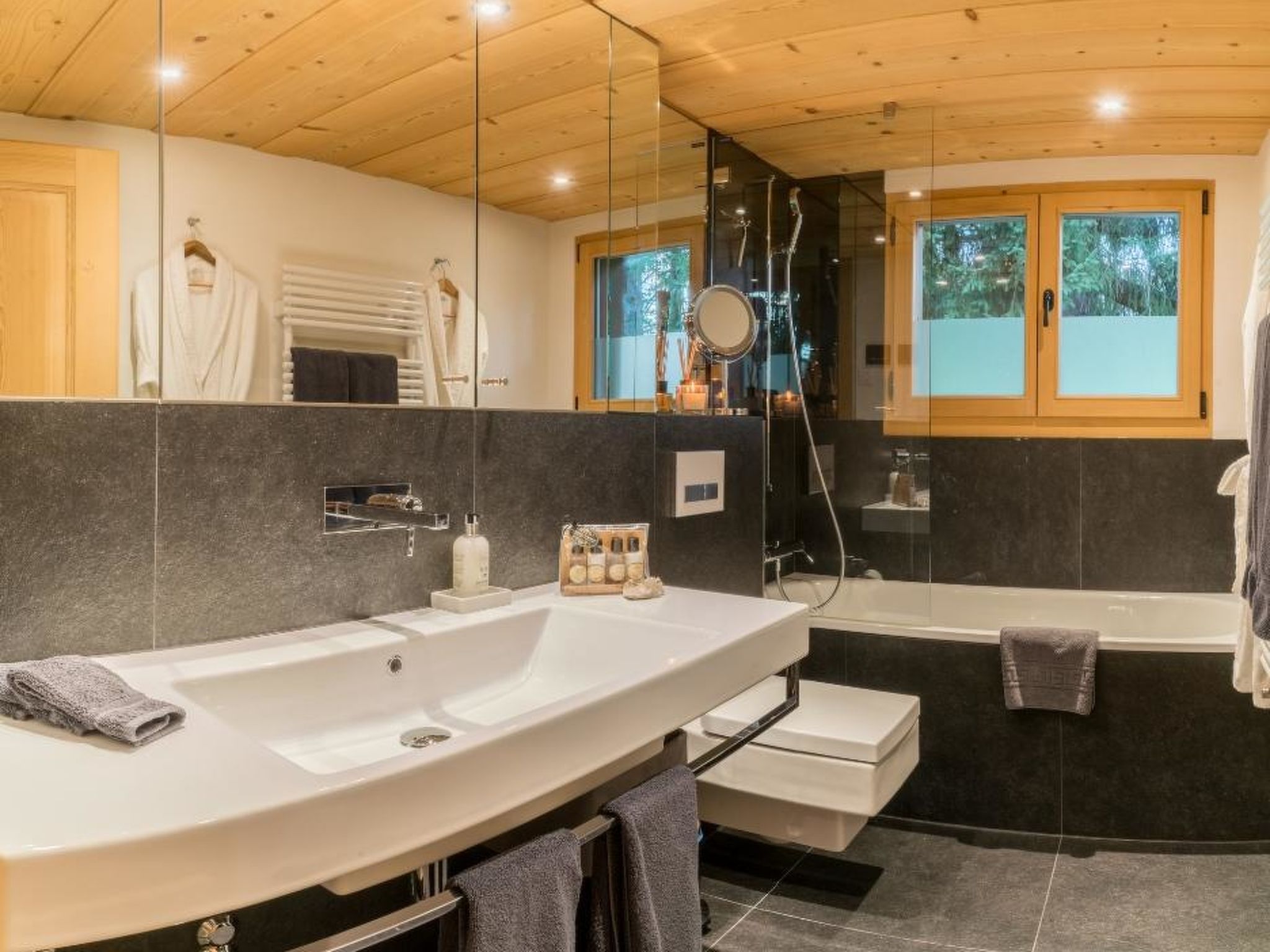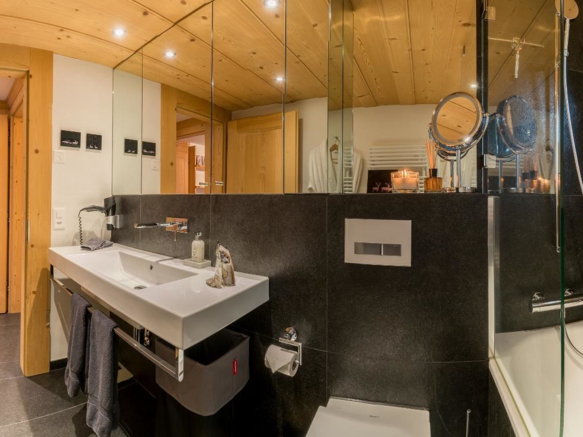 Wohnzimmer mit Sofa, Sessel, einer lederbezogenen Bank und passenden Stühlen dazu. Grossformatiger 3D LCD-Fernseher, Heimkinosystem/DVD/Stereoanlage. Digital-Kabelanschluss inkl. HDTV-Sendern. Musikauswahl auf iPod. WiFi. 1 Doppelschlafzimmer mit Grandlit (2x90x200cm), LCD-Fernseher mit DVD und Digitalkabelanschluss, Schreibtisch mit iMac, 3 Wandschränke und Garderobe. 1 Schlafzimmer mit 2 Einzelbetten (90x200cm) und 2 Wandschränken. 1 Schlafzimmer mit 2 Einzelbetten (80x200cm), kann auch als Doppelbett genutzt werden, 1 Schreibtisch und 2 Wandschränke, direkter Zugang zum Bad. 1 Badezimmer mit Badewanne/WC, 1 Badezimmer mit Regendusche/WC. Modern eingerichtete Küche (u.a. ausgestattet mit Kapsel-Kaffeemaschine (Nespresso), Filterkaffeemaschine, Fondue- und Raclette-Set. Kinderbett (60x120cm) inkl. Bettwäsche und Kinderhochstuhl vorhanden.