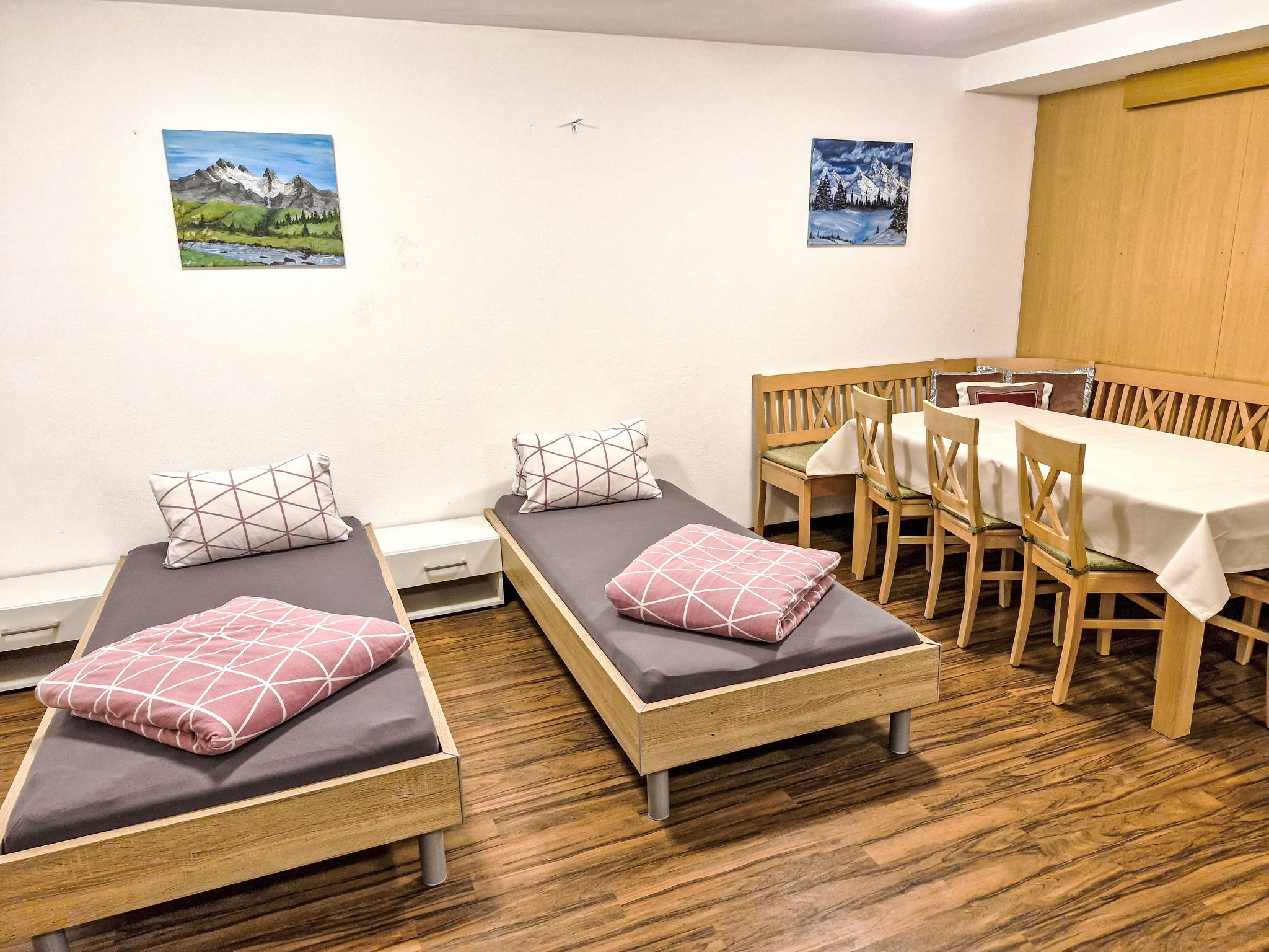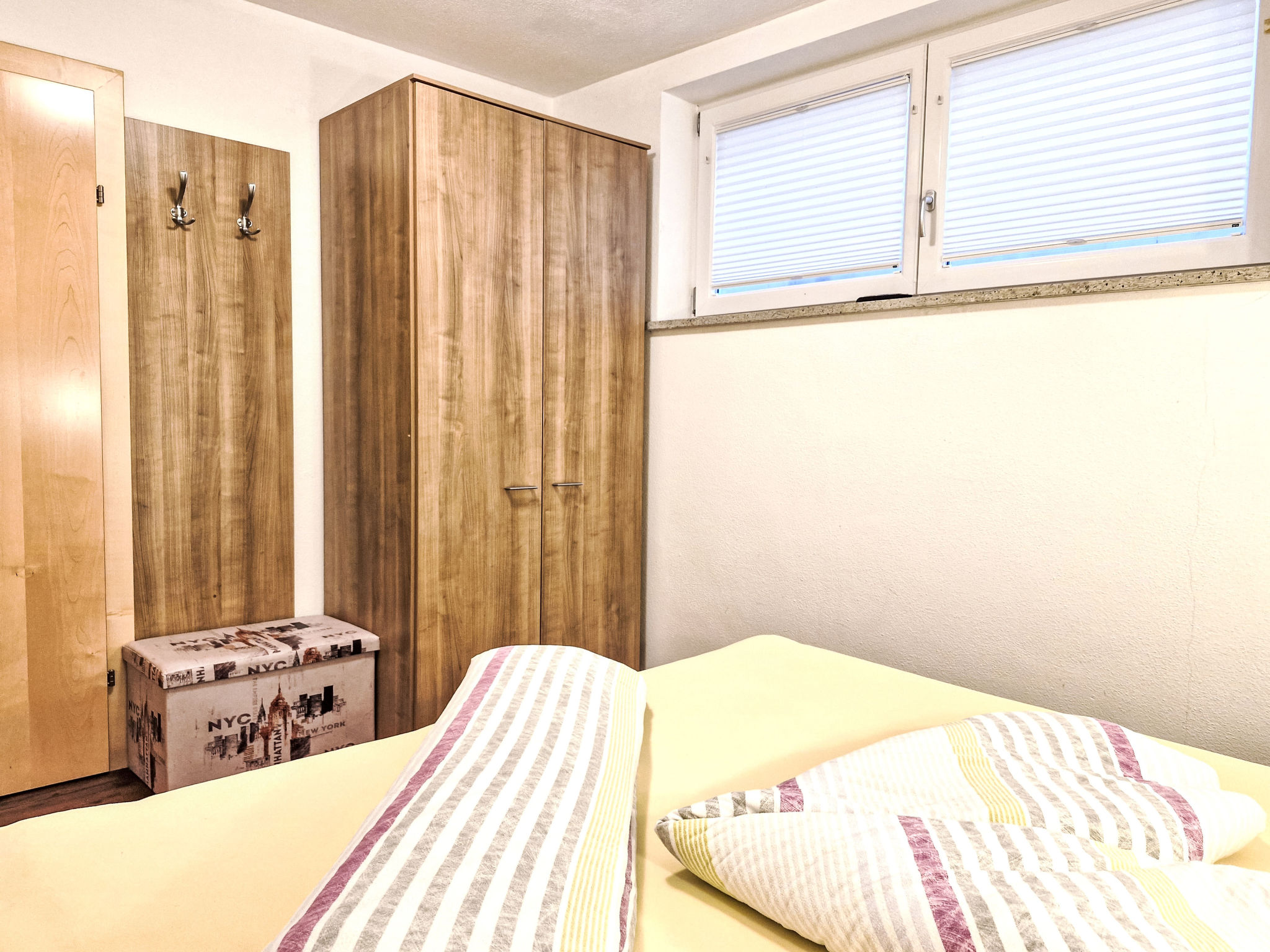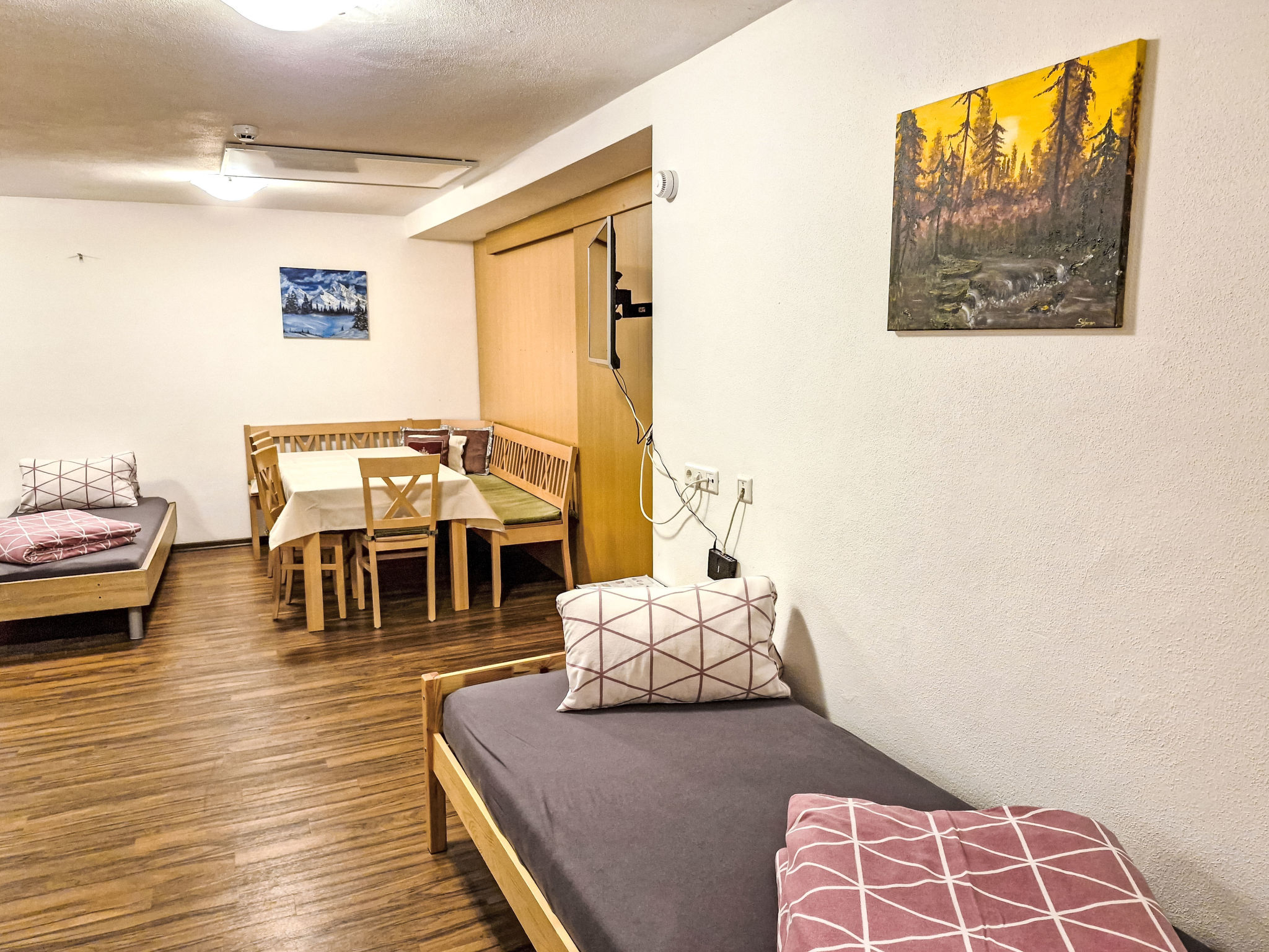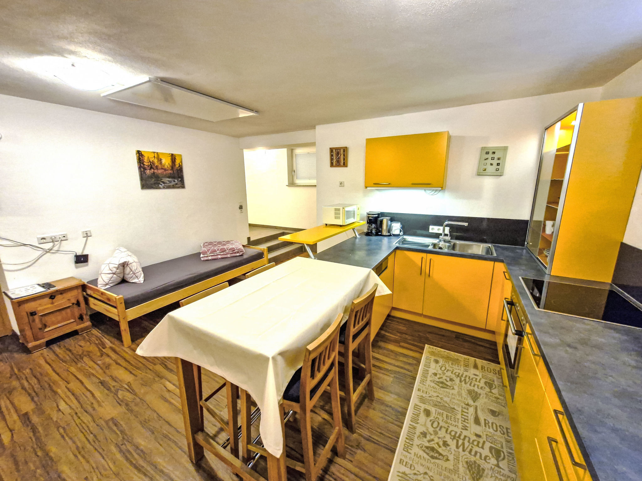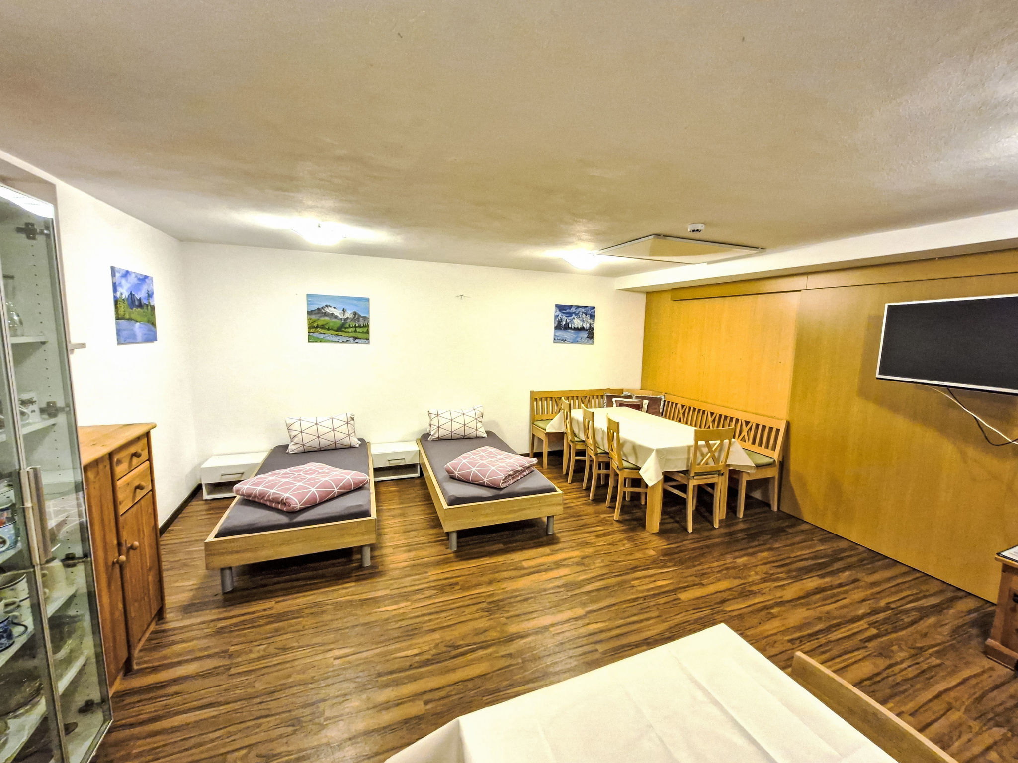 2-Zimmer-Wohnung 'Opal', Untergeschoss (Schachtfenster), ca. 45 m². Wohnküche mit Essplatz (Eckbank) und 3 Einzelbetten. Sep. WC. Außerhalb der Wohnung: Doppelzimmer mit Dusche/WC.