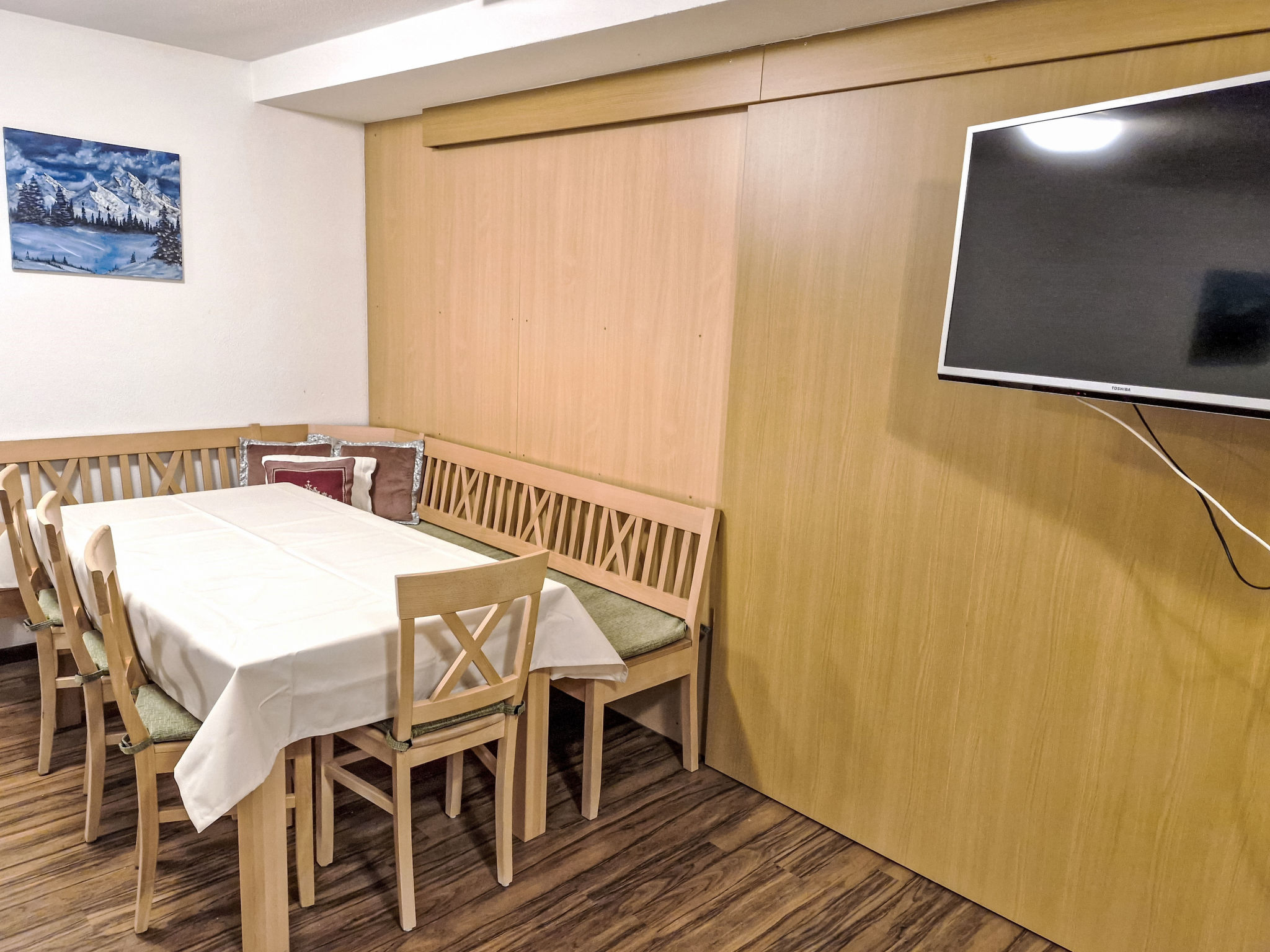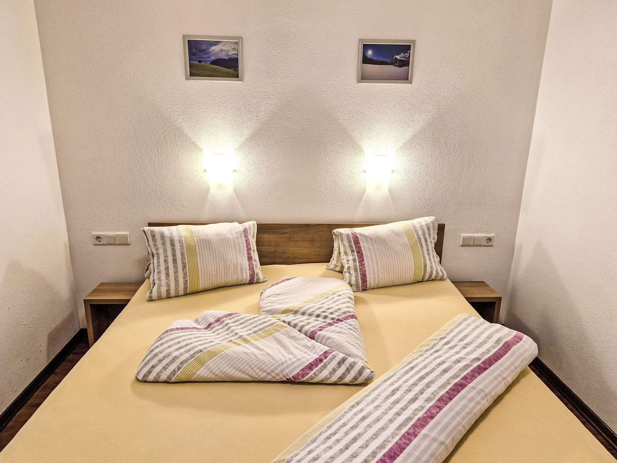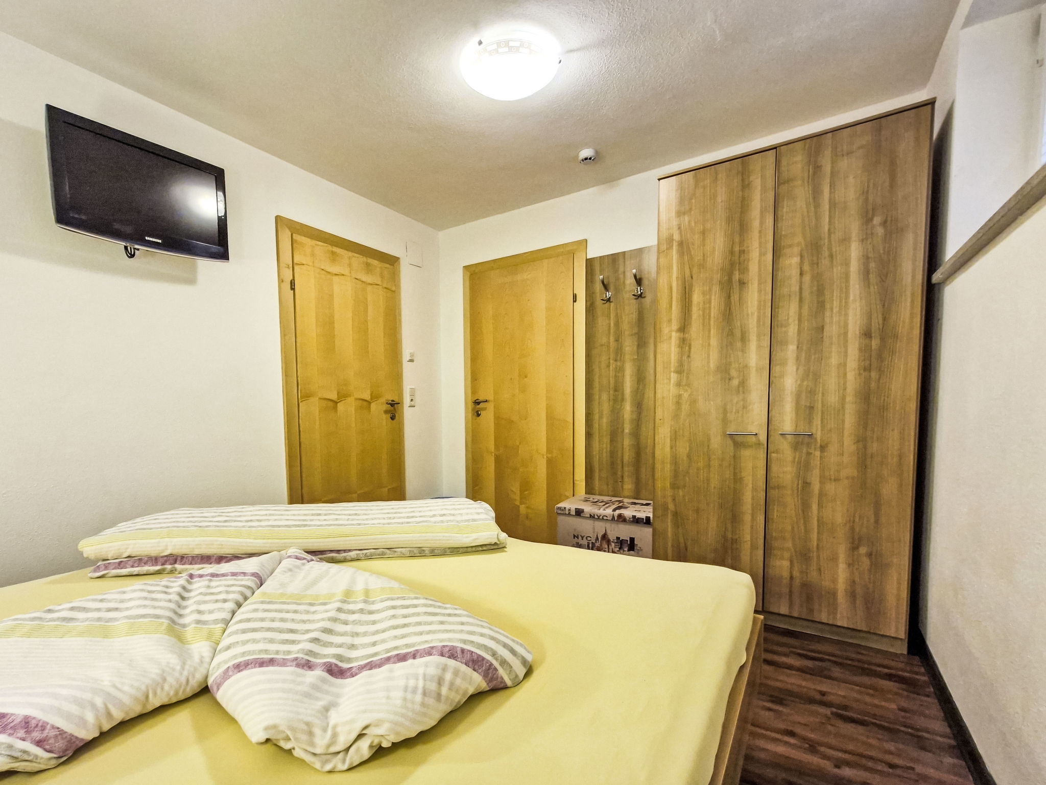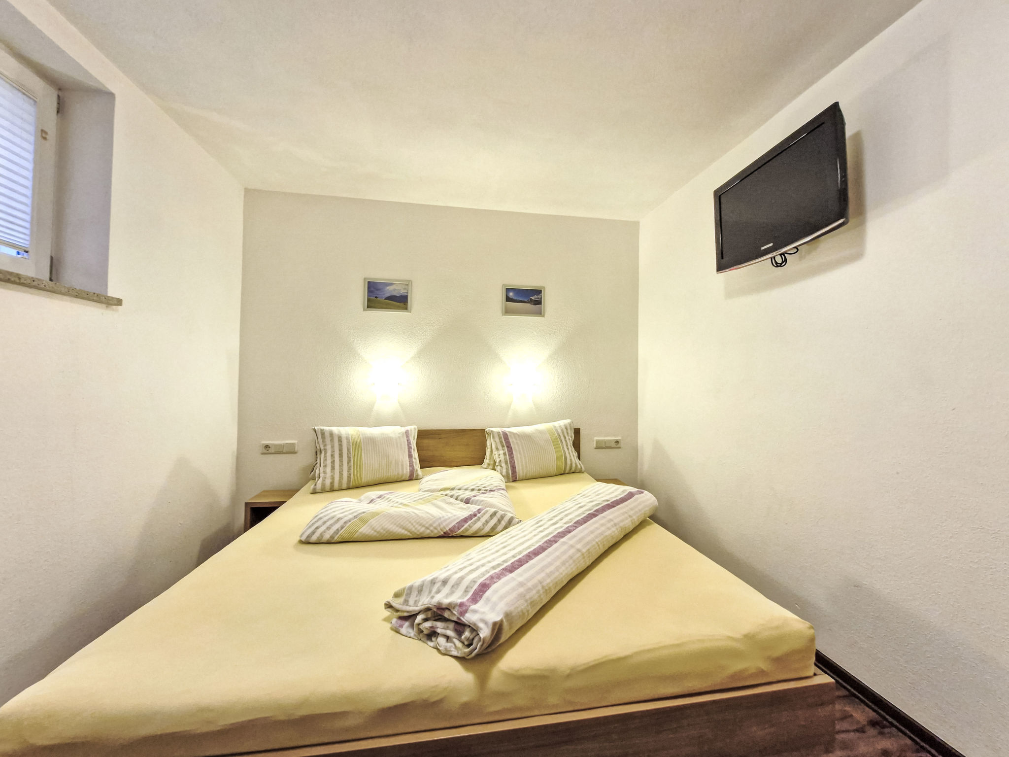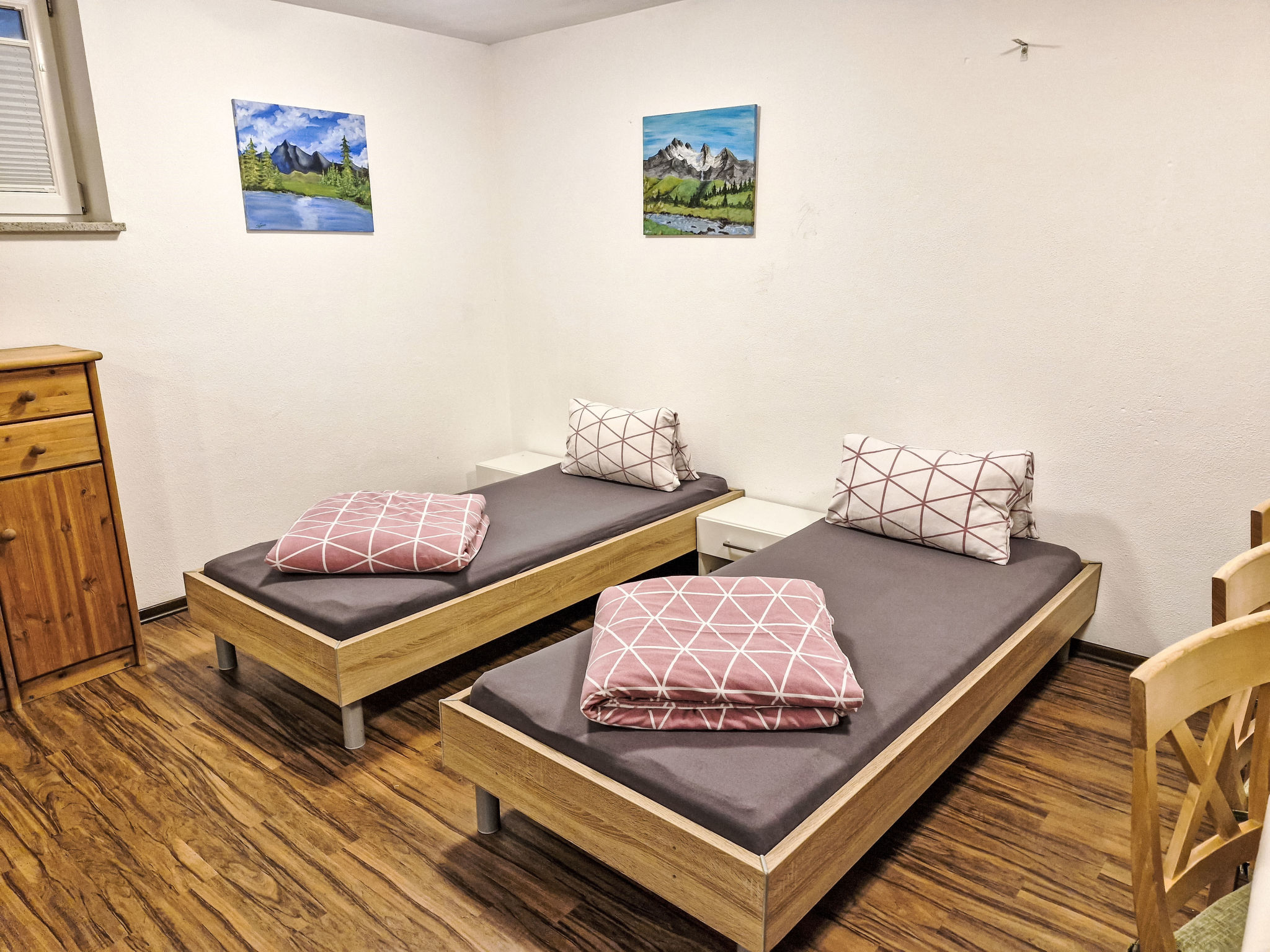 2-Zimmer-Wohnung 'Opal', Untergeschoss (Schachtfenster), ca. 45 m². Wohnküche mit Essplatz (Eckbank) und 3 Einzelbetten. Sep. WC. Außerhalb der Wohnung: Doppelzimmer mit Dusche/WC.