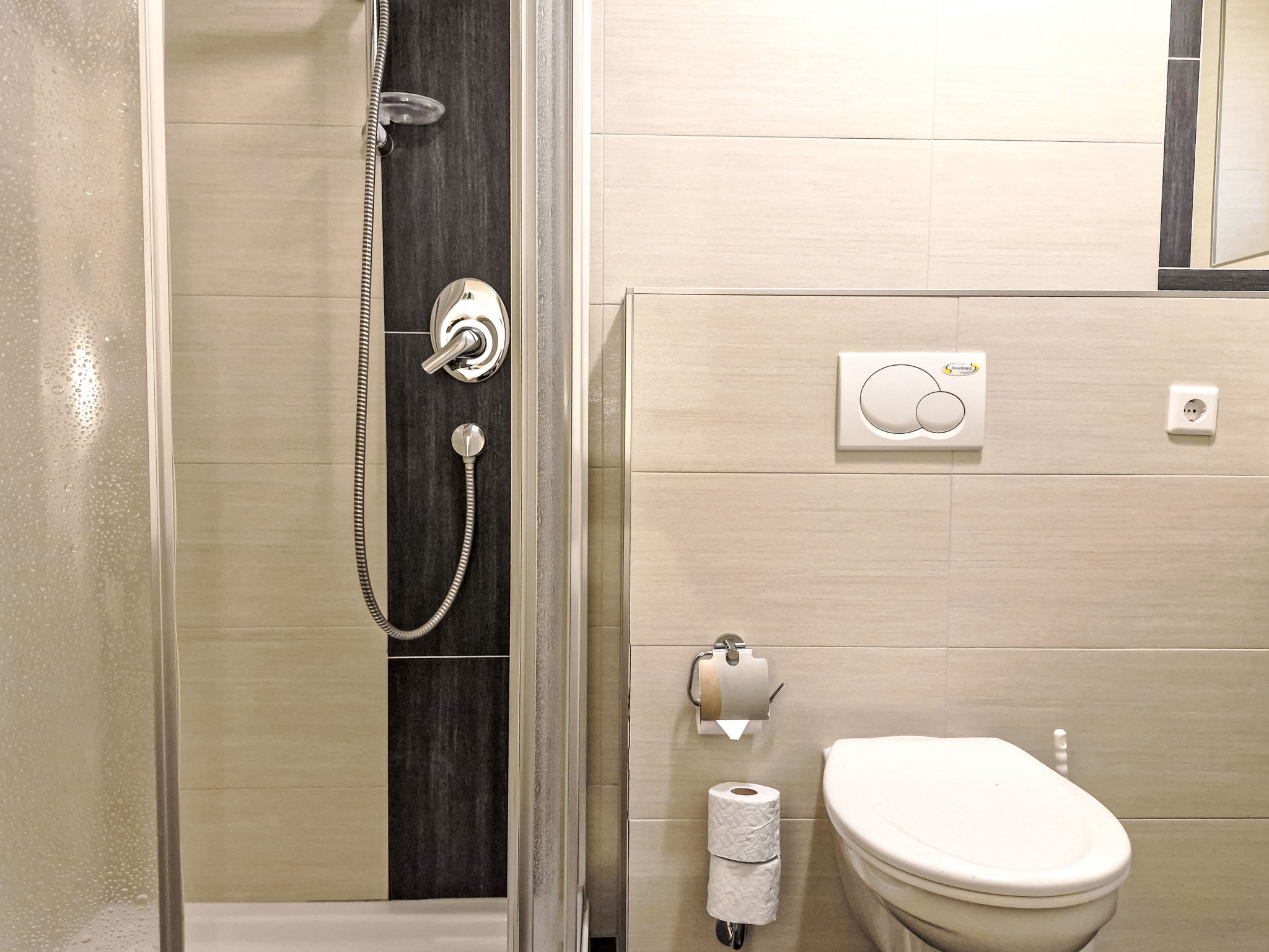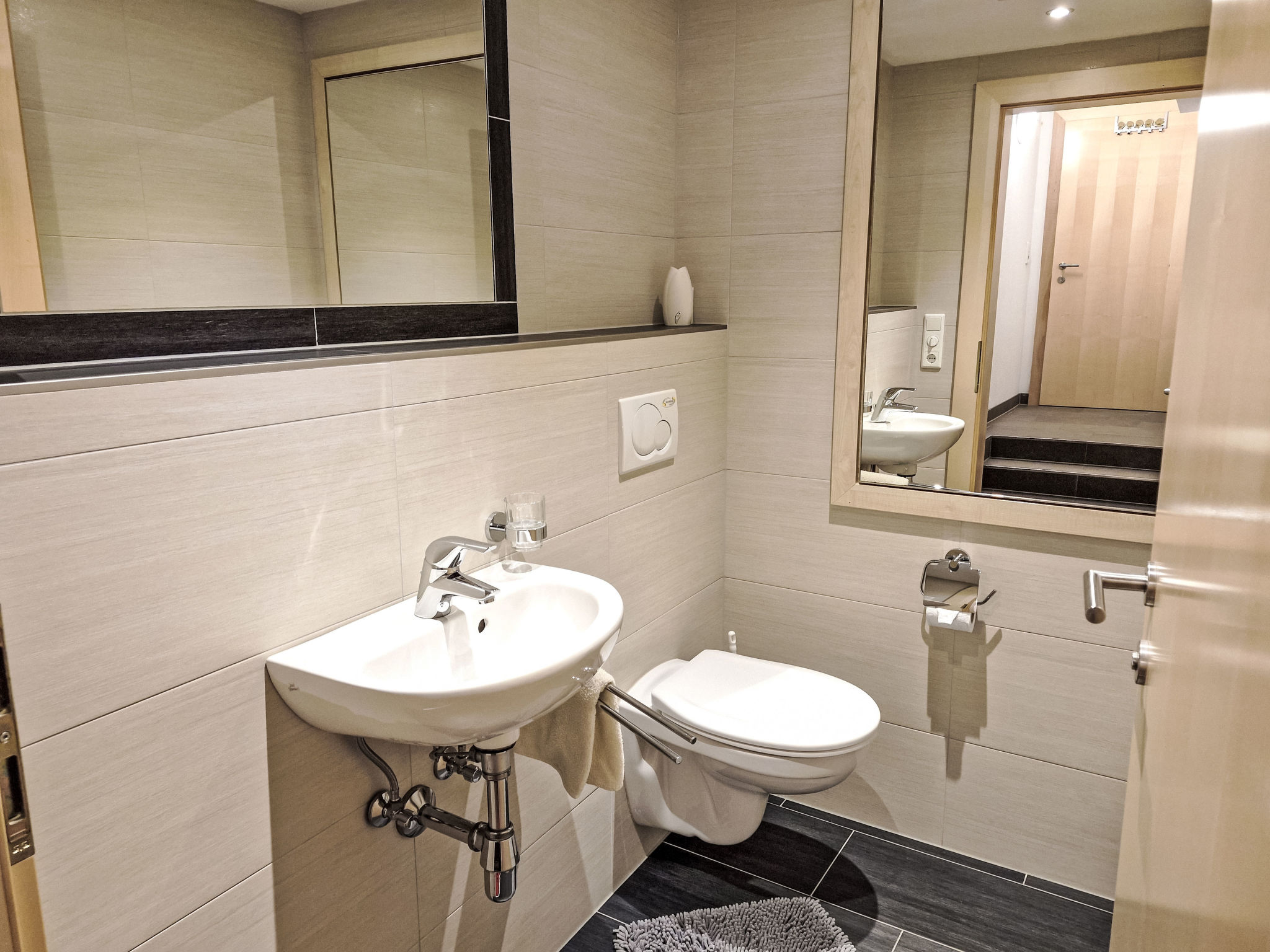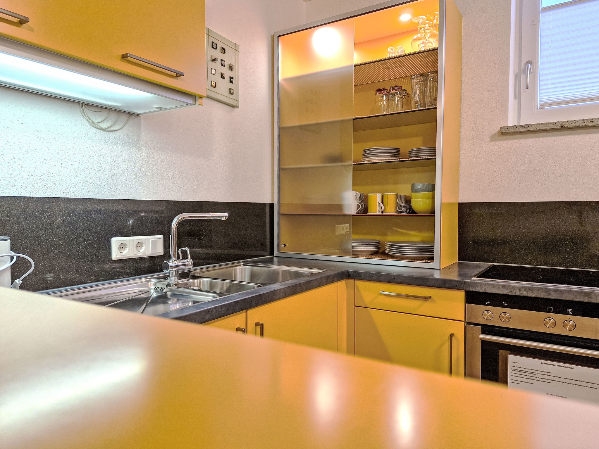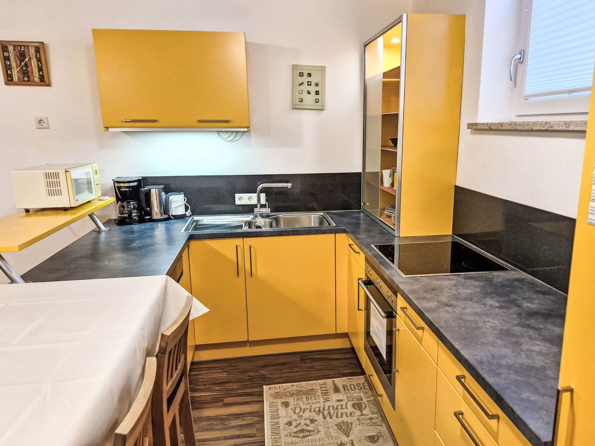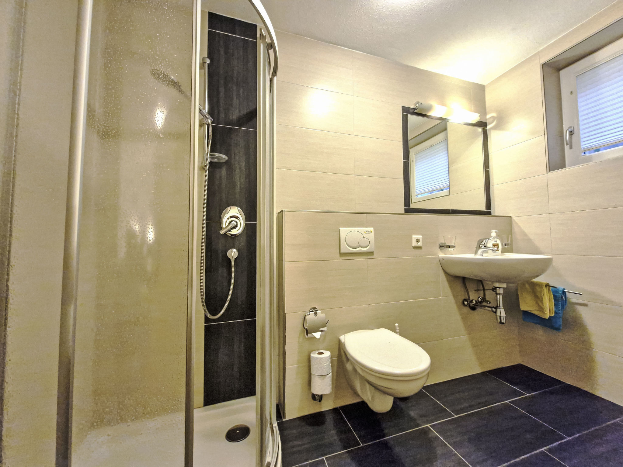 2-Zimmer-Wohnung 'Opal', Untergeschoss (Schachtfenster), ca. 45 m². Wohnküche mit Essplatz (Eckbank) und 3 Einzelbetten. Sep. WC. Außerhalb der Wohnung: Doppelzimmer mit Dusche/WC.