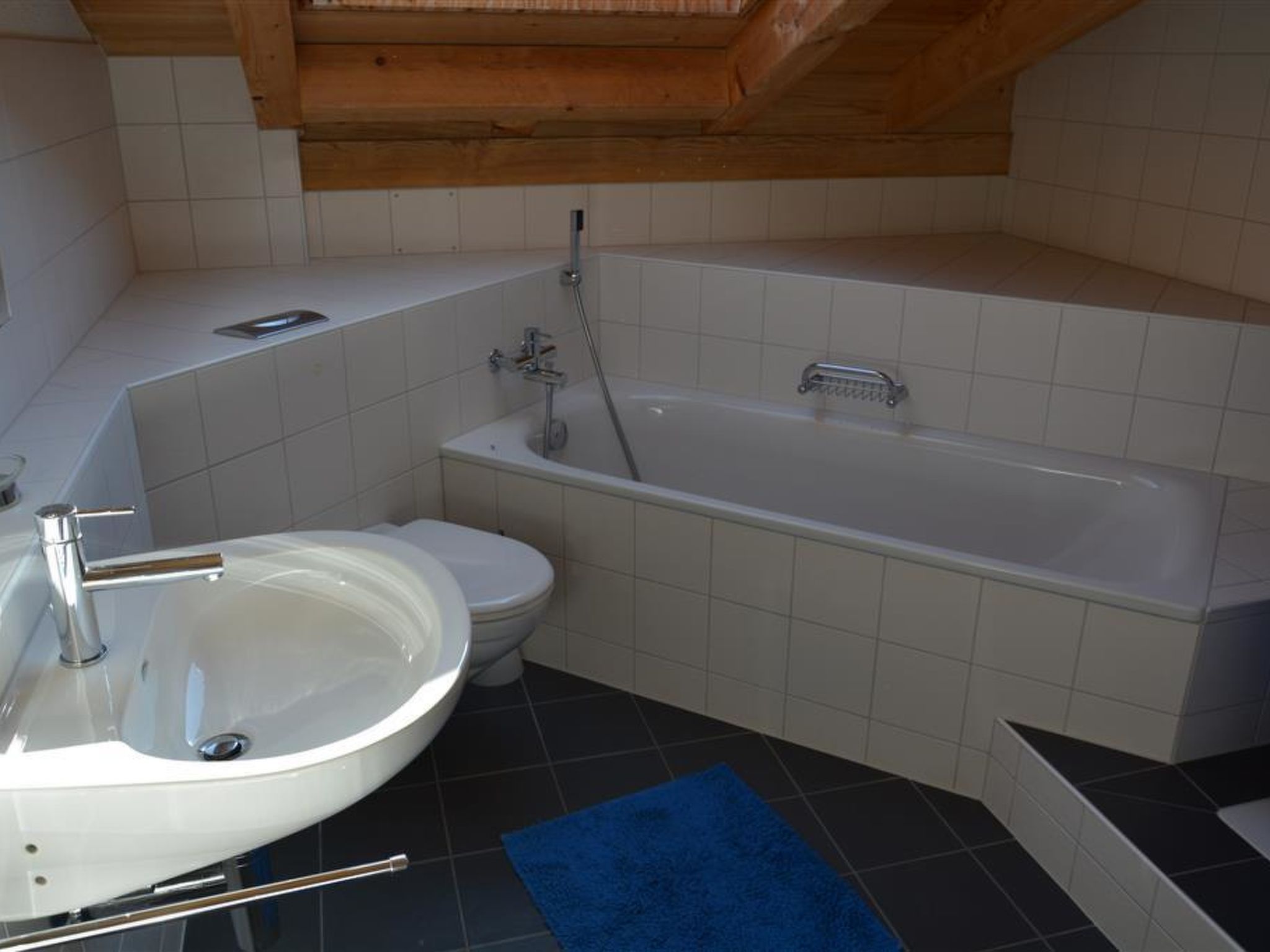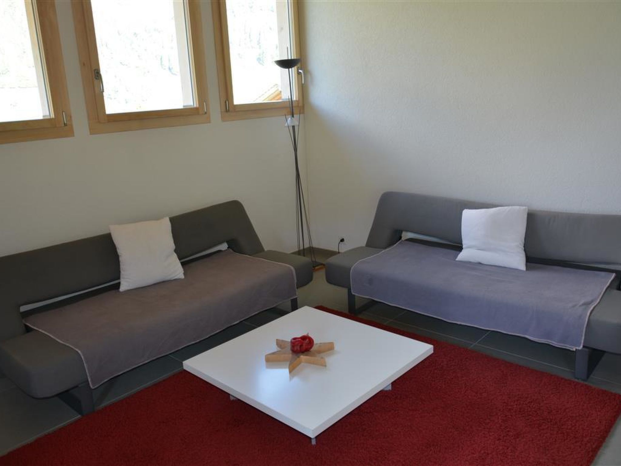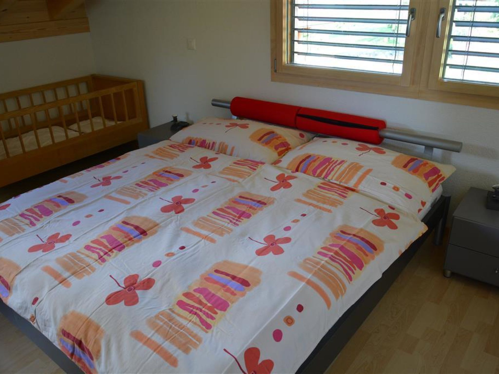 Moderne, helle Dachwohnung. Grosse Wohnküche mit Geschirrspüler, Kapsel-Kaffeemaschine (Delizio), Fondue- sowie Raclette-Set und Tischgrill. Wohnzimmer mit Sofa und TV. 1 Schlafzimmer mit Doppelbett (140x200cm) und 1 Schlafzimmer mit 2 Einzelbetten (90x200cm). 1 Badezimmer mit Badewanne und separater Dusche, 2 Waschbecken, WC. WiFi. Kinderbett (70x140cm) inkl. Bettwäsche und Kinderhochstuhl vorhanden.