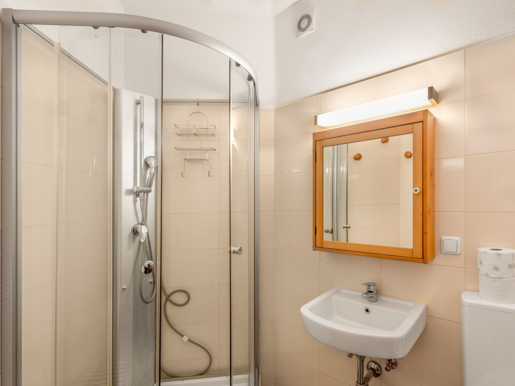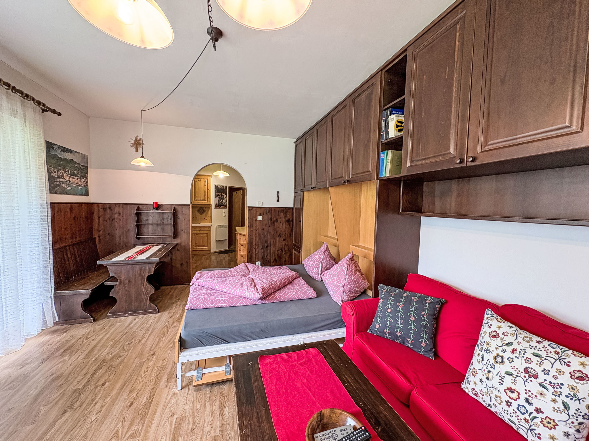 2-Zimmer-Wohnung 42 m2, im Erdgeschoss. Objekt geeignet für 2 Erwachsene + 2 Kinder. Einfach und gemütlich eingerichtet: Wohn-/Schlafzimmer mit 2 Wandklappbetten (90 cm, Länge 200 cm), Essecke und Kabel-TV (Flachbildschirm), Radio. Ausgang zur Loggia. Kabine mit 1 x 2 Etagenbetten. Offene Küche im Eingang (4 Kochplatten, Backofen). Bad/WC. Balkon, Südlage und Ostlage. Balkonmöbel. Seitliche Sicht auf die Landschaft. Zur Verfügung: Internet (Wireless LAN, gratis). Maximal 1 Haustier/Hund erlaubt. 50408-000602-2021