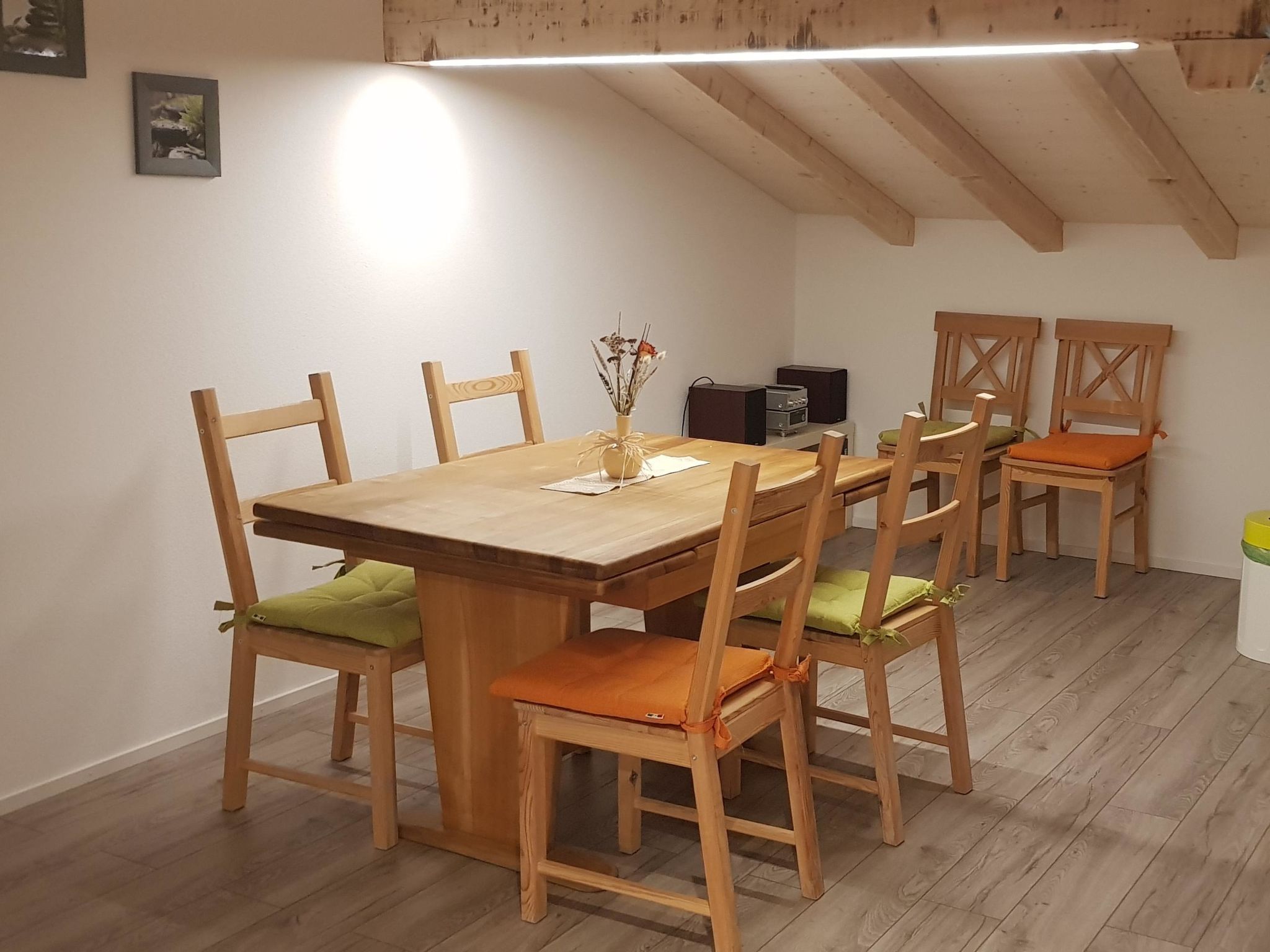 Die gemütliche Ferienwohnung bietet viel Platz. Die Küche ist komfortabel eingerichtet, mit Geschirrspüler, Induktionsherd, Backofen, Mikrowelle und Espresso Kapsel Maschine sowie Tischgrill Mixer und Toaster.Küche und Wohnzimmer sowie Esszimmer bilden zusammen einen Raum. Die 2 Schlafzimmer befinden sich im nördlichen Teil der Wohnung und sind mit Einbauschränken eingerrichtet . Zusätzlich kann das Sofa im Wohnzimmer als Schlafgelegenheit benutzt werden (Ausziehbares Bett). Das Badezimmer ist mit WC, Lavabo und mit einer grossen Dusche ausgestattet. Gemeinsamer Sitzplatz vor dem Haus kann benutzt werden. Im Keller befindet sich ein Abstellraum für Fahrräder und Skier.