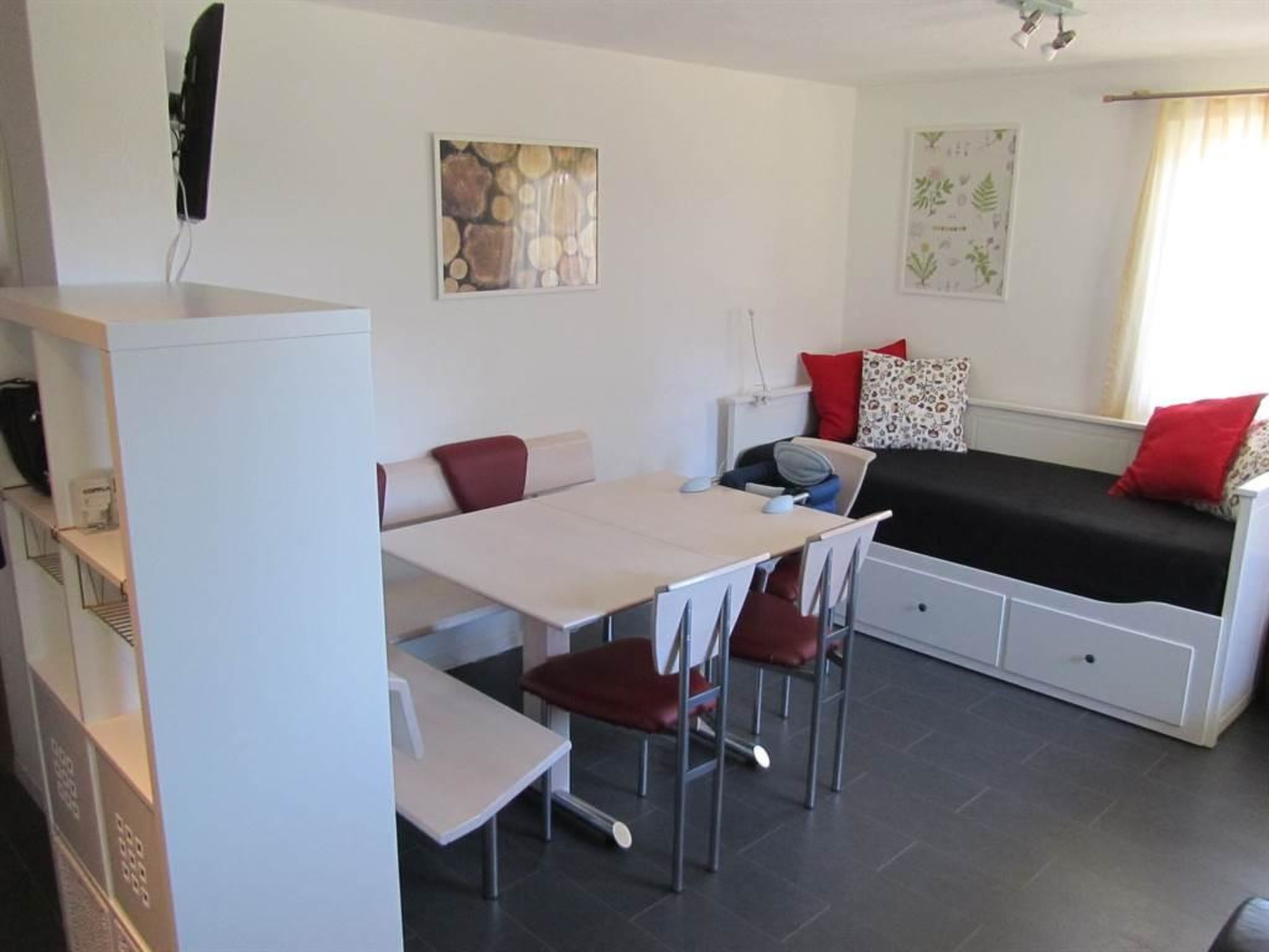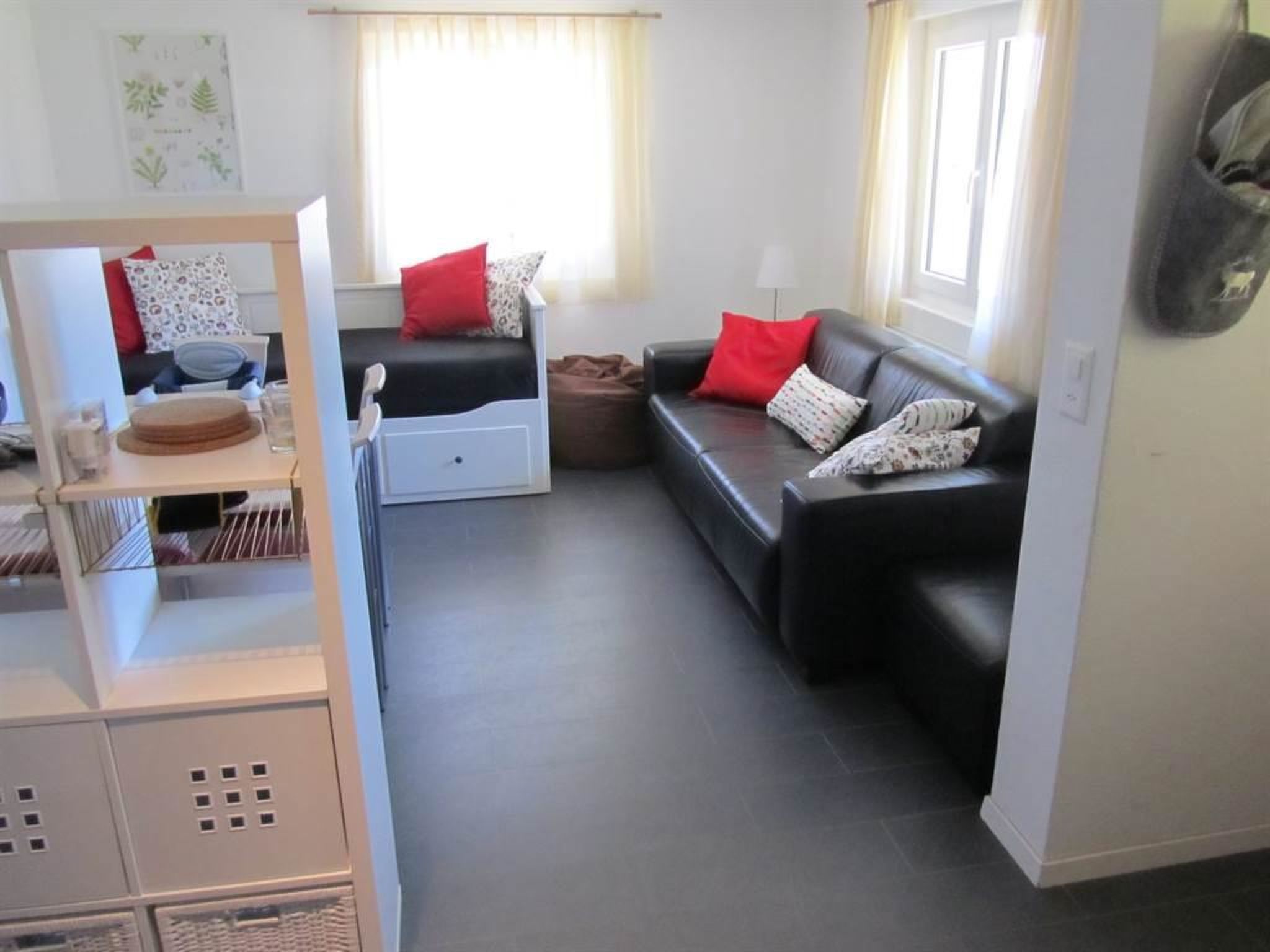 Die Wohnung im EG verfügt über 2 Schlafzimmern (2 + 4 Betten), einen Wohnbereich mit Küche/Wohnzimmer, Sat-TV, einen grossen Vorplatz (ideal für Kinder) und mit Sicht auf die Walliser Berge und das Matterhorn.