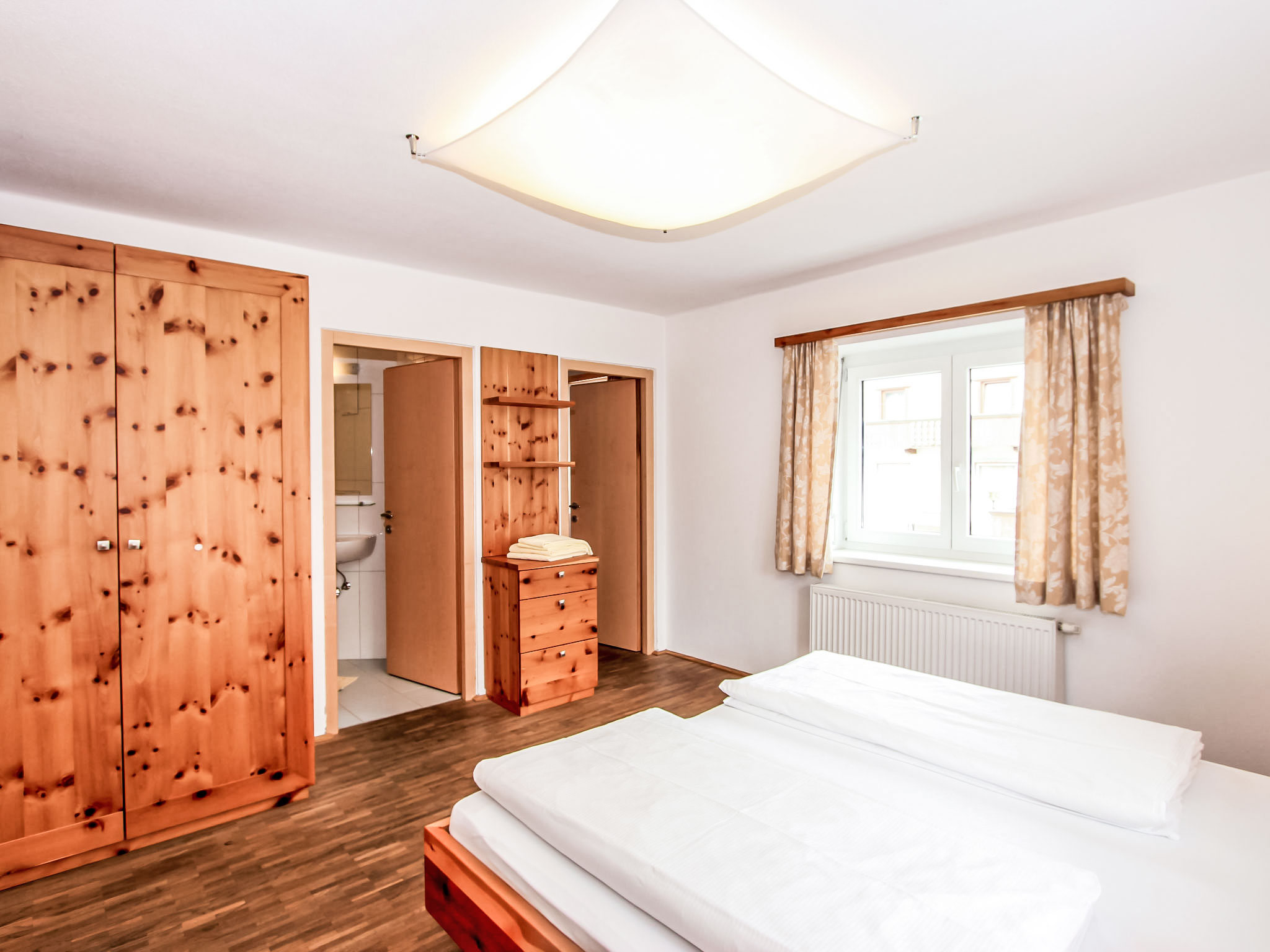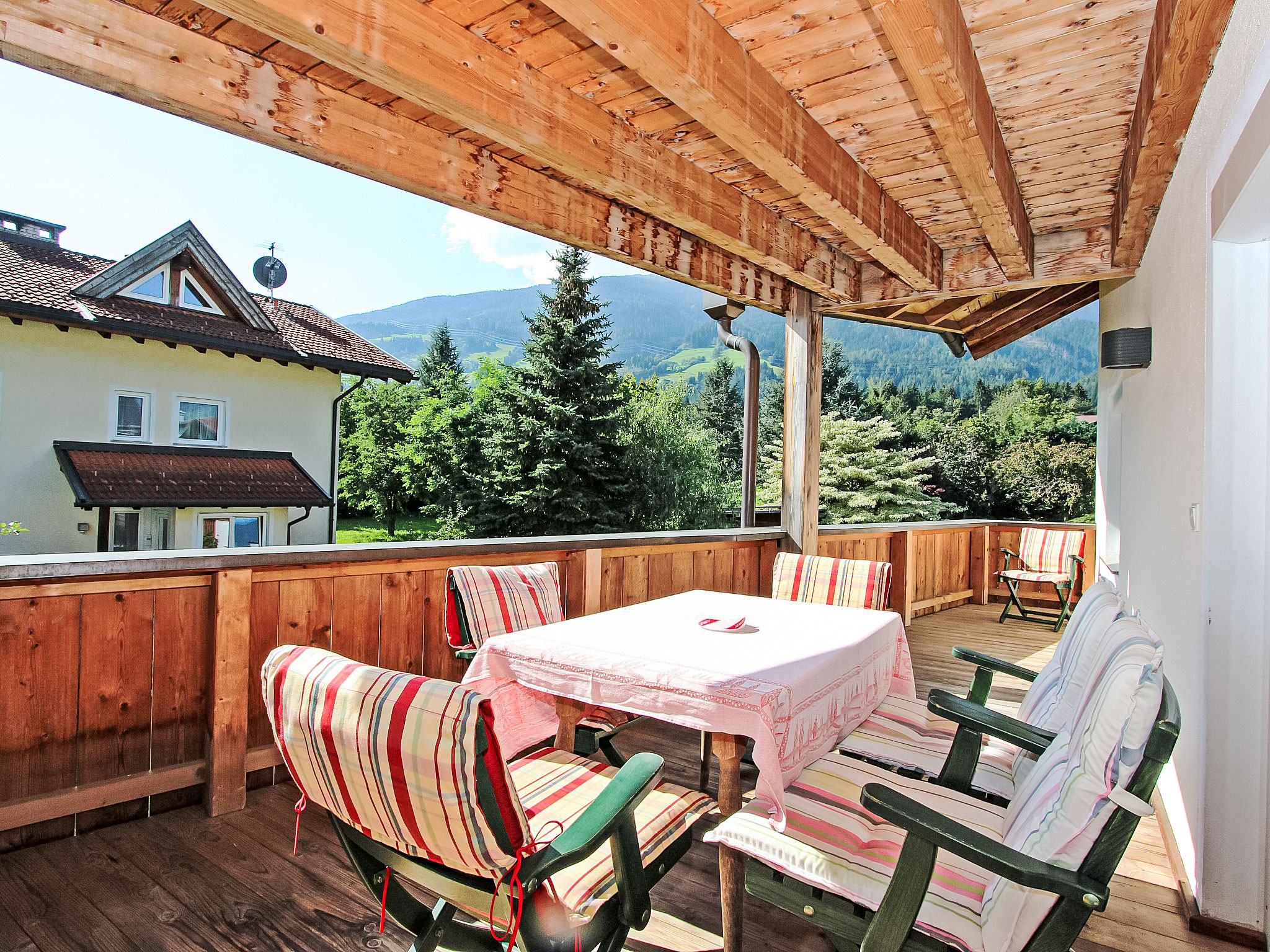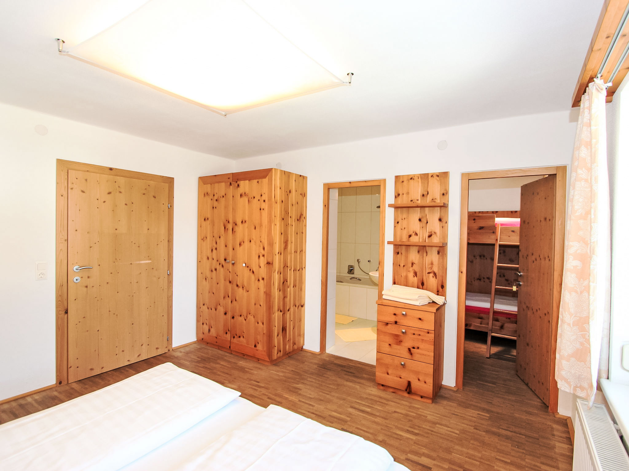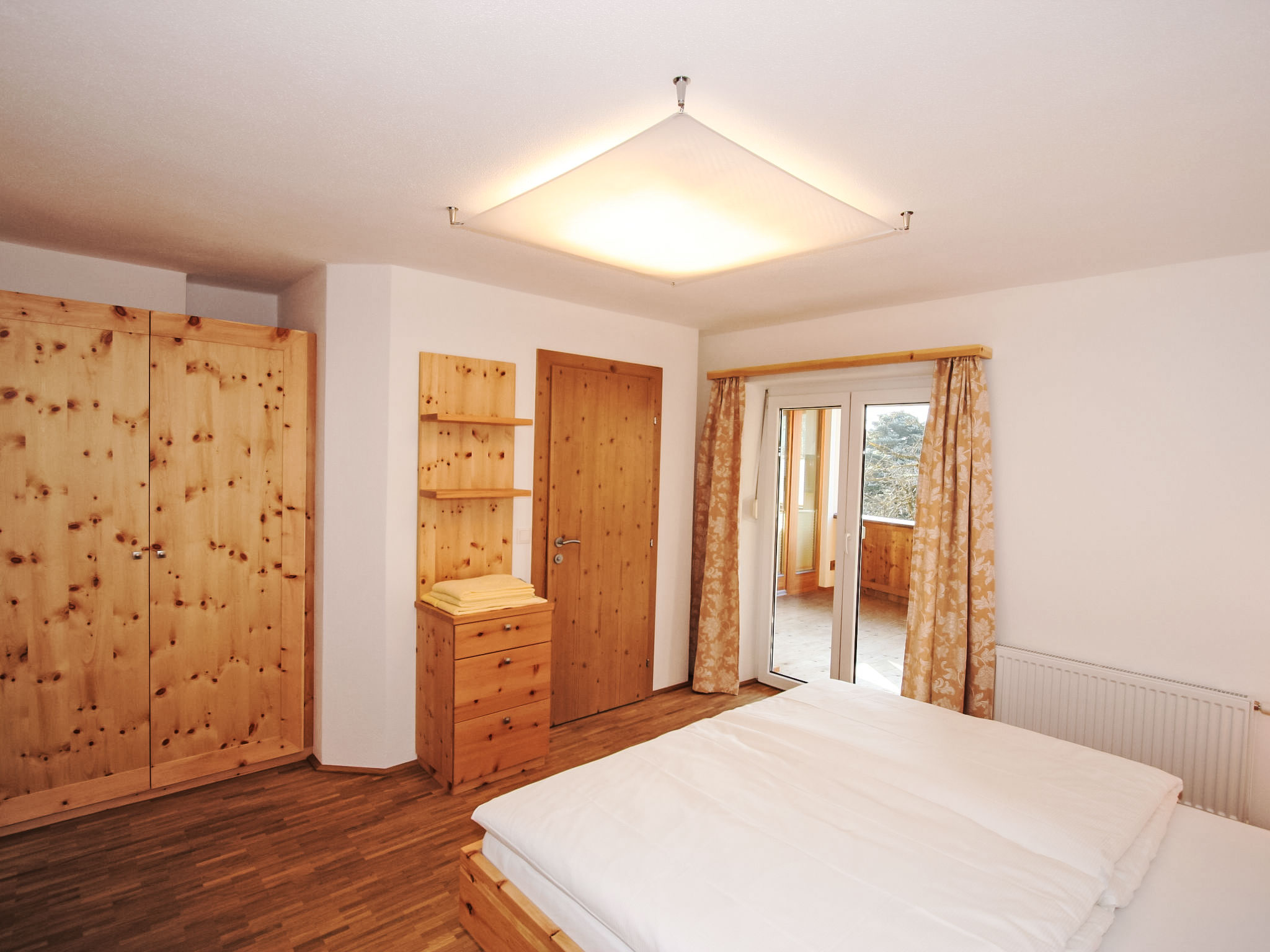 6-Zimmer-Wohnung 150 m2 im 1. Stock. Objekt geeignet für 8 Erwachsene + 2 Kinder. Geräumig, sehr komfortabel und geschmackvoll eingerichtet: Eingang. 2 Doppelzimmer, jedes Zimmer mit Dusche/WC. 1 Doppelzimmer mit Dusche/WC. Ausgang zur Terrasse. 1 Doppelzimmer mit Bad/WC. 1 kleines Kinderzimmer mit 1 x 2 Etagenbetten (90 cm, Länge 180 cm). Grosses Wohnzimmer mit Sat-TV (Flachbildschirm), DVD. Ausgang zur Terrasse. Grosse, offene Küche (Backofen, Geschirrspüler, 4 Glaskeramikherd Platten, Mikrowelle, Tiefkühler, elektrische Kaffeemaschine) mit Essecke. Balkon, grosse Terrasse. Terrassenmöbel. Sehr schöne Sicht auf die Berge und die Ortschaft. Zur Verfügung: Internet (Wireless LAN, extra). Bitte beachten: Nichtraucher-Unterkunft. Wunderschöne Wohnung mit toller Terrasse. Alle Zimmer in Zirbe! Das kleine Kinderzimmer erreicht man über ein DZ.