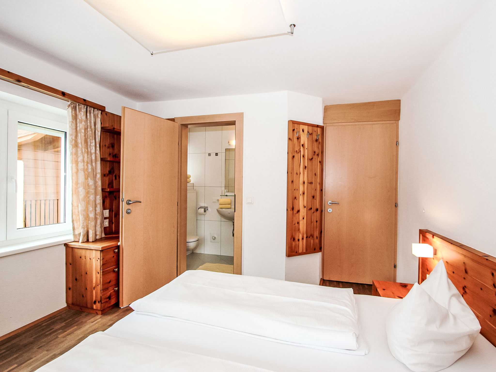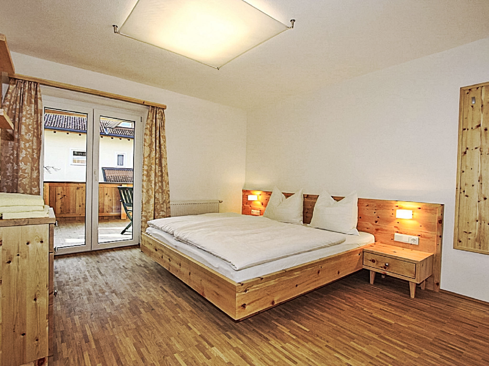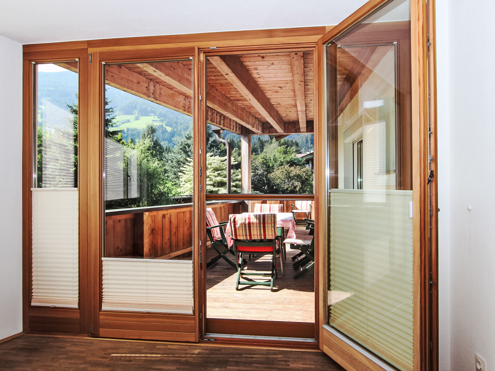 6-Zimmer-Wohnung 150 m2 im 1. Stock. Objekt geeignet für 8 Erwachsene + 2 Kinder. Geräumig, sehr komfortabel und geschmackvoll eingerichtet: Eingang. 2 Doppelzimmer, jedes Zimmer mit Dusche/WC. 1 Doppelzimmer mit Dusche/WC. Ausgang zur Terrasse. 1 Doppelzimmer mit Bad/WC. 1 kleines Kinderzimmer mit 1 x 2 Etagenbetten (90 cm, Länge 180 cm). Grosses Wohnzimmer mit Sat-TV (Flachbildschirm), DVD. Ausgang zur Terrasse. Grosse, offene Küche (Backofen, Geschirrspüler, 4 Glaskeramikherd Platten, Mikrowelle, Tiefkühler, elektrische Kaffeemaschine) mit Essecke. Balkon, grosse Terrasse. Terrassenmöbel. Sehr schöne Sicht auf die Berge und die Ortschaft. Zur Verfügung: Internet (Wireless LAN, extra). Bitte beachten: Nichtraucher-Unterkunft. Wunderschöne Wohnung mit toller Terrasse. Alle Zimmer in Zirbe! Das kleine Kinderzimmer erreicht man über ein DZ.