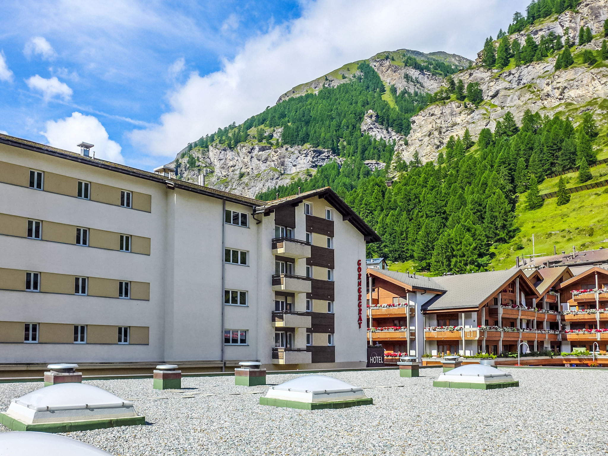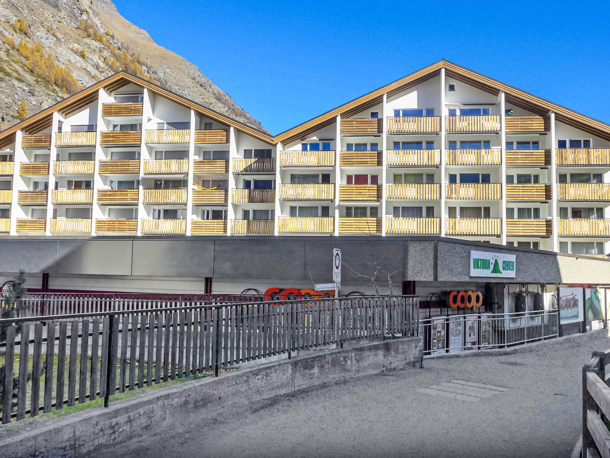 Grosses Mehrfamilienhaus "Viktoria B", auf 5 Stockwerken. Im Ortszentrum von Zermatt, zentrale, sonnige Lage. Im Hause: Fahrstuhl, Skiraum, Zentralheizung. Supermarkt, Restaurant, Bar 5 m, Bäckerei 25 m, Bushaltestelle "Bahnhof" 60 m, Bahnstation "Bahnhof Zermatt" 60 m. Bergbahn 60 m, Skiverleih 5 m, Skibushaltestelle 60 m, Skischule, Kinderskischule 280 m.
