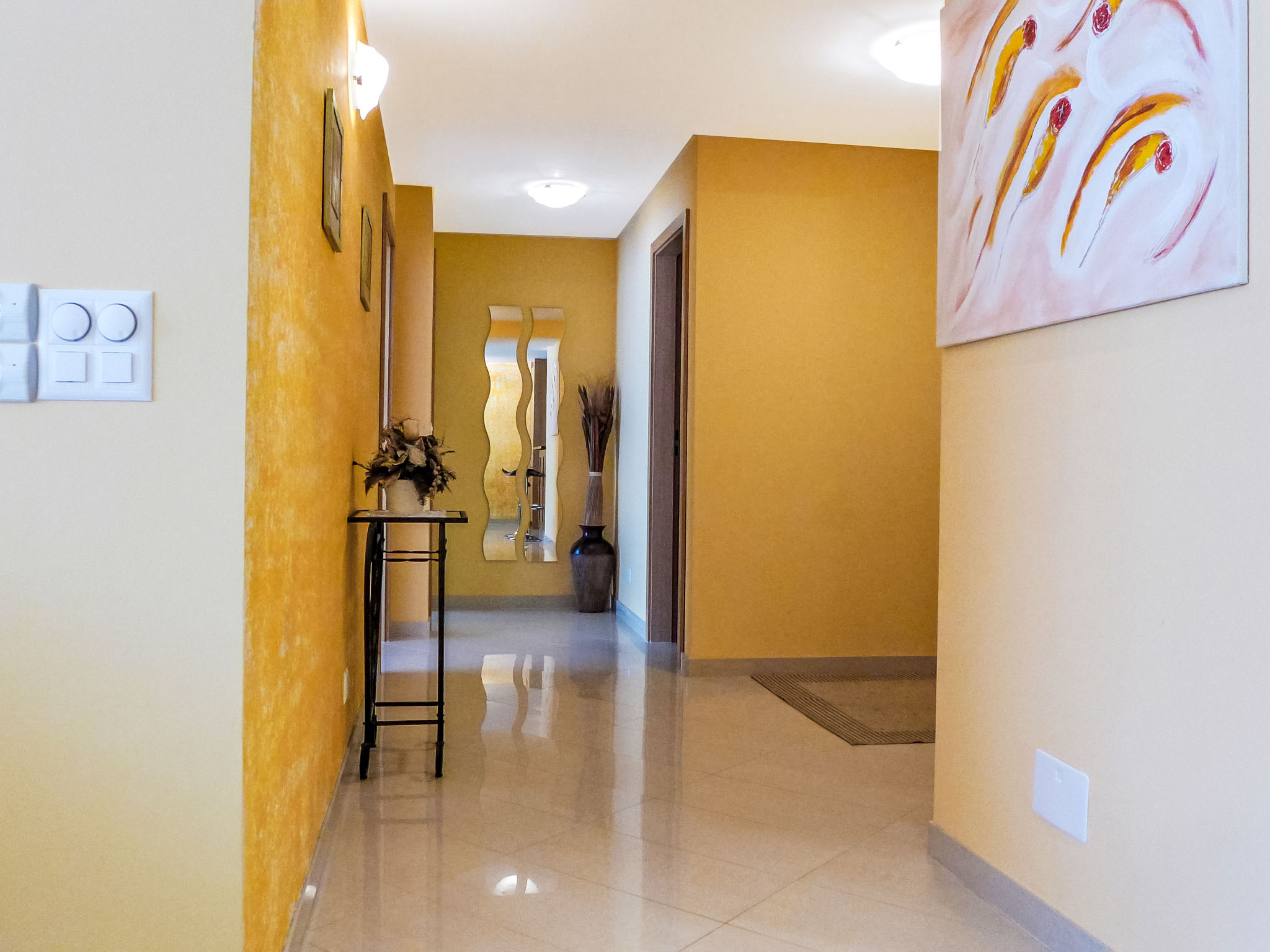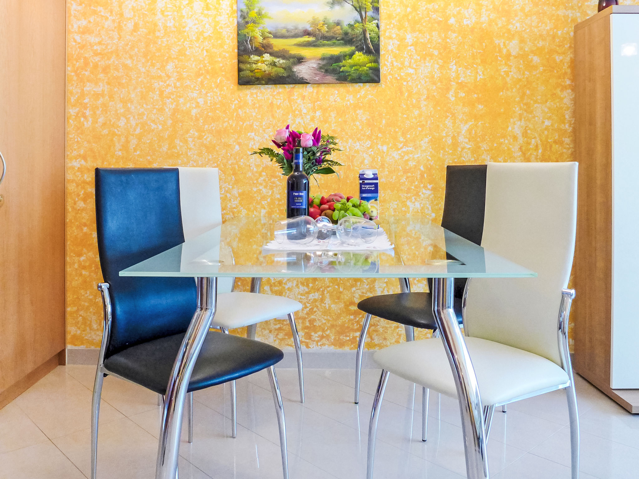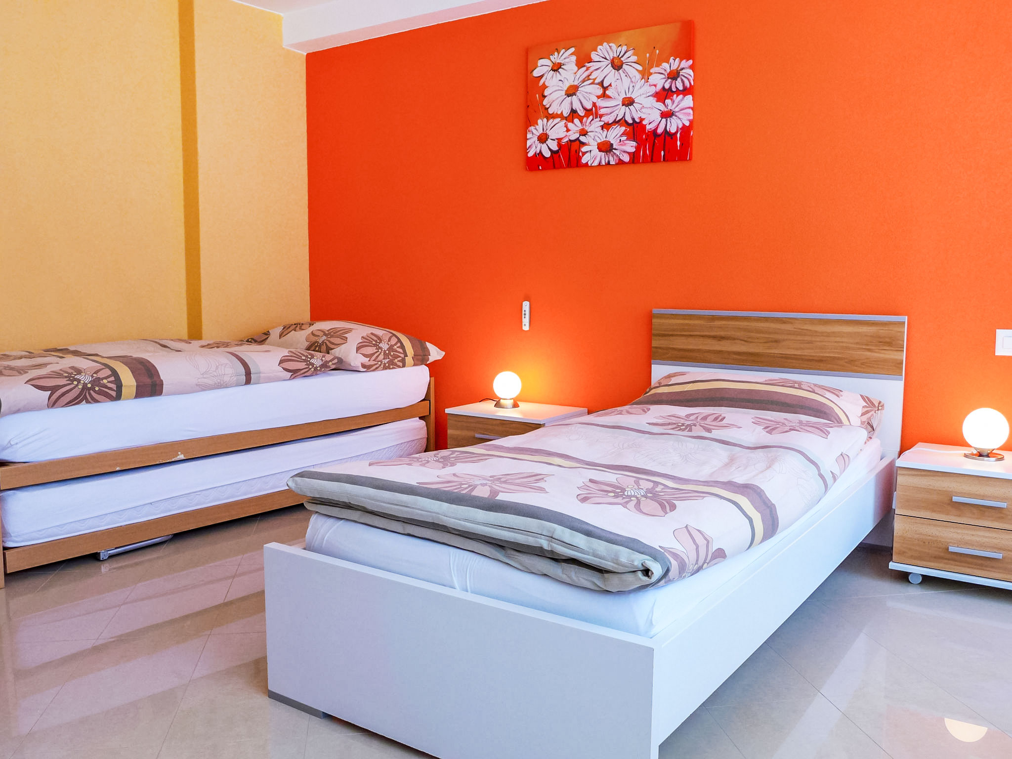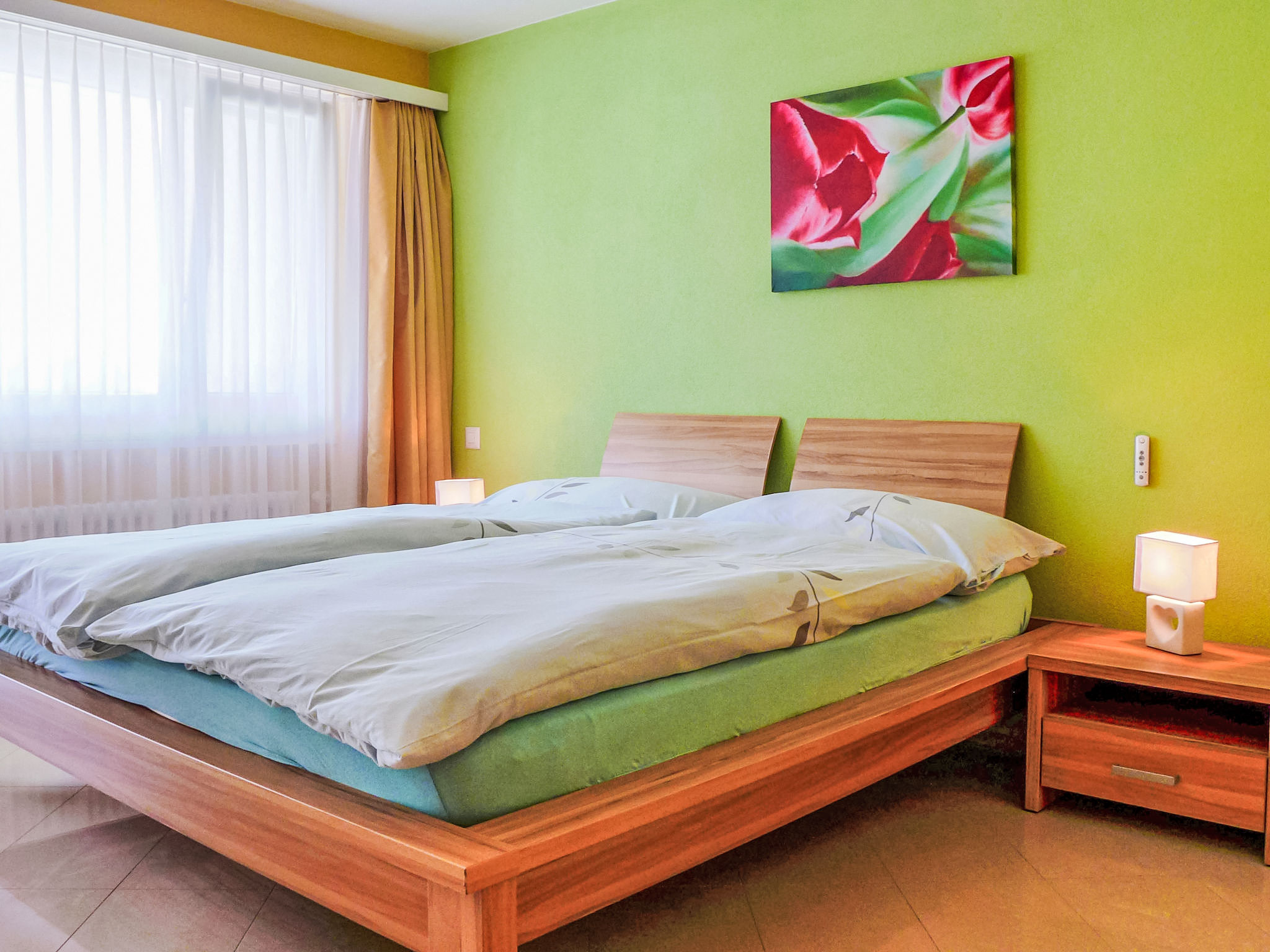 3-Zimmer-Wohnung 95 m2 im 1. Stock. Hell, schön und modern eingerichtet: Wohn-/Esszimmer mit TV, CD und DVD. Ausgang zum Balkon. 1 Zimmer mit 3 Betten (90 cm, Länge 200 cm). 1 Zimmer mit 1 Doppelbett (180 cm, Länge 200 cm), Bad/WC und TV. Grosse, offene Küche (Backofen, Geschirrspüler, 4 Glaskeramikherd Platten, Tiefkühler, elektrische Kaffeemaschine, Kombinationsmikrowelle). Dusche/WC. Heizung. Grosser Balkon, Südlage. Balkonmöbel. Seitliche Sicht auf die Berge. Zur Verfügung: Internet (Wireless LAN, gratis). Bitte beachten: Nichtraucher-Unterkunft.