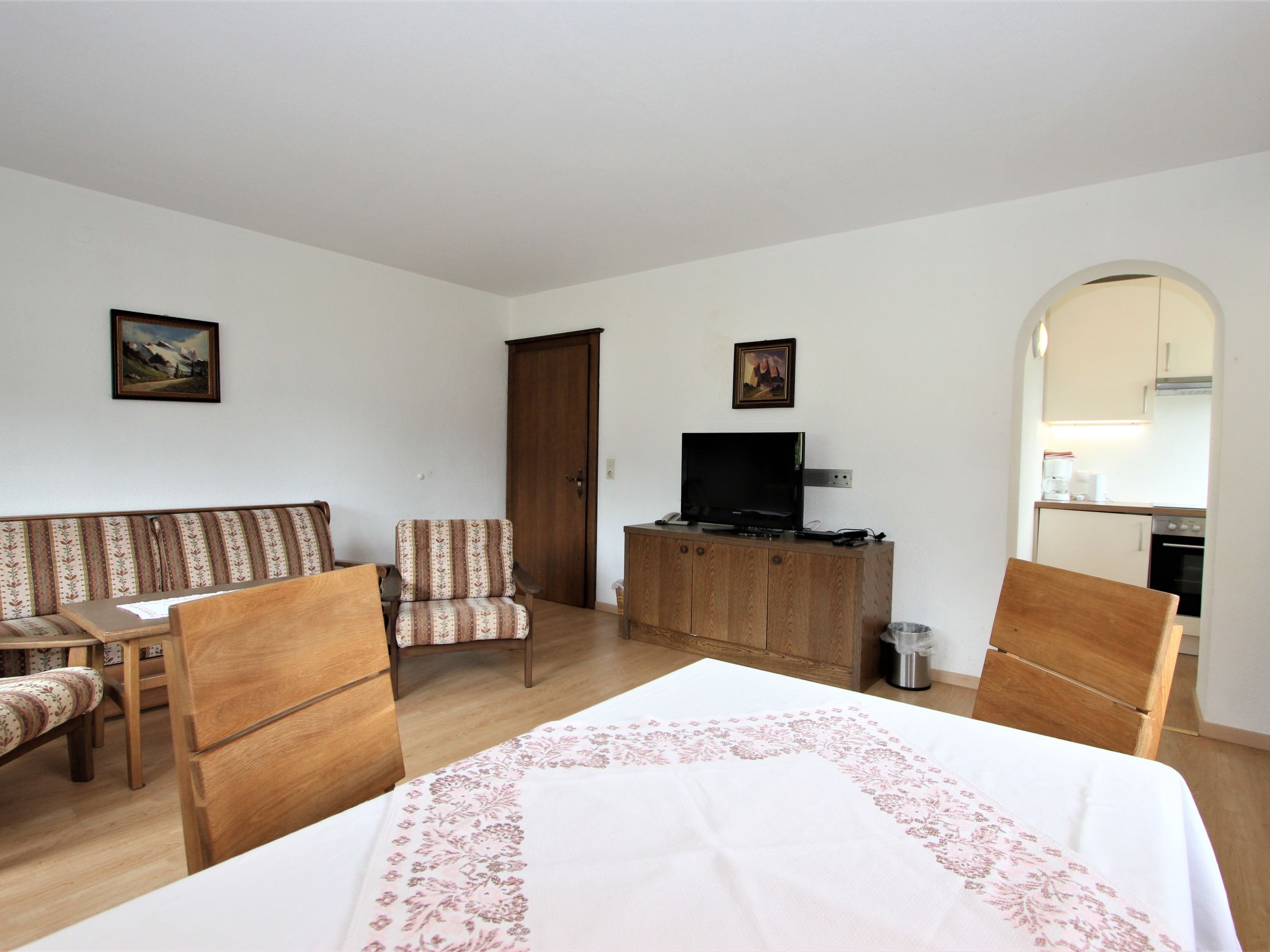 2-Zimmer-Wohnung 65 m2 im 1. Stock. Geräumig, rustikal und gemütlich eingerichtet: grosser Eingang. Grosses Wohn-/Schlafzimmer mit 1 Ausziehbett (2 Pers.), Essecke und Sat-TV (Flachbildschirm). Ausgang zum Balkon. 1 Doppelzimmer. Kochnische (Backofen, 4 Glaskeramikherd Platten). Bad, sep. WC. Grosser Balkon, Westlage und Südlage. Balkonmöbel. Schöne Sicht auf die Berge und die Landschaft. Zur Verfügung: Internet (Wireless LAN). Bitte beachten: Nichtraucher-Unterkunft. 1 Haustier/Hund erlaubt.