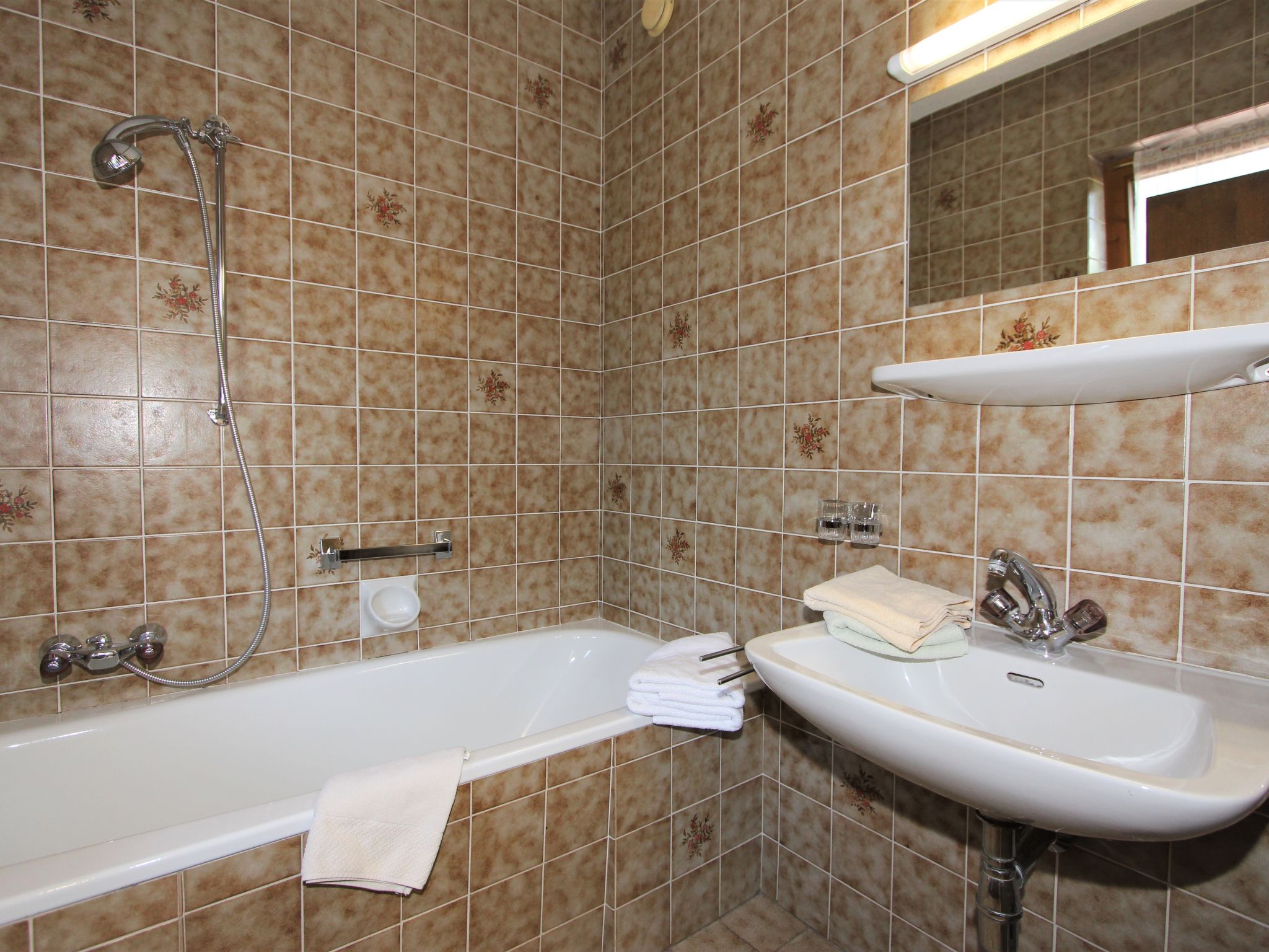 1-Zimmer-Wohnung 35 m2, im Erdgeschoss. Rustikal und gemütlich eingerichtet: grosses Wohn-/Schlafzimmer mit 1 Ausziehbett (2 Pers.), Esstisch und Sat-TV (Flachbildschirm). Ausgang zum Balkon. Kochnische im Eingang (Backofen, 4 Glaskeramikherd Platten). Bad, sep. WC. Balkon, Ostlage. Balkonmöbel. Schöne Sicht auf die Berge und die Landschaft. Zur Verfügung: Internet (Wireless LAN). Bitte beachten: Nichtraucher-Unterkunft. 1 Haustier/Hund erlaubt.