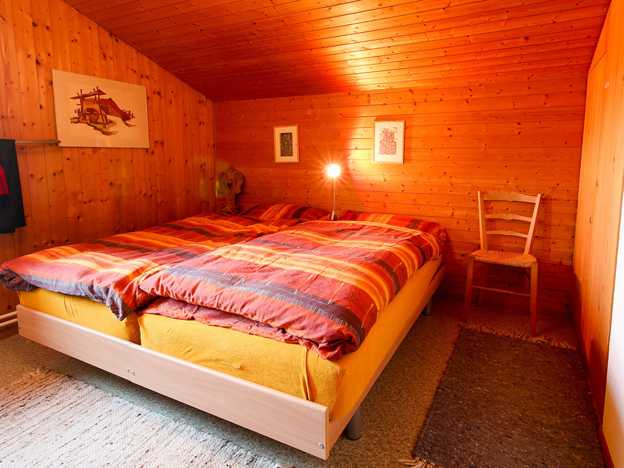120 m2. 1 Haustier/Hund erlaubt. Weitere Angaben des Anbieters: Parterre: kleiner Vorraum mit Schrank, Heizungsraum mit Waschmaschine und Tumbler, Eingangsbereich mit Garderobe, Dusche/WC und Vorratsräumchen. Grosszügige, helle Wohnstube mit toller Weitsicht, Steinboden, gemütlichem Tisch für 6 - 7 Personen, TV/Radio, Sofaecke, Schwedenofen und Ausgang zur südlich gelegenen grossen Terrasse. Offene, gut eingerichtete Wohnküche mit Theke und mit üblicher Ausrüstung, inkl. Geschirrspüler. Obergeschoss: 3 Doppelschlafzimmer mit Einzelbetten (eines davon ein Kajütenbett), 1 Einzelschlafzimmer sowie ein kleines WC. Untergeschoss: Werkbank sowie Einstellraum für Sportgeräte.