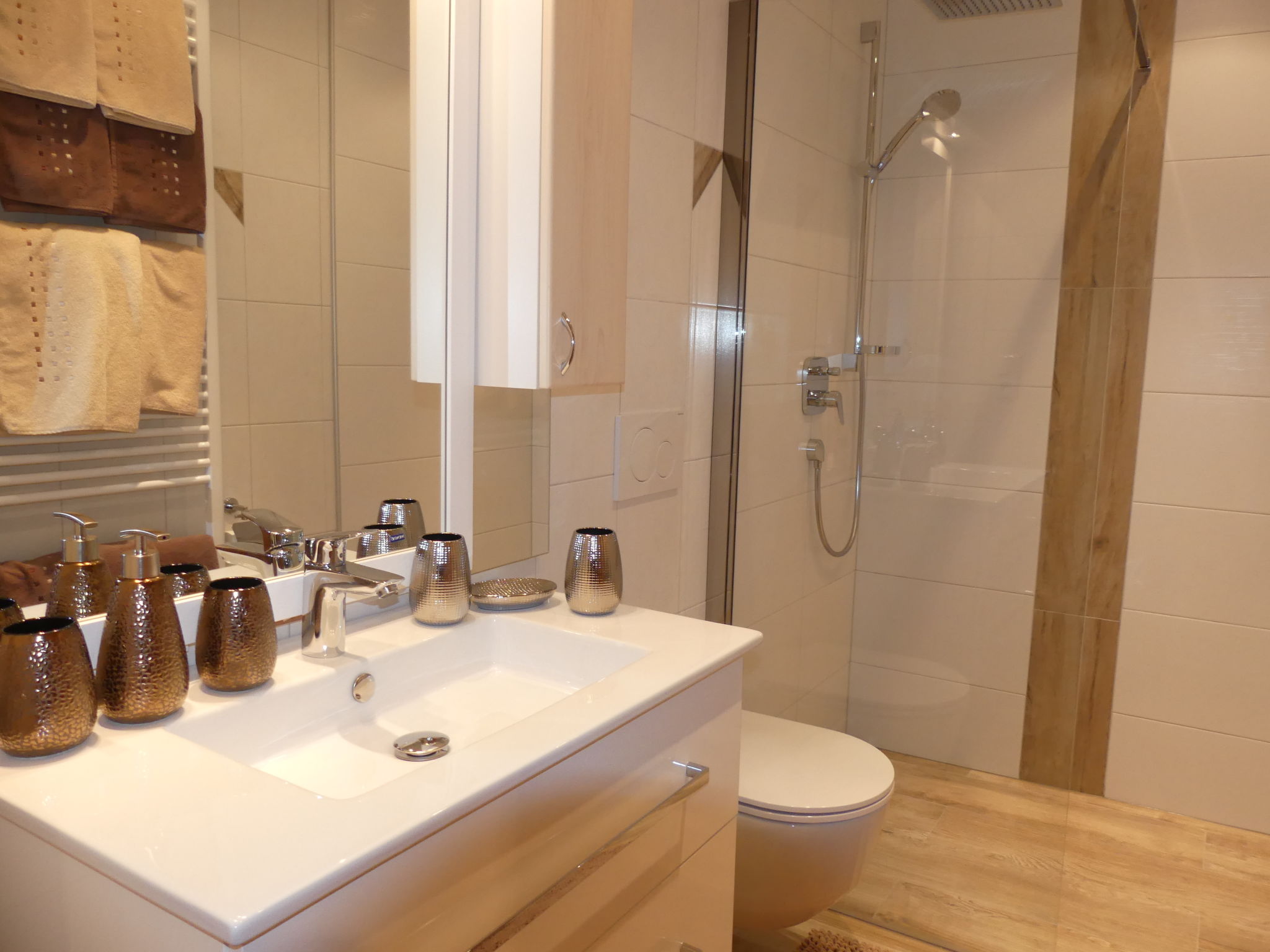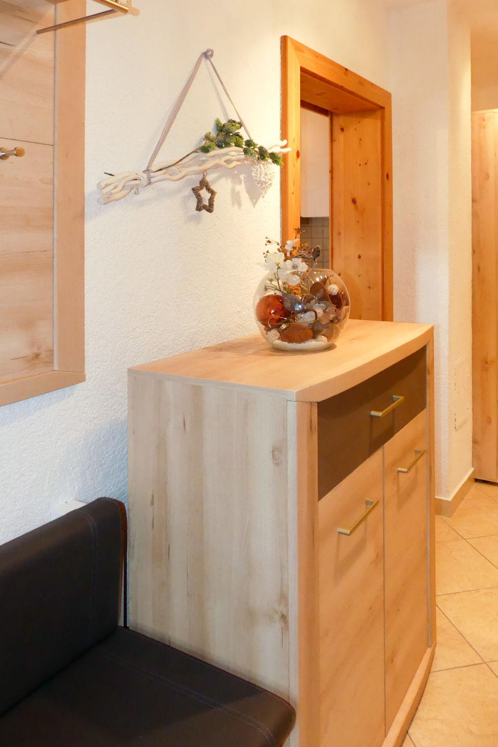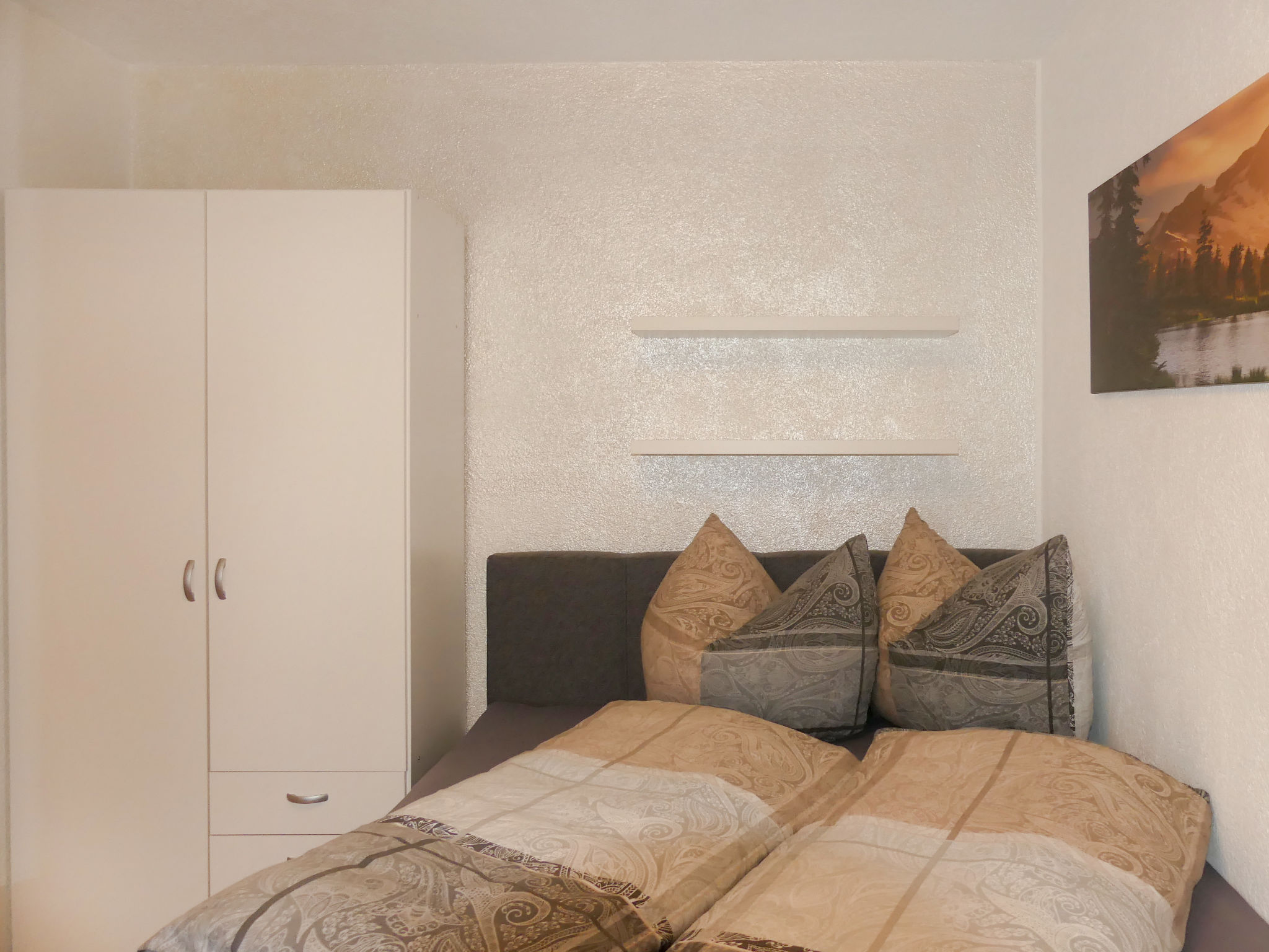 3-Zimmer-Wohnung, Erdgeschoss (Hanglage), ca. 60 m². Wohnraum mit Sitzcouch. Küche (4 Ceranfelder, Backofen, Geschirrspüler, Kühl-/Gefrierkombination, Kaffeemaschine, Wasserkocher, Toaster) mit Essplatz (Eckbank). Doppelzimmer. Dusche/WC. Außerhalb der abgeschlossenen Wohnung, auf der selben Etage: Doppelzimmer. Sep.WC.