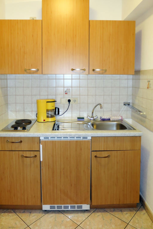 3-Zimmer-Wohnung, 2. Etage, ca. 55 m². Wohnküche (4 Platten, Backofen, Mikrowelle, Geschirrspüler, Kühlschrank, Kaffeemaschine, Wasserkocher, Toaster) mit Essplatz. Doppelzimmer mit Balkonausgang. Dusche/WC. Außerhalb der abgeschlossenen Wohnung auf der gleichen Etage: Doppelzimmer mit Dusche/WC, Kochnische (2 Platten, Kühlschrank, Kaffeemaschine), Balkonausgang.
