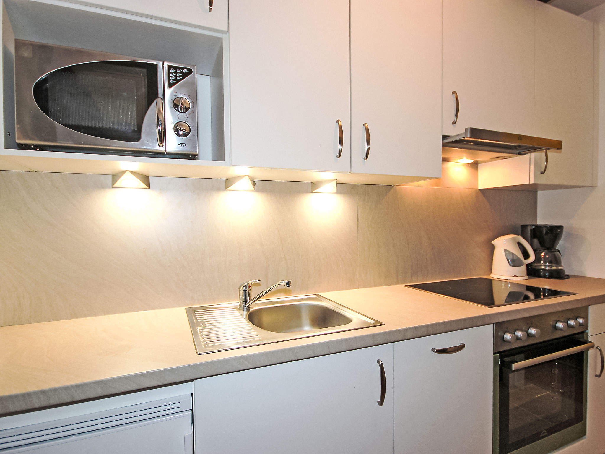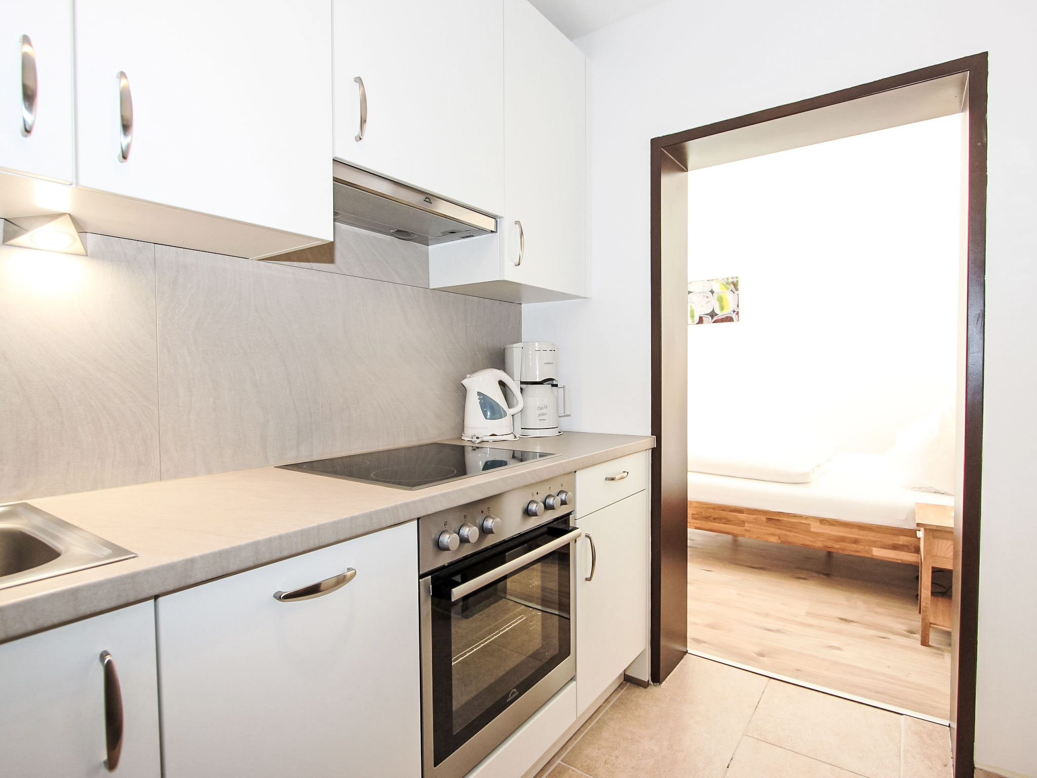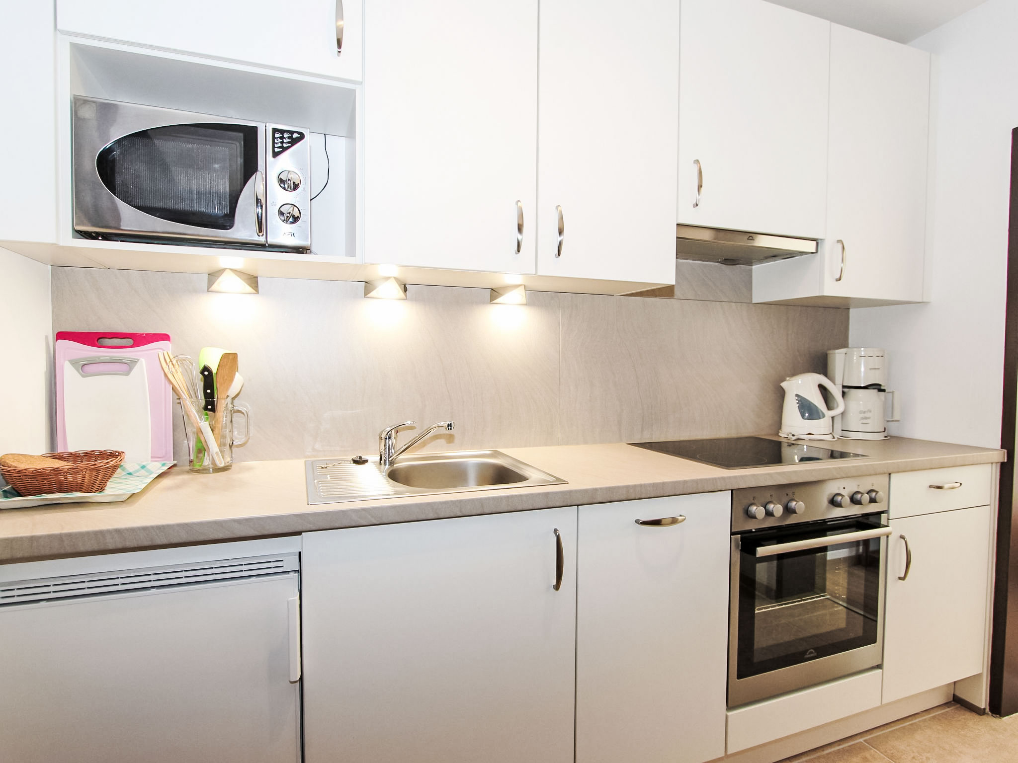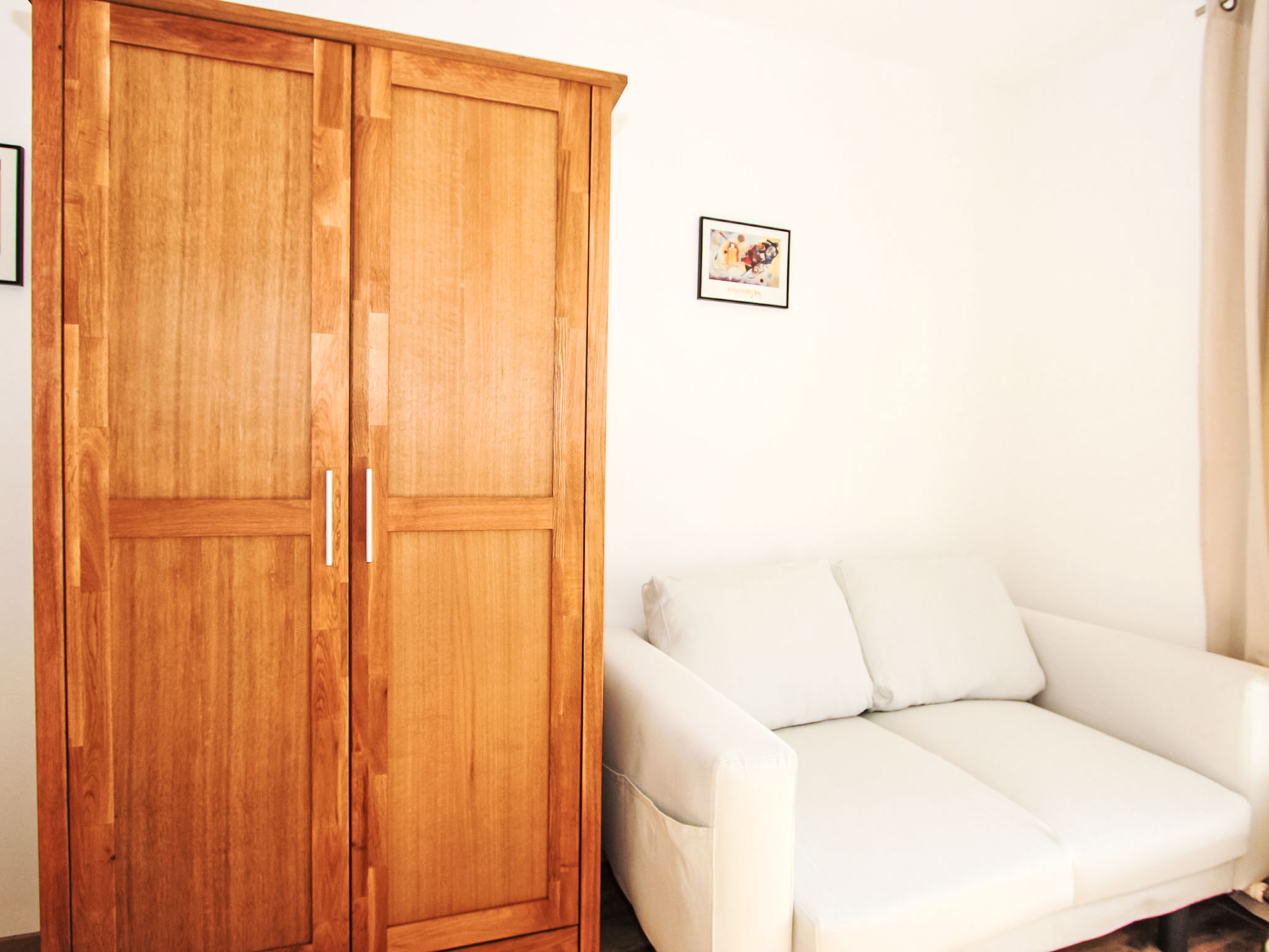 1-Zimmer-Wohnung 24 m2 im 1. Stock. Renoviert im Jahre 2016, schön und gemütlich eingerichtet: Wohn-/Schlafzimmer mit 1 Doppelbett, Esstisch und Kabel-TV (Flachbildschirm). Kochnische im Eingang (Backofen, Geschirrspüler, 4 Glaskeramikherd Platten, Mikrowelle). Dusche/WC. Balkon. Balkonmöbel, Liegestühle (2). Zur Verfügung: Babybett, Haartrockner. Internet (Wireless LAN, gratis). Bitte beachten: Nichtraucher-Unterkunft. Maximal 1 Haustier/Hund erlaubt.