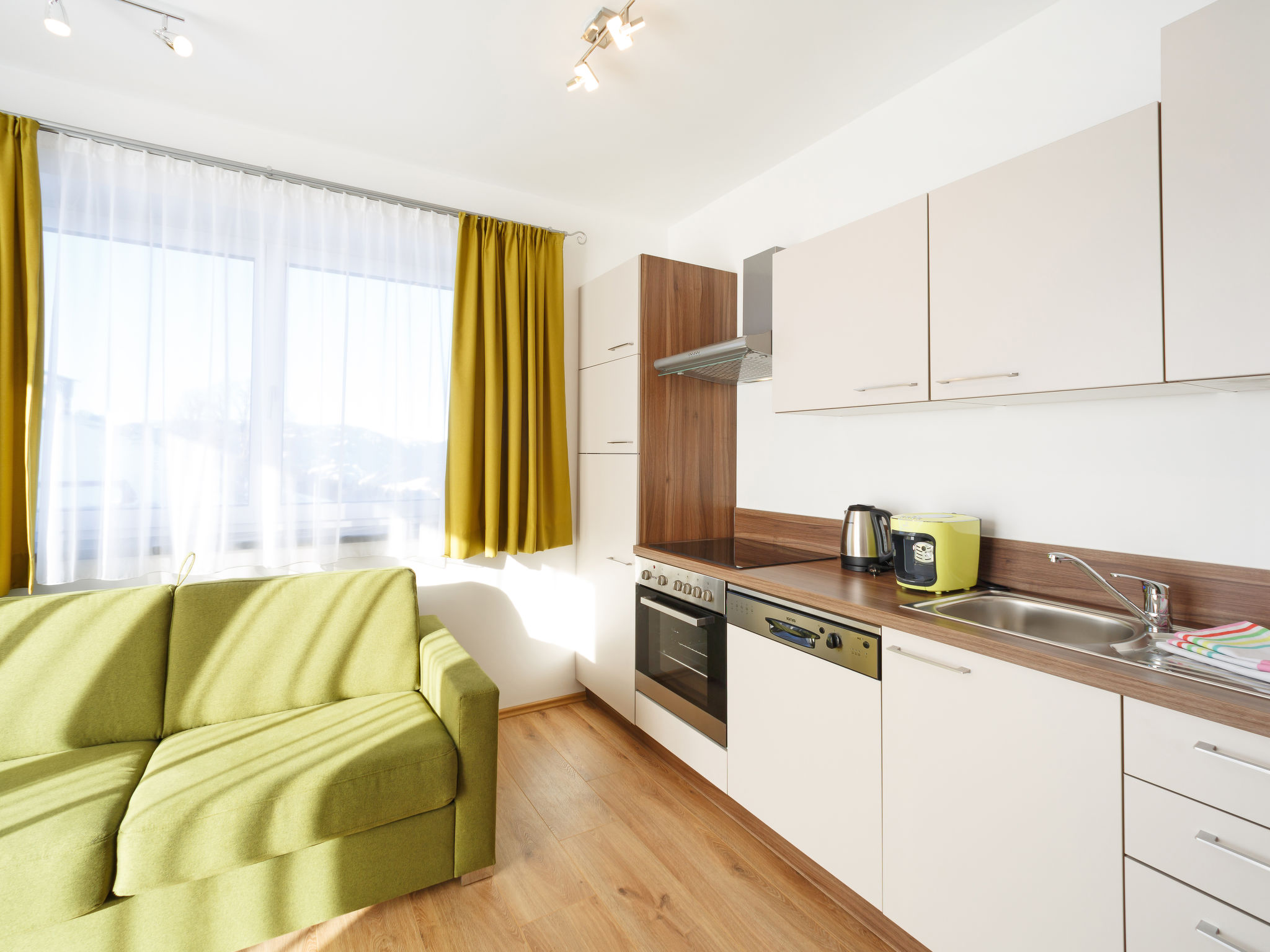 2-Zimmer-Wohnung 'Smaragd', Obergeschoss, ca. 50 m². Wohn-/Schlafraum mit Doppelbettcouch, Küchenzeile (4 Ceranfelder, Backofen, Mikrowelle, Geschirrspüler, Kühl-/Gefrierkombination, Kaffeemaschine, Wasserkocher, Toaster), Essplatz (Eckbank) und Balkonausgang. Doppelzimmer mit Balkonausgang. Dusche/WC. Bei Belegung mit weniger Personen als der maximalen Personenzahl stehen nicht alle Wohneinheiten zur Verfügung.
