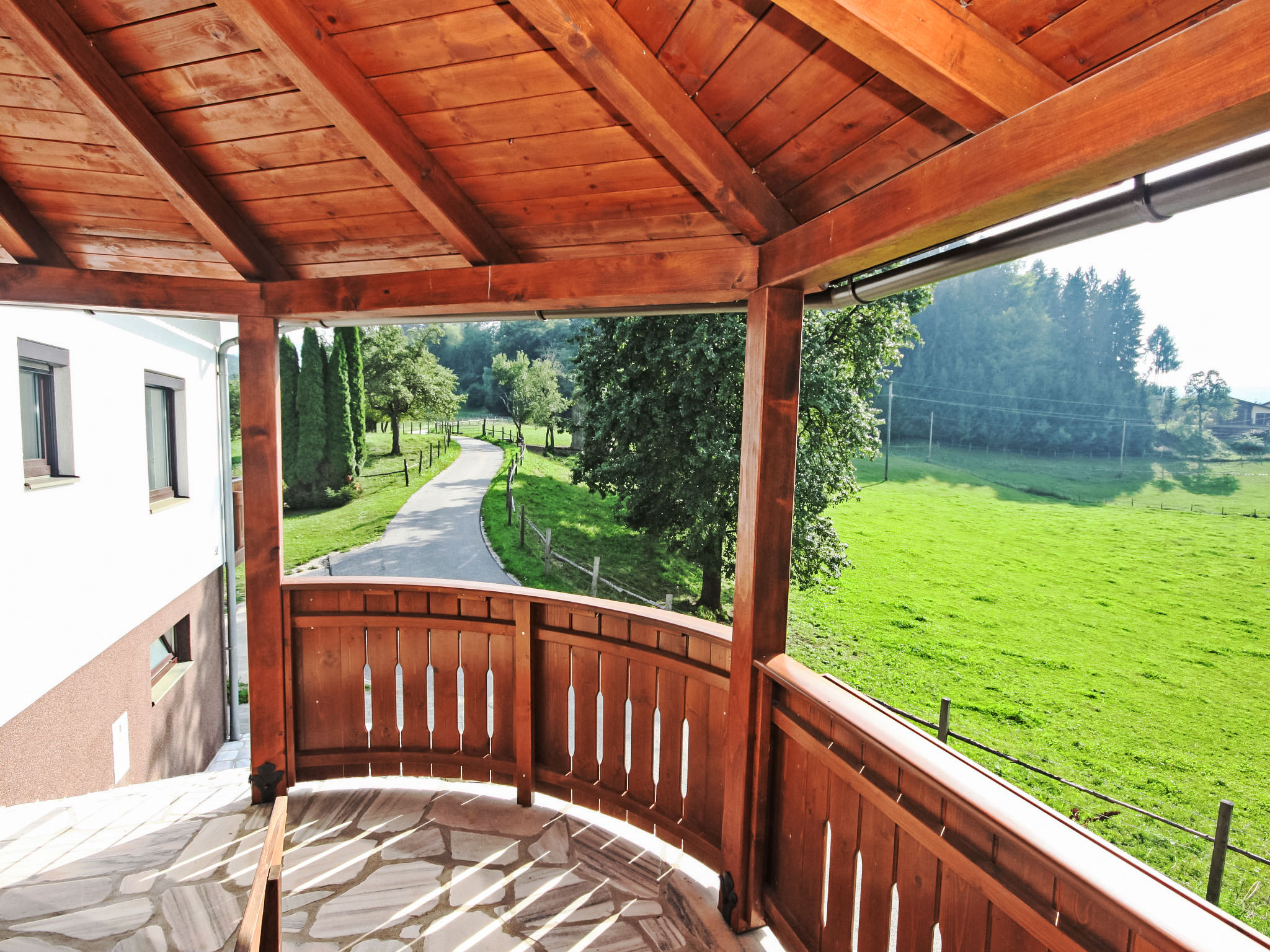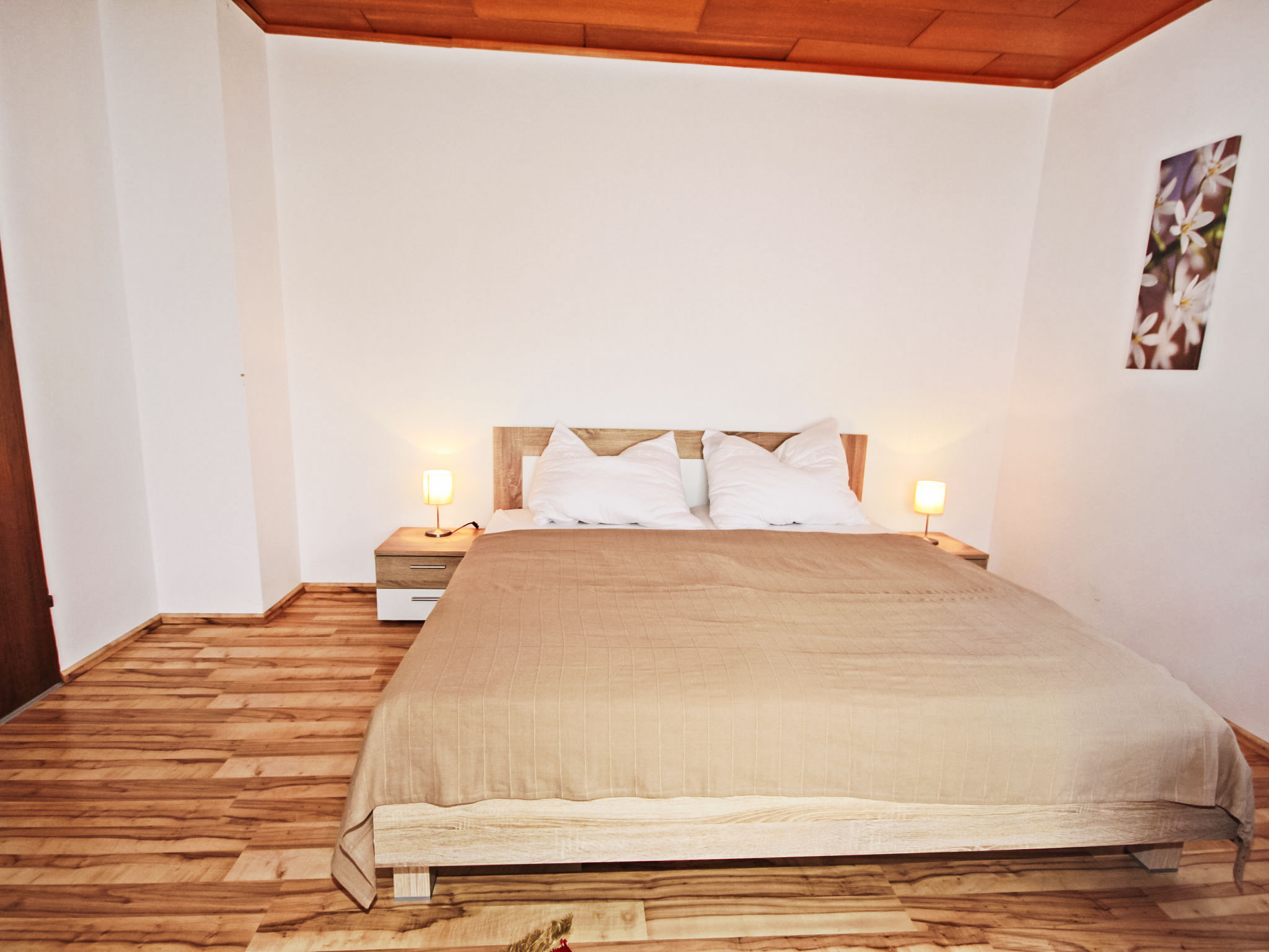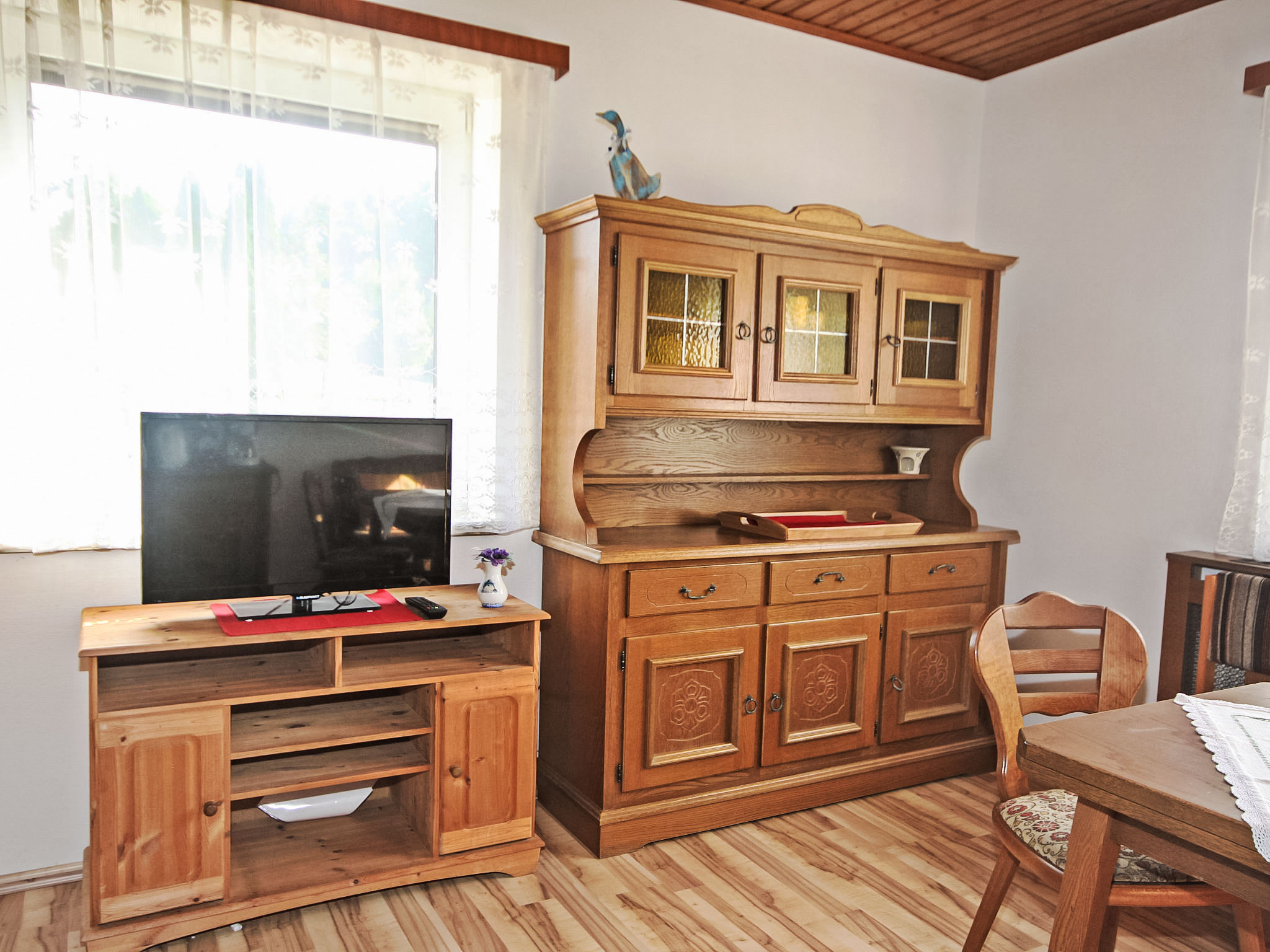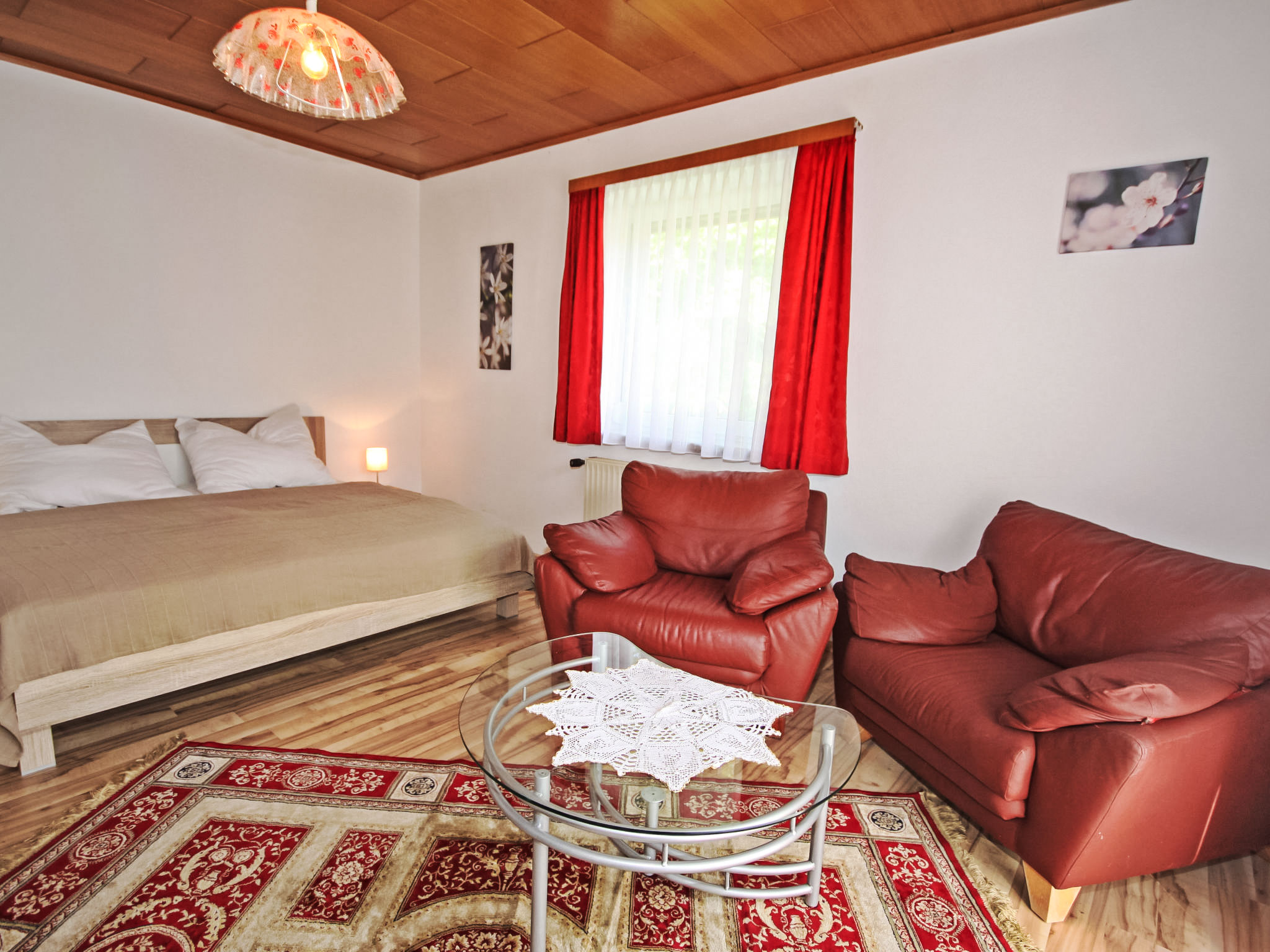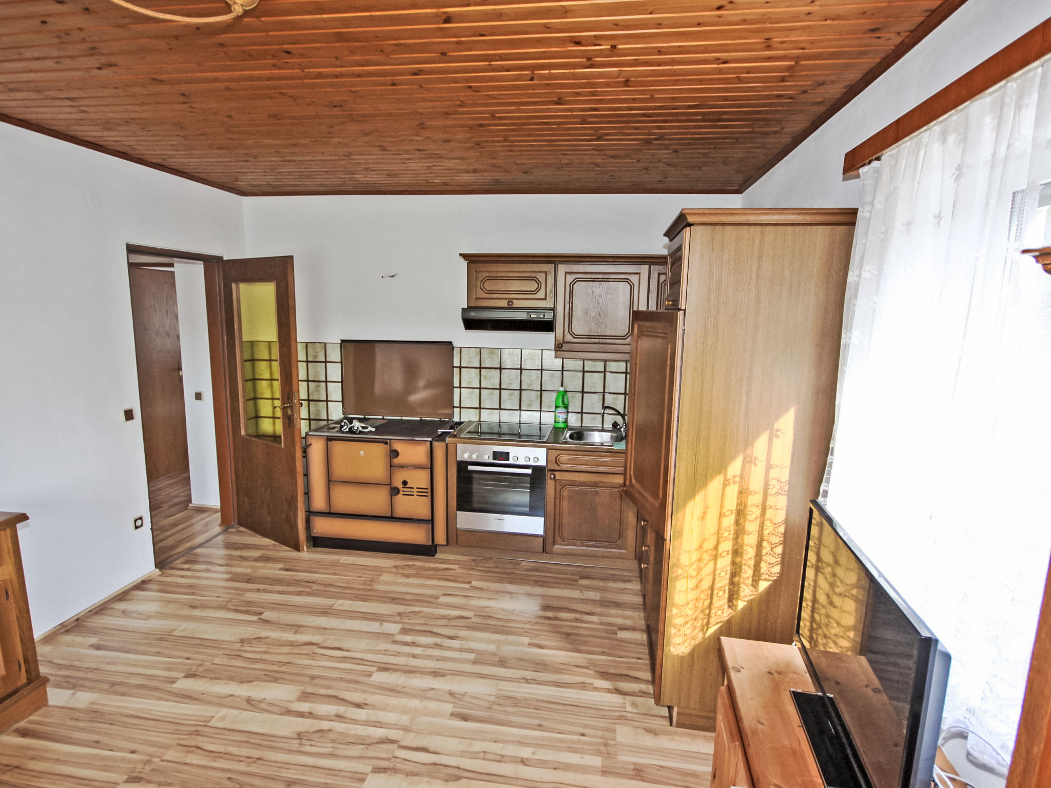 3-Zimmer-Haus 90 m2. Geräumig und hell, zweckmässig und gemütlich eingerichtet: Eingang. 1 Doppelzimmer. 1 Doppelzimmer mit Kabel-TV (Flachbildschirm). Ausgang zum Balkon. Grosse Wohnküche (Backofen, Geschirrspüler, 4 Glaskeramikherd Platten, Mikrowelle, elektrische Kaffeemaschine) mit Essecke und Sat-TV (Flachbildschirm), Holzofen. Bad/Dusche, Bidet, sep. WC. E-Heizung, Holzheizung. Grosser Balkon 11 m2, Laube. Balkonmöbel, Abstellkammer. Schöne Sicht auf die Landschaft. Zur Verfügung: Waschmaschine, Kinderhochstuhl, Babybett bis 2 Jahre. Internet (Wireless LAN, gratis). Bitte beachten: geeignet für Familien. Nichtraucher-Unterkunft. Rauchmelder, Feuerlöscher.