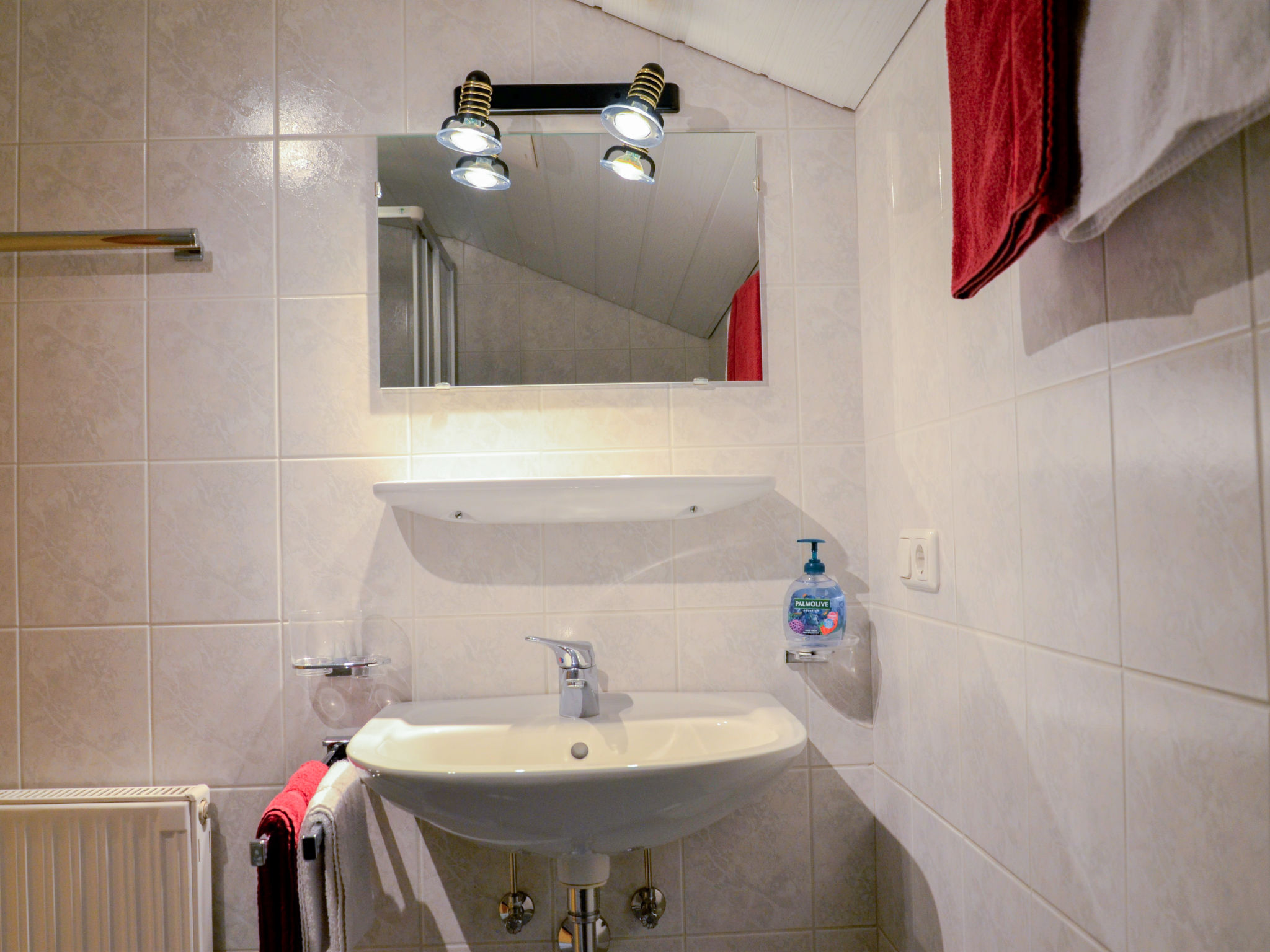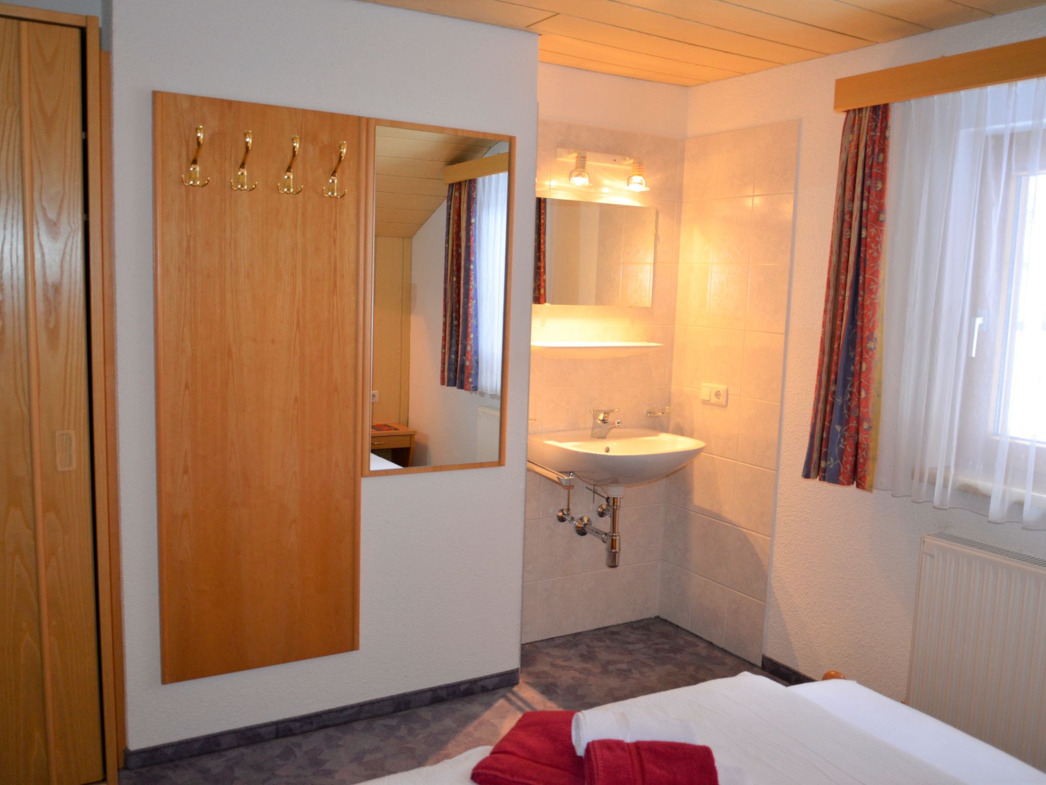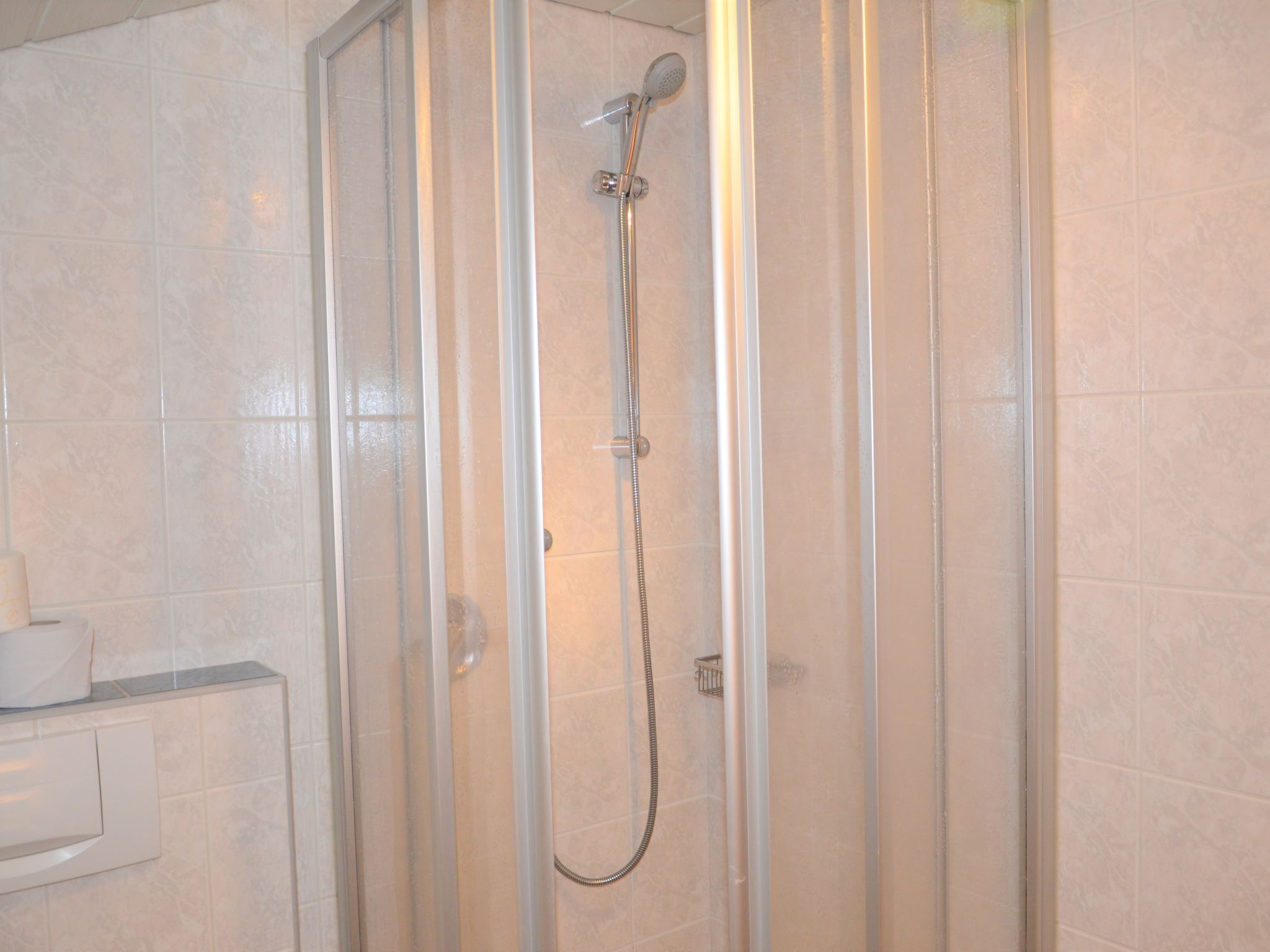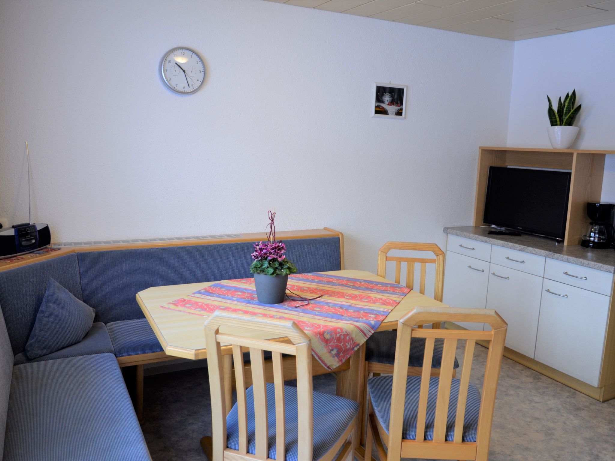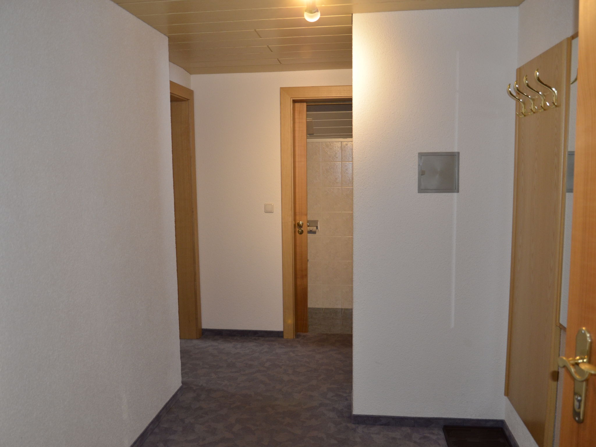 5-Zimmer-Wohnung, Dachgeschoss (holzverkleidete Dachschräge), ca. 65 m². Flur mit Garderobe. Wohnküche (4 Platten, Backofen, Kühlschrank, Kaffeemaschine, Wasserkocher, Toaster) mit Essplatz (Eckbank). Doppelzimmer mit Waschbecken. Schlafzimmer mit Doppelbettcouch. 2 Zweibettzimmer. Dusche/WC. Sep.WC.Hinweis: Bei Buchung zum Preis für 6 Personen bleibt 1 Schlafzimmer verschlossen. Bei Buchung zum Preis für 4 Personen bleiben 2 Schlafzimmer verschlossen. Bei Belegung mit weniger Personen als der maximalen Personenzahl stehen nicht alle Wohneinheiten zur Verfügung.