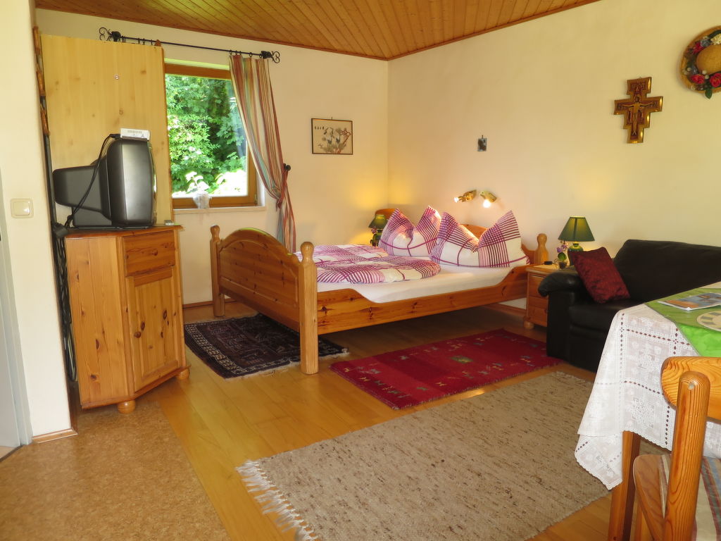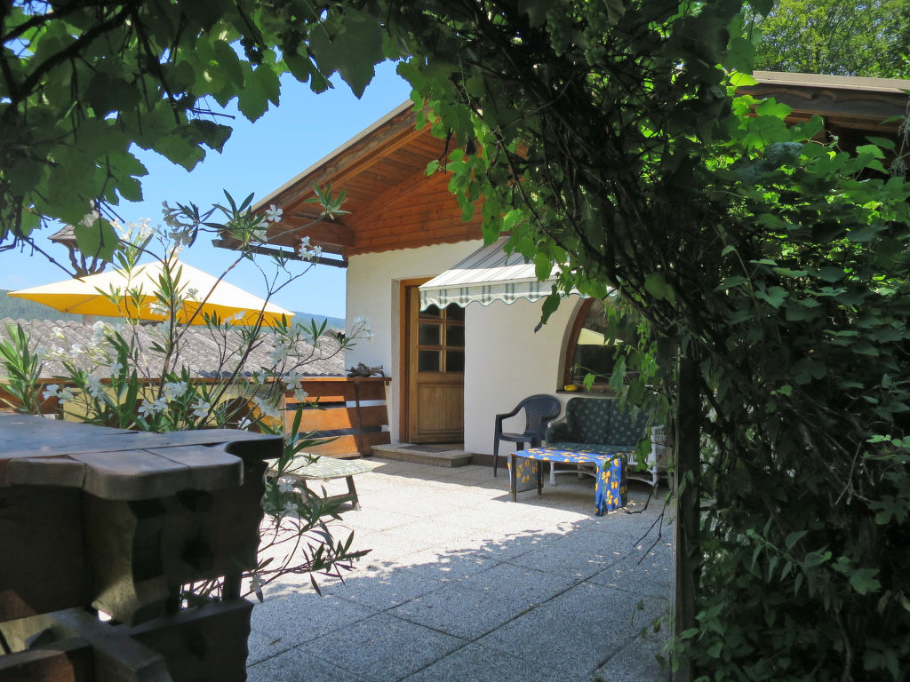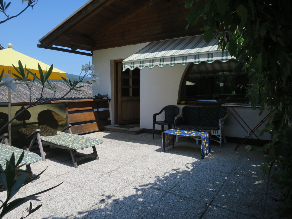 1-Zimmer-Haus, ca. 30 m². Wohn-/Schlafraum mit Doppelbett und Sitzcouch, Essplatz, Küchenzeile (2 Platten, Kühlschrank, Kaffeemaschine, Wasserkocher). Dusche/WC. Große Terrasse (ca. 25 m²) mit Sitzmöbeln, Markise, 2 Liegestühlen und Sonnenschirm.