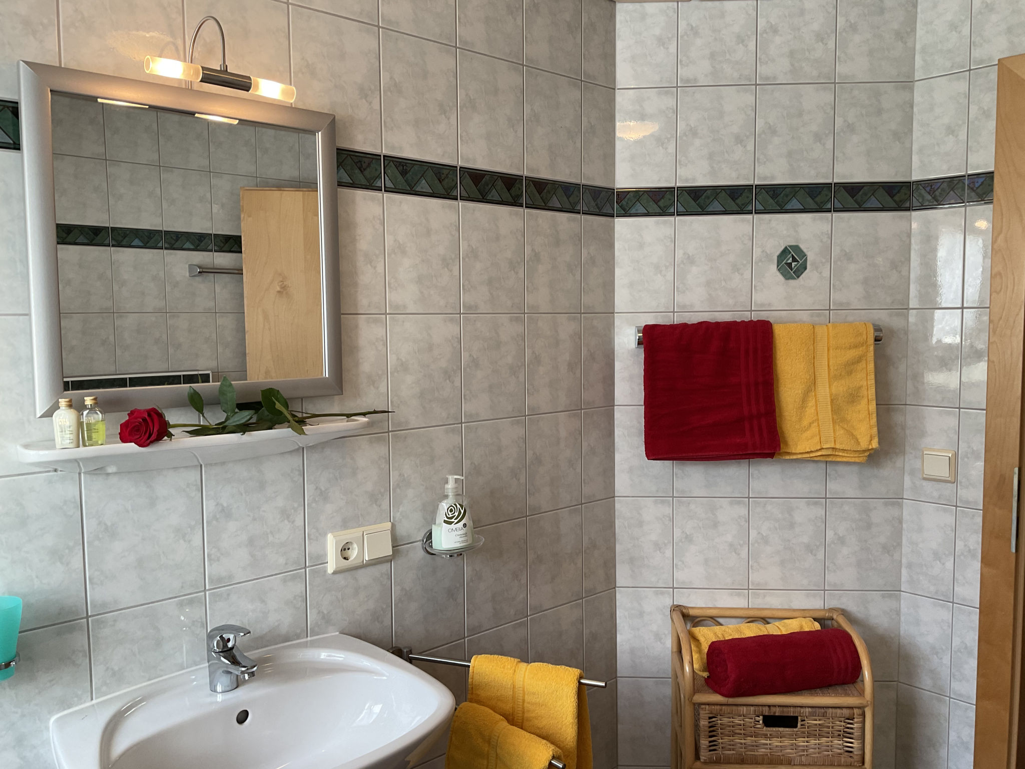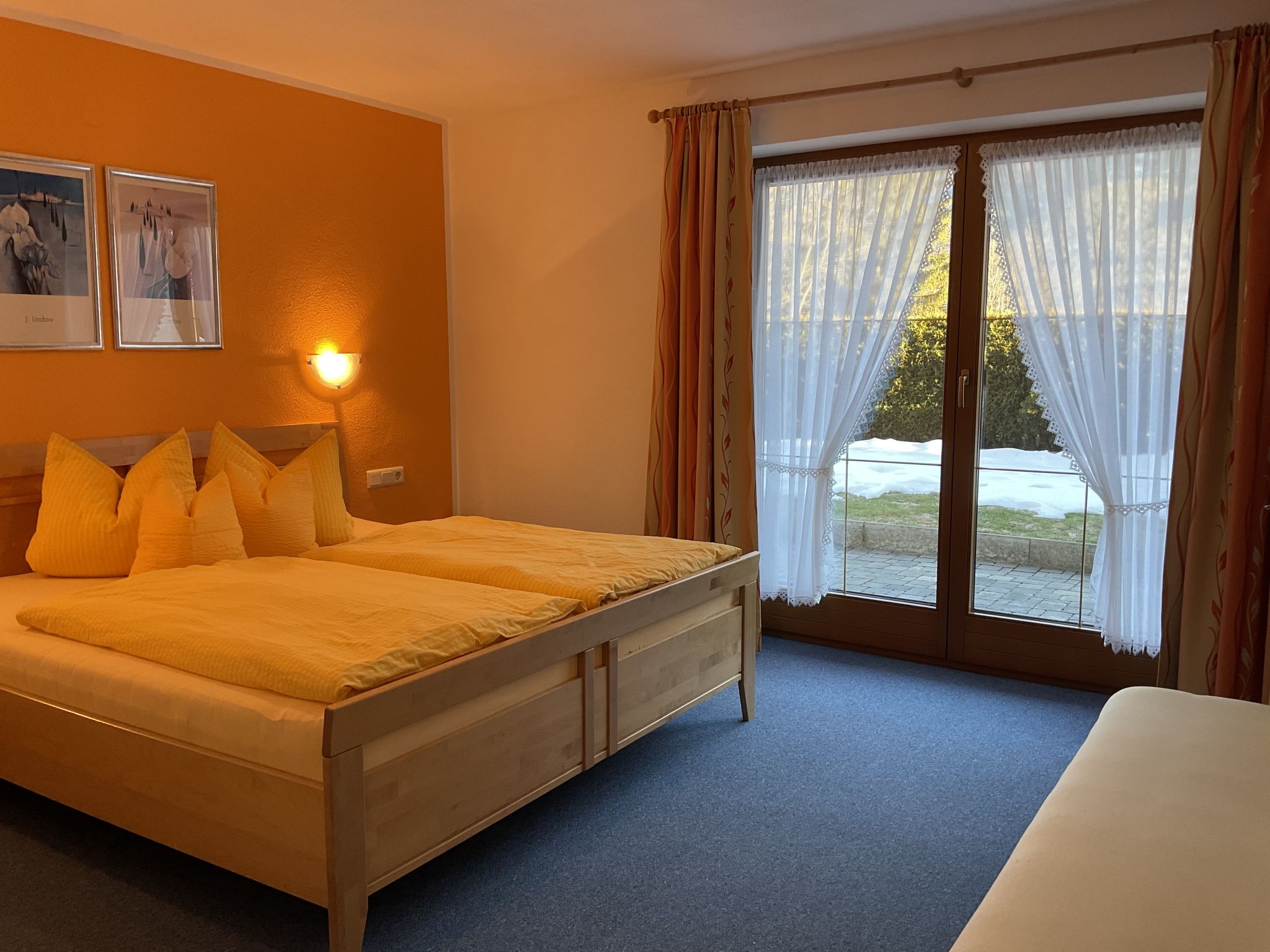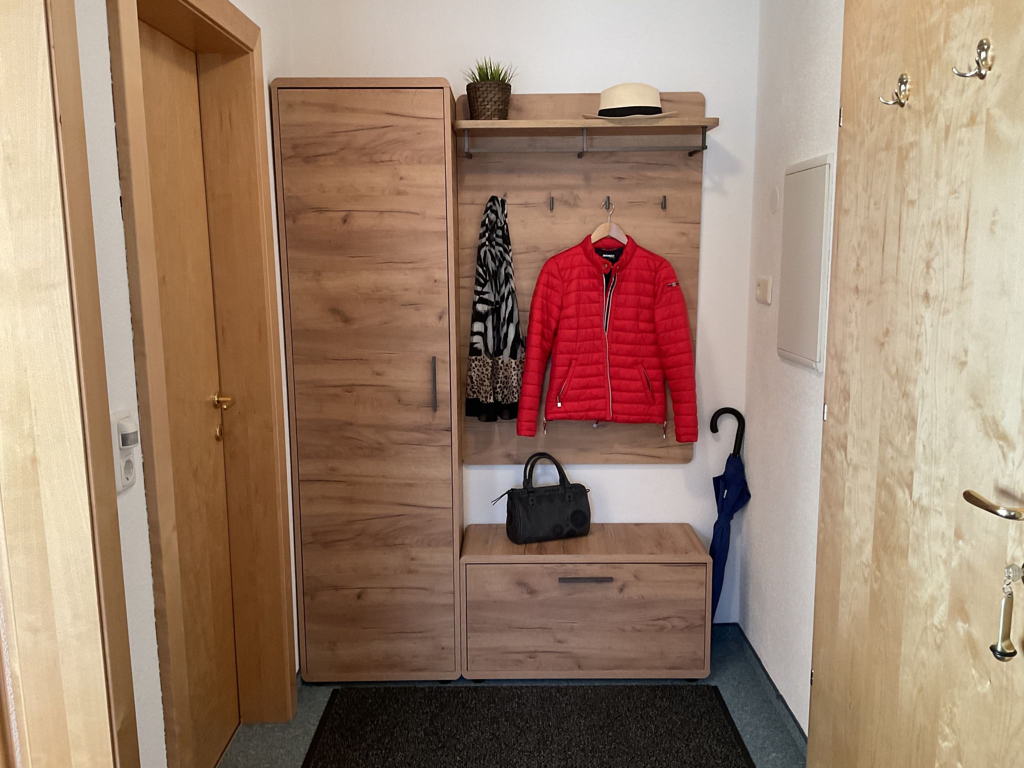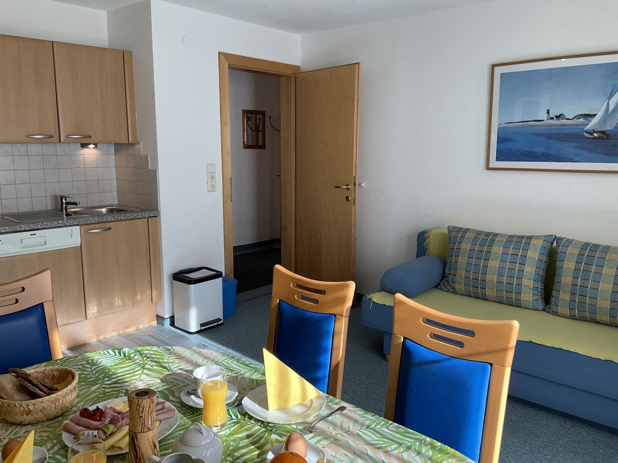 2-Zimmer-Wohnung, Erdgeschoss, ca. 42 m². Zugang über Innentreppe in Flur. Wohn-/Schlafraum mit Doppelbettcouch (1,50 m breit), Essplatz, Küchenzeile (4 Ceranfelder, Backofen, Mikrowelle, Geschirrspüler, Kühlschrank, Kaffeemaschine, Wasserkocher, Toaster) und Terrassenausgang. Schlafzimmer mit Doppelbett, Einzelbett und Terrassenausgang. Dusche/WC. Bei Belegung mit weniger Personen als der maximalen Personenzahl stehen nicht alle Wohneinheiten zur Verfügung.