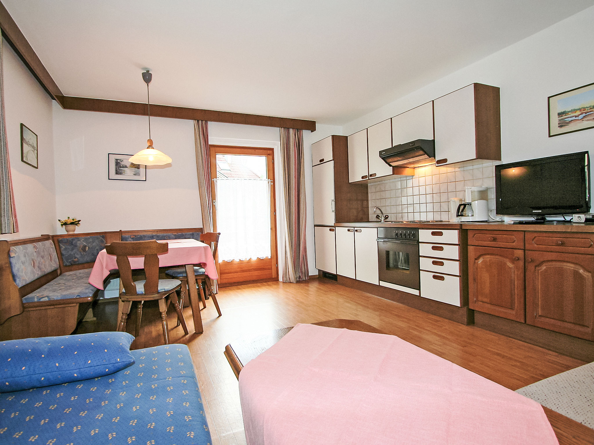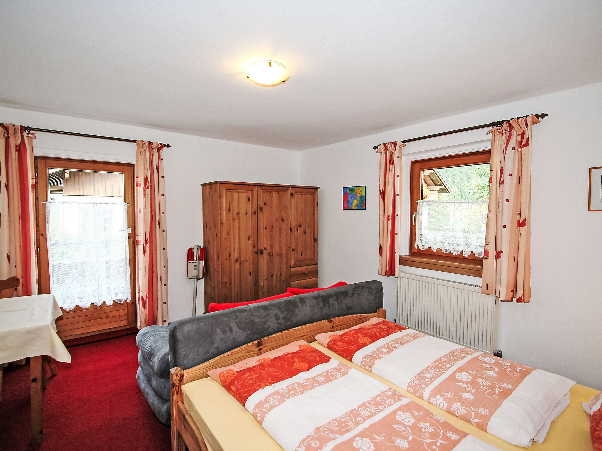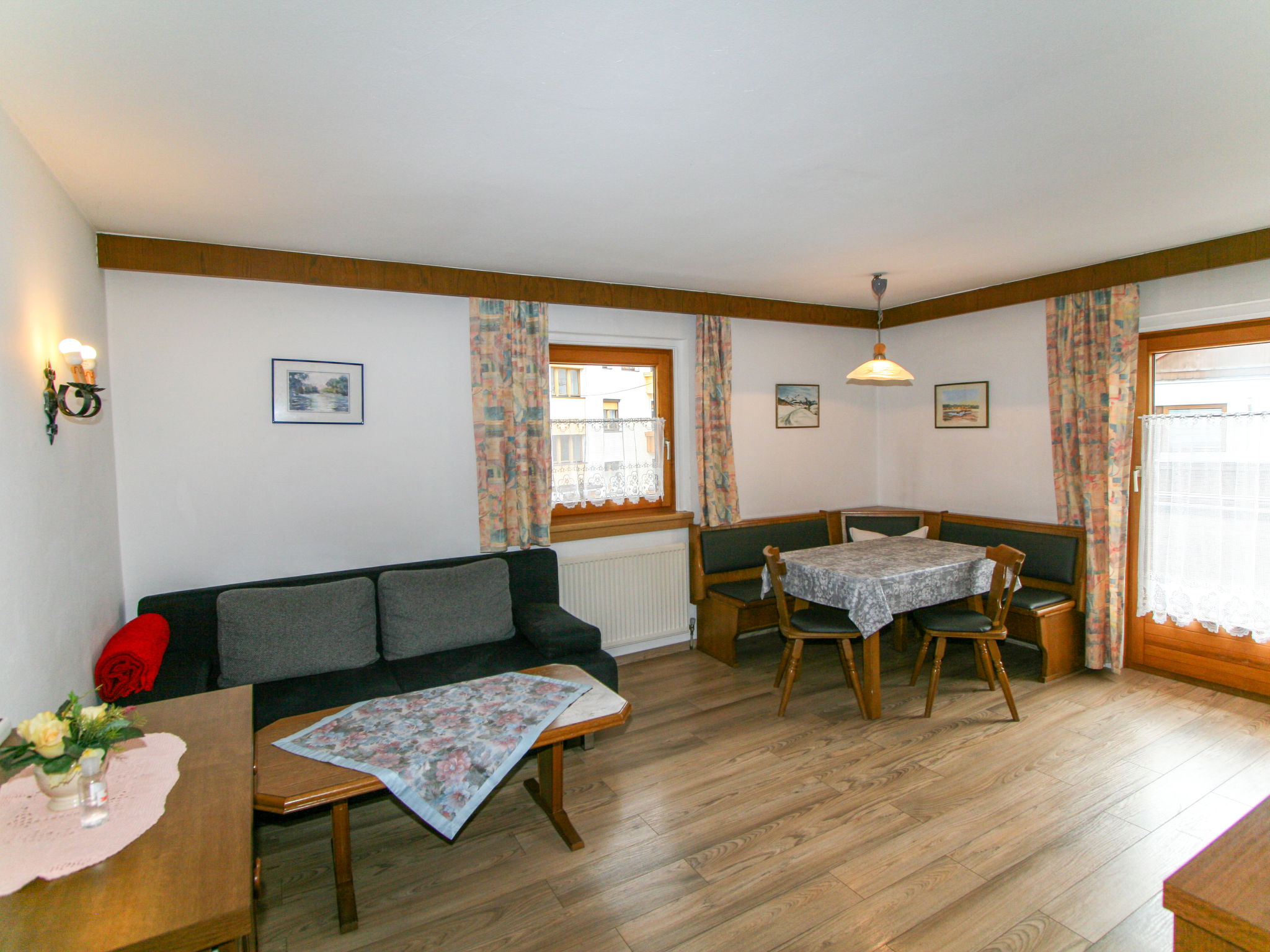 3-Zimmer-Wohnung 55 m2 im 1. Stock. Gemütlich eingerichtet: 1 Doppelzimmer. Ausgang zum Balkon. 1 Zimmer mit 1 Diwanbett und 1 Doppelbett. Ausgang zum Balkon. Wohnküche (4 Kochplatten, Backofen, Geschirrspüler, Wasserkocher, elektrische Kaffeemaschine) mit 1 Doppeldiwanbett, Essecke und Sat-TV (Flachbildschirm). Ausgang zum Balkon. Dusche, sep. WC. Balkon 10 m2. Terrassenmöbel. Schöne Sicht auf die Berge. Zur Verfügung: Internet (Wireless LAN, extra). 1 Haustier/Hund erlaubt. Aufpreis vor Ort für die 6. und 7. Person nur auf Anfrage (Zusatzbetten): Im Winter: EUR 25.00/Person/Tag. Im Sommer: EUR 15.00/Person und Tag.