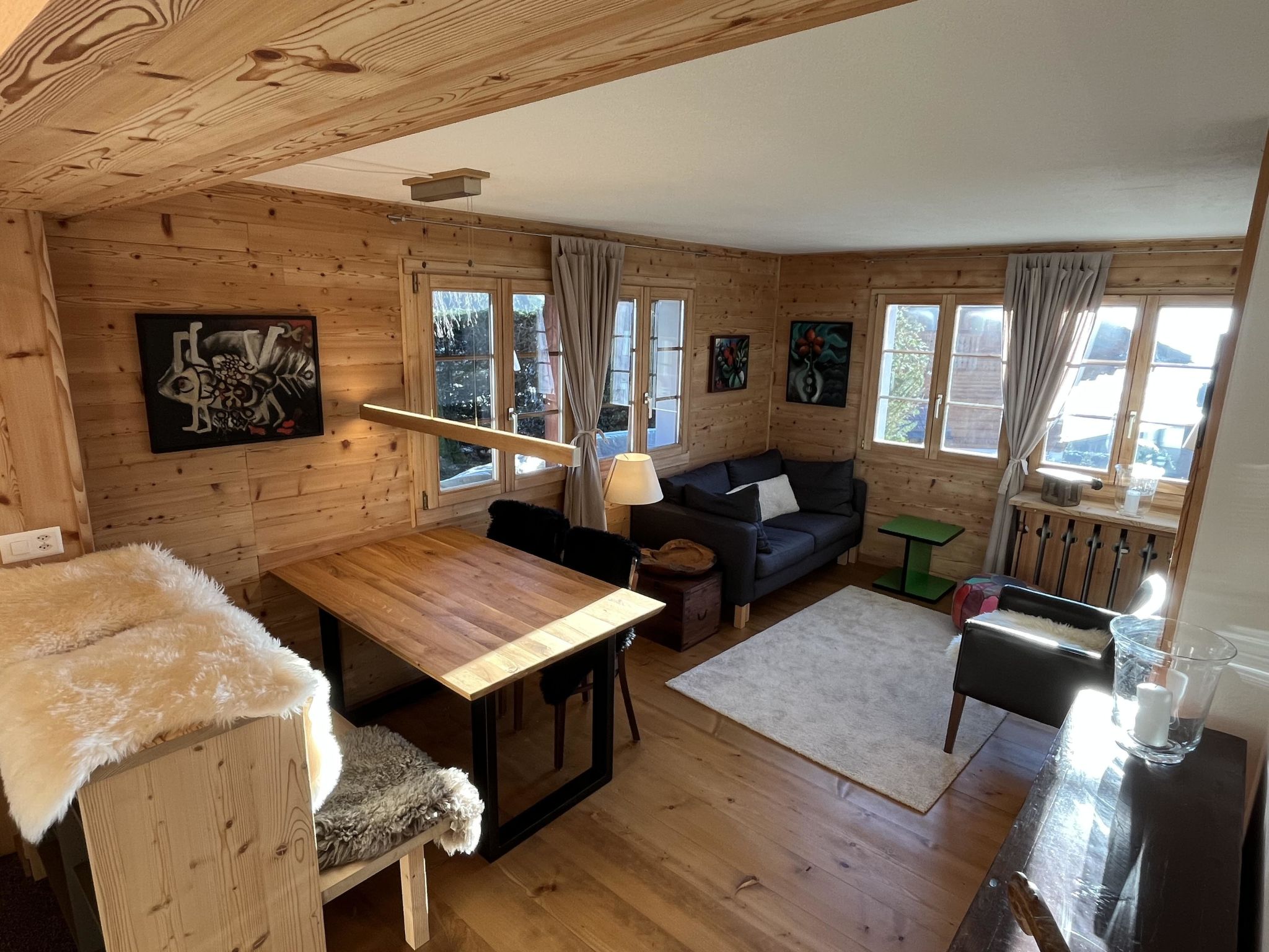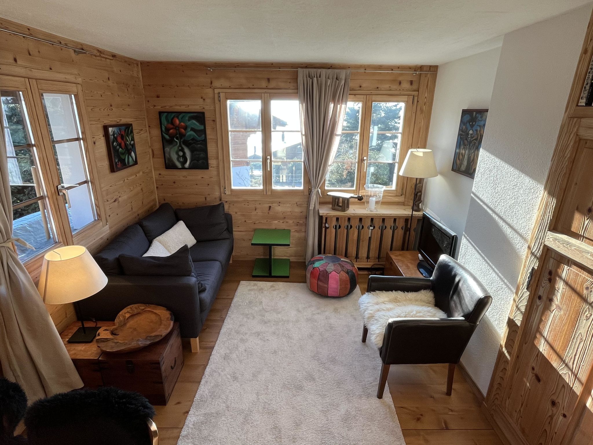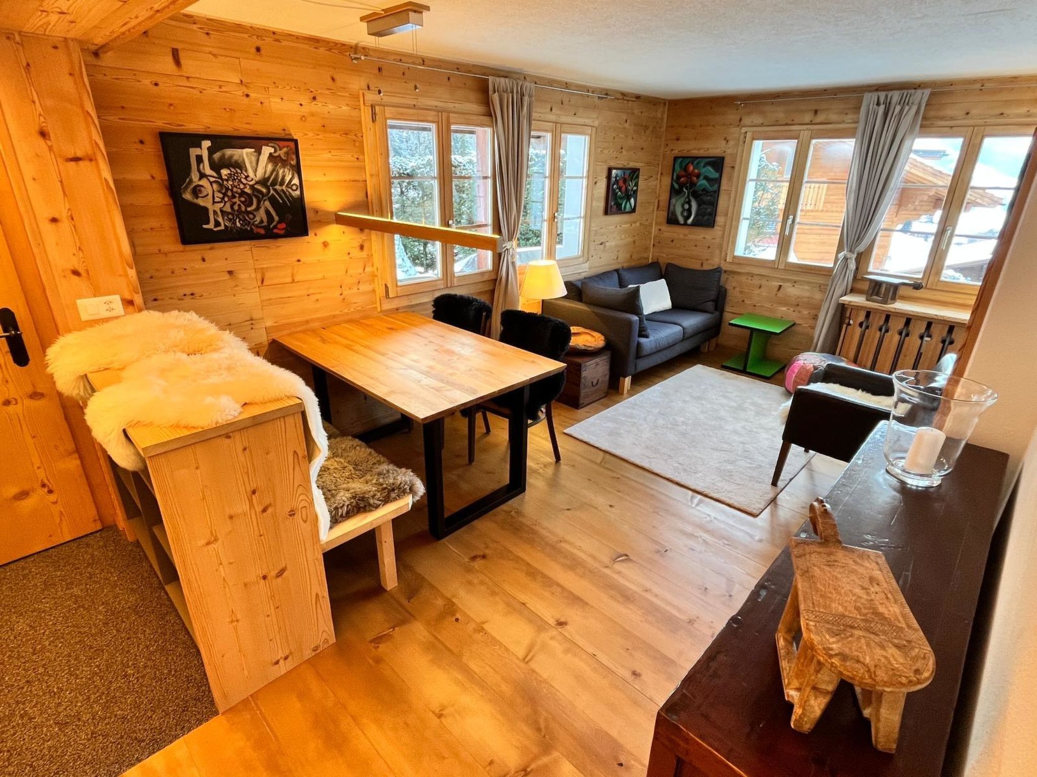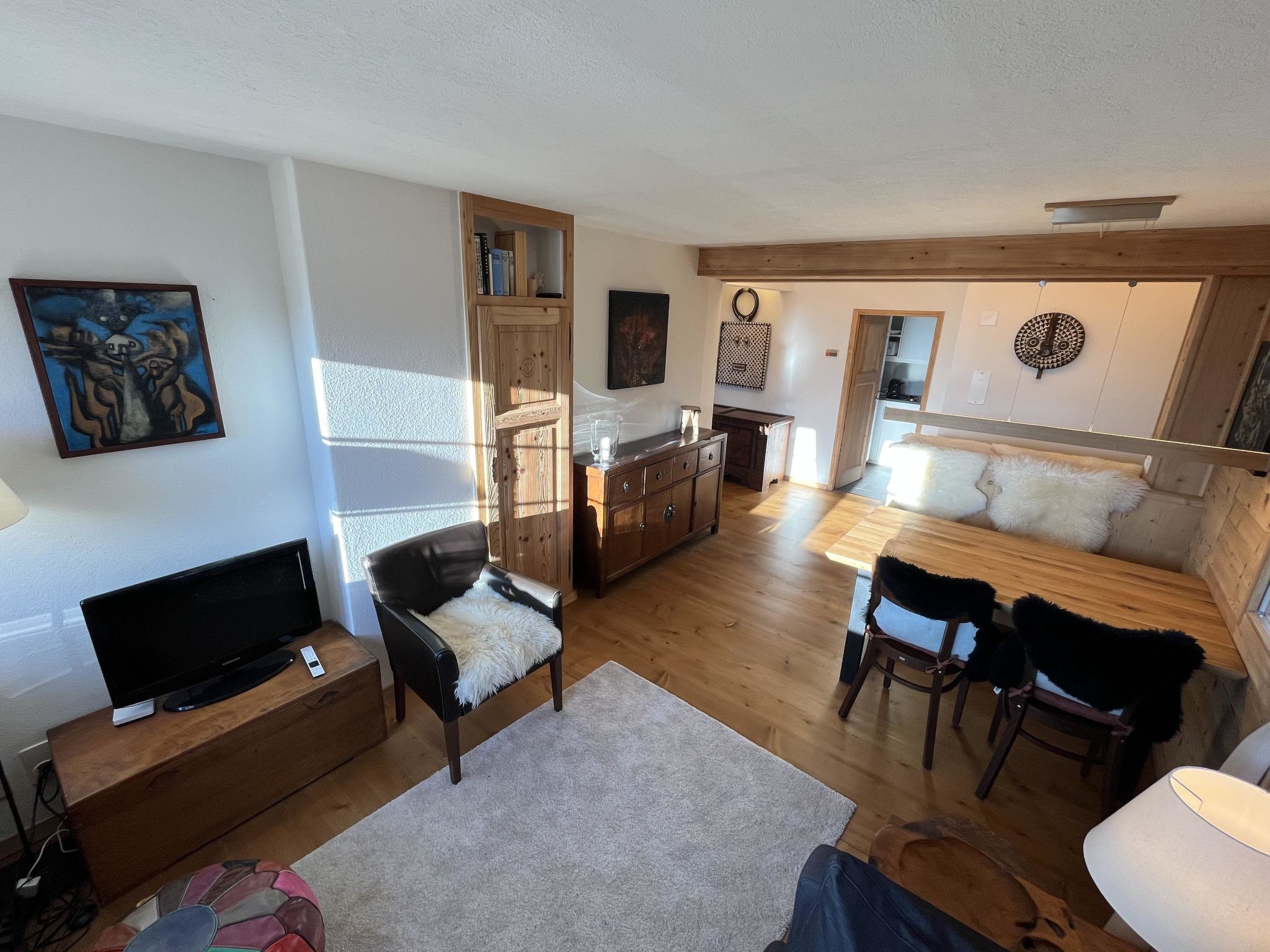 Wohn-/Esszimmer mit Sofa, Sesseln, Esstisch, Flachbildschirm-TV und WiFi. Geschlossene Küche (u. a. ausgestattet mit Kapsel-Kaffeemaschine (Nespresso), Fondue- und Raclette-Set). 1 Schlafzimmer mit Doppelbett (2x90x200cm). 1 Badezimmer mit Dusche/WC.