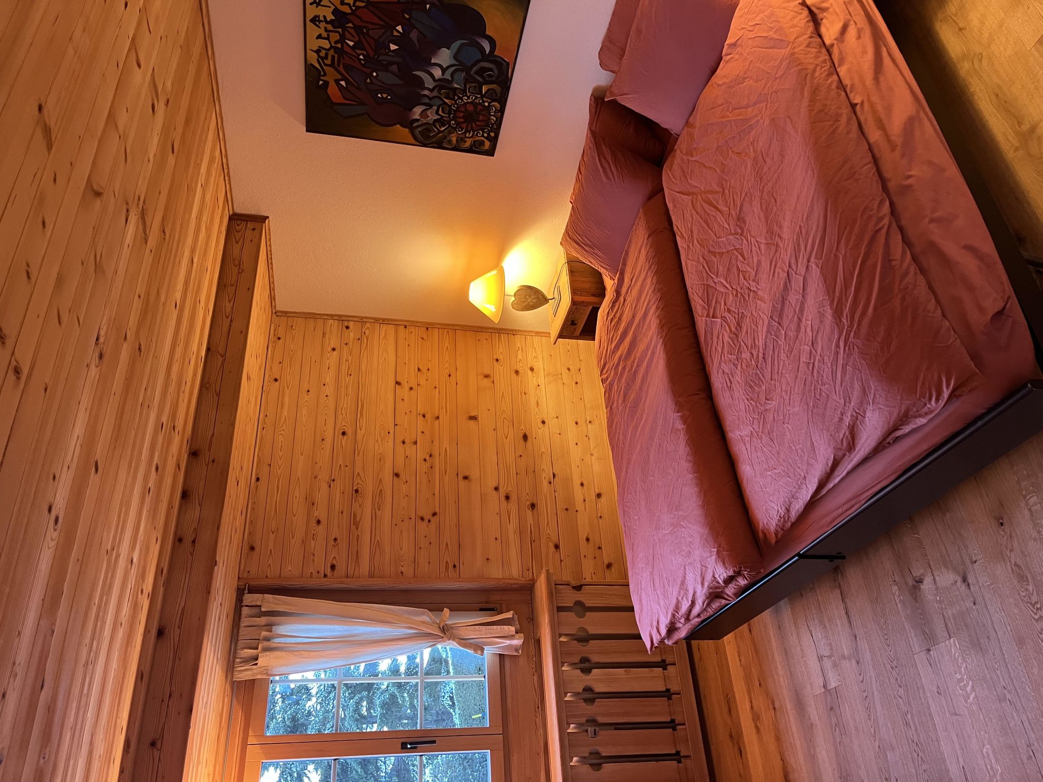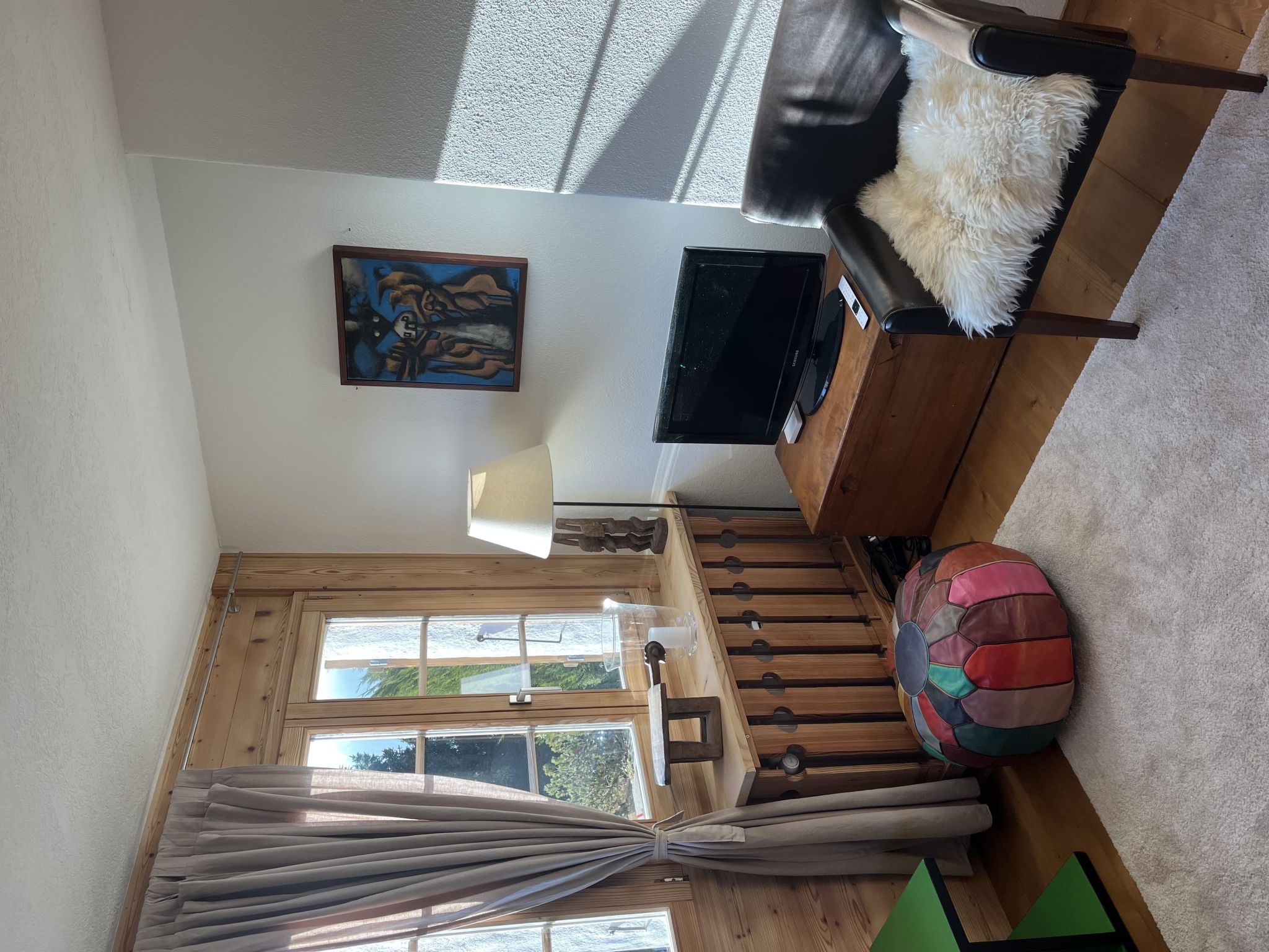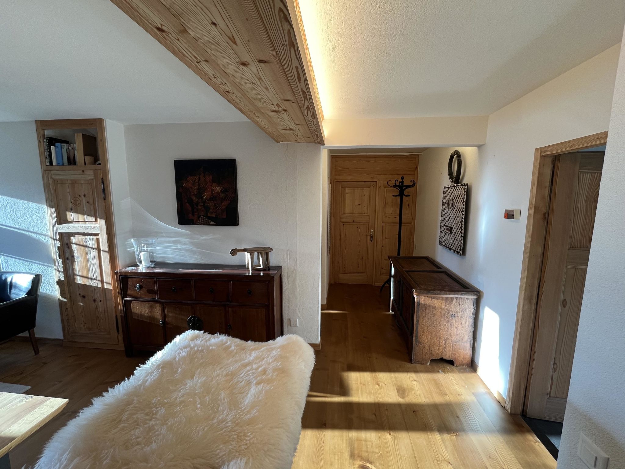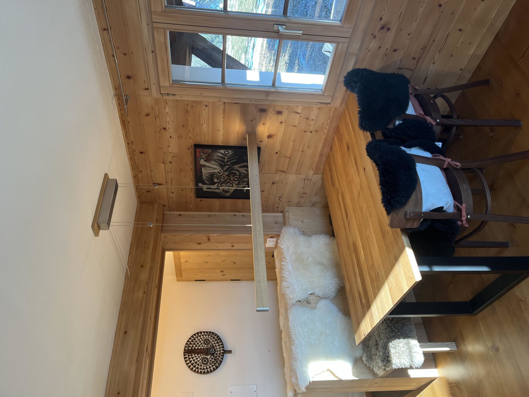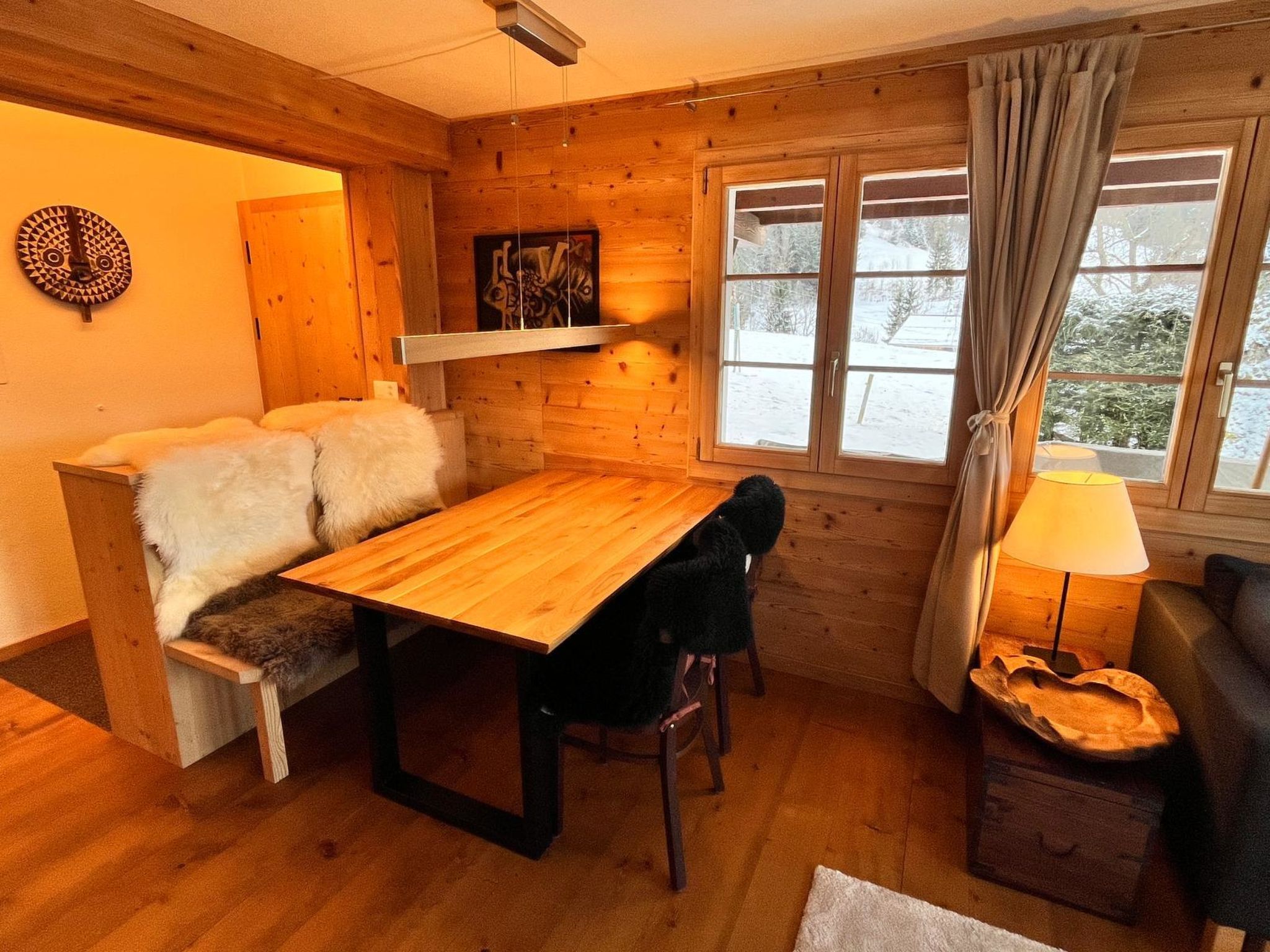Wohn-/Esszimmer mit Sofa, Sesseln, Esstisch, Flachbildschirm-TV und WiFi. Geschlossene Küche (u. a. ausgestattet mit Kapsel-Kaffeemaschine (Nespresso), Fondue- und Raclette-Set). 1 Schlafzimmer mit Doppelbett (2x90x200cm). 1 Badezimmer mit Dusche/WC.
